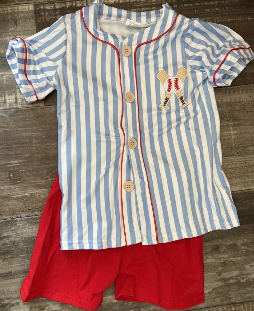 ✨Smoke and pet free home ⚡️Fast shipping 🌟Brand new (I own a boutique. I took this out of the original packaging for photos only). This 2 piece boy's outfit is perfect for any young baseball fan. The set includes a blue and white striped shirt with embroidered baseball motifs, along with matching red shorts. Ideal for summer, fall, or spring, this outfit is both stylish and functional, making it a great choice for active little boys who love the sport of baseball. Perfect for casual wear or as a sporty ensemble for a day at the ballpark, this outfit is sure to delight any young boy with a passion for the game.