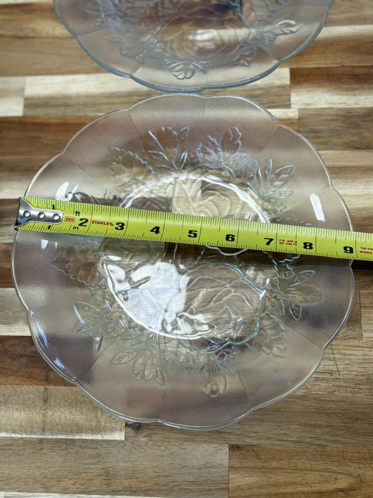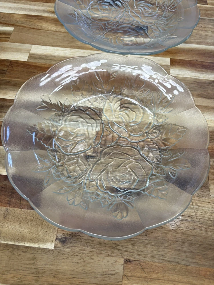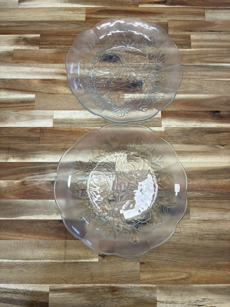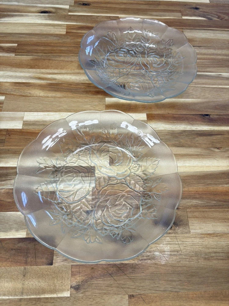 The gorgeous rose detail in this plate is a must have. This is a set of two, roughly 9 inches across and 1-1/2” tall. These plates are good for any occasion or even to use as a decoration around your home. These pieces are vintage and preowned so please look at all pictures as they are part of the detail. If you have any questions, please do not hesitate to message me Thank you for stopping by