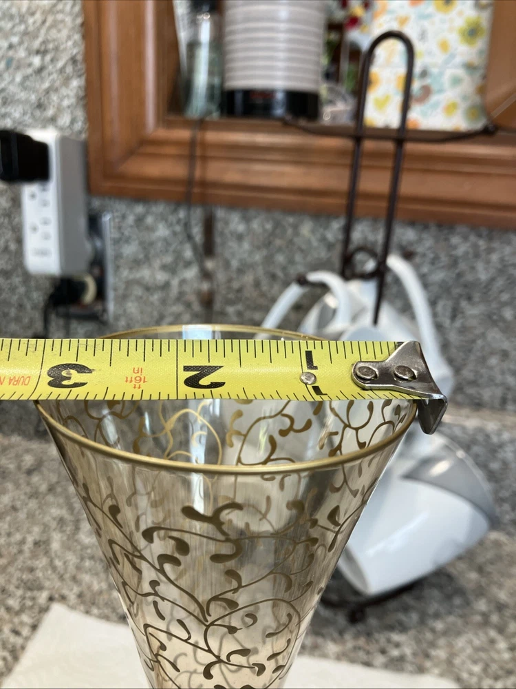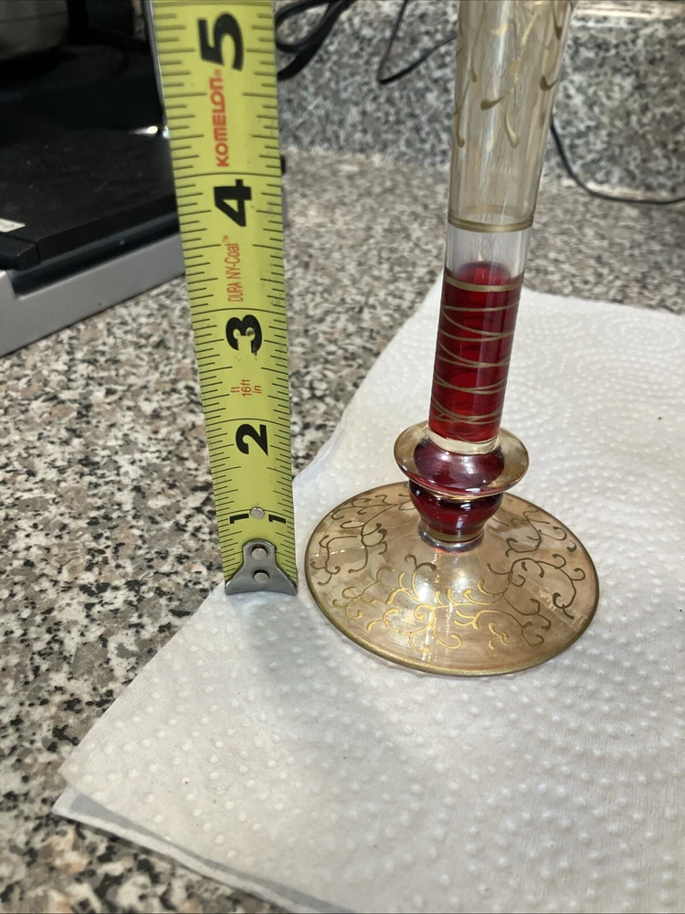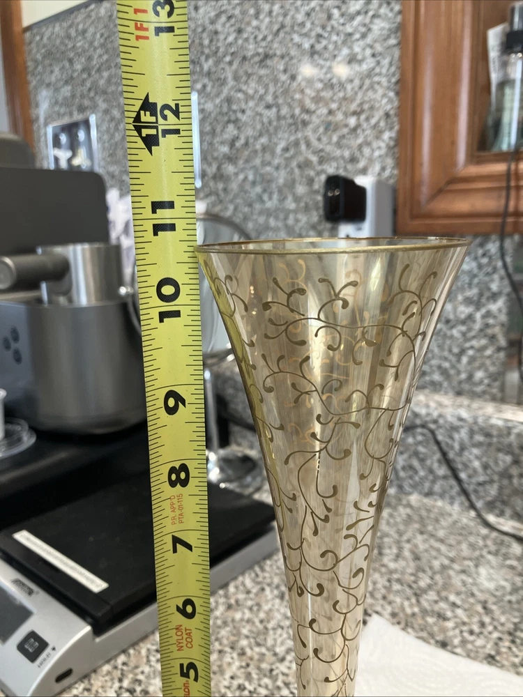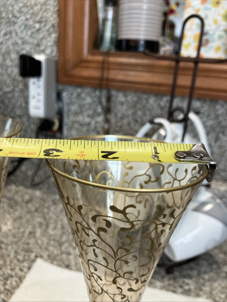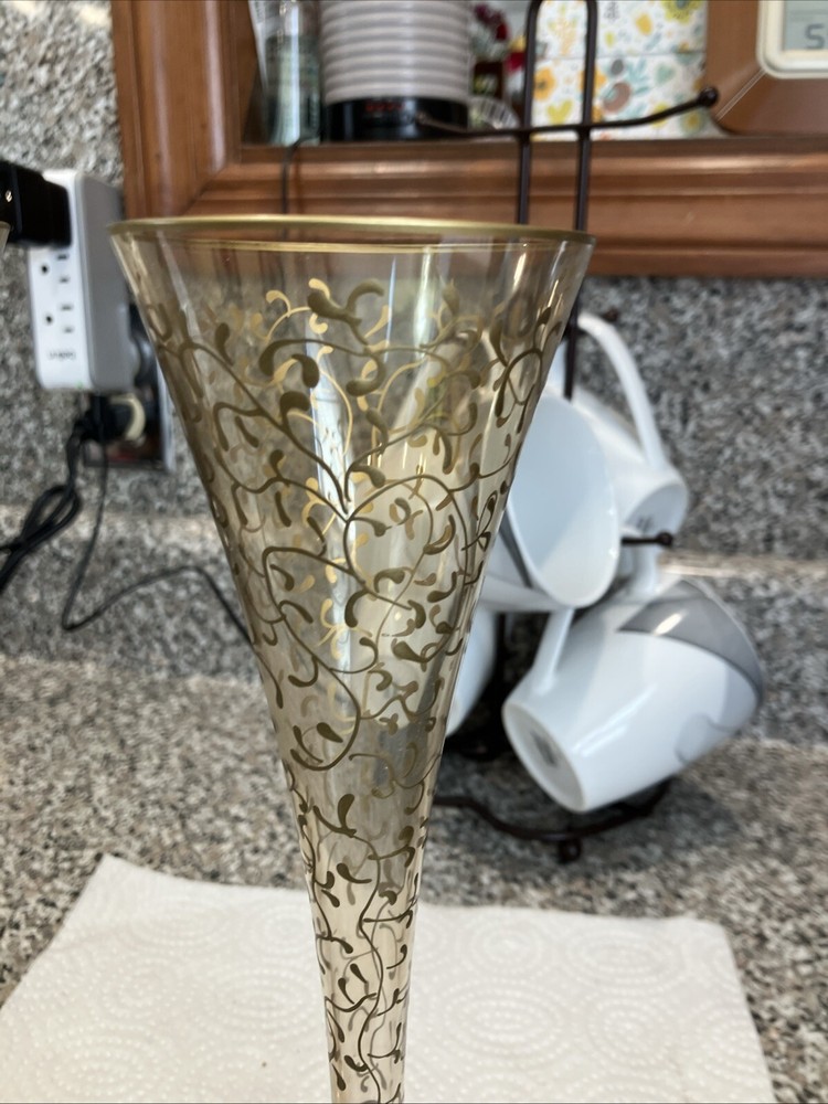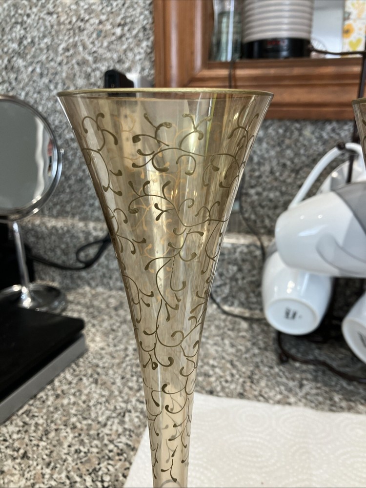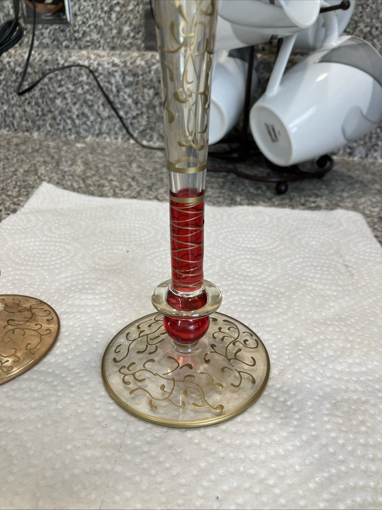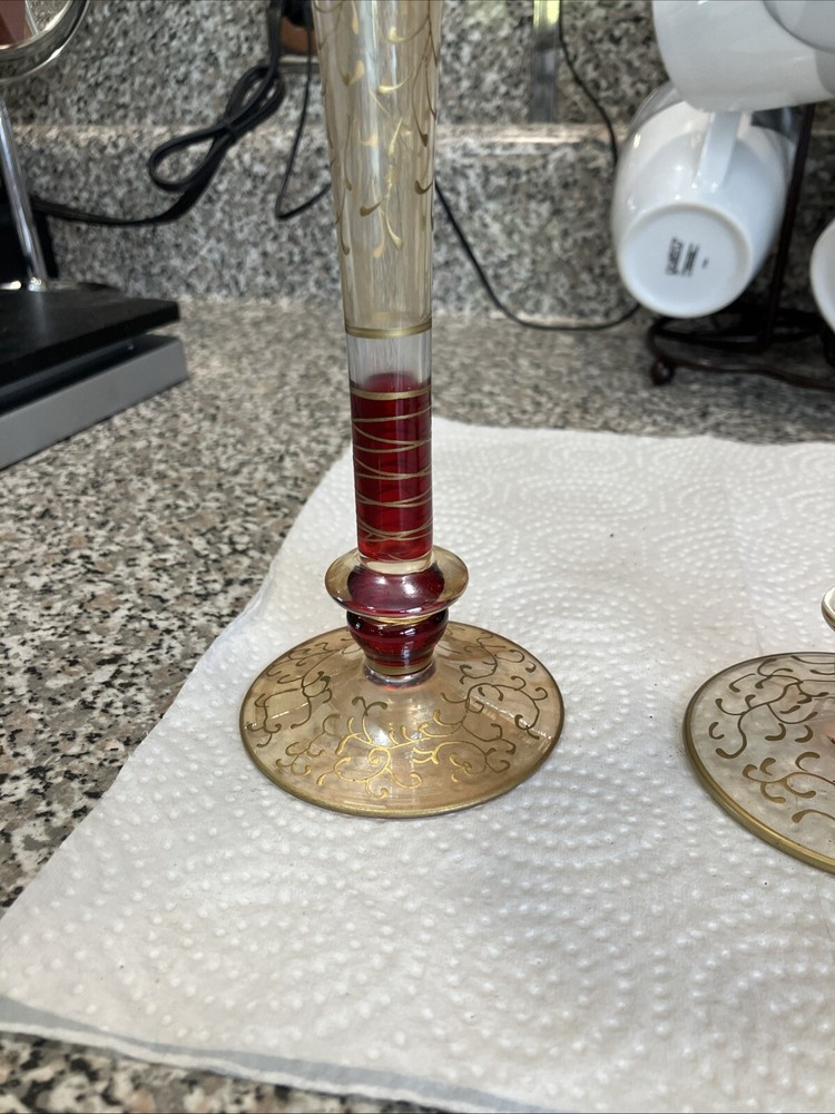 2 Pier 1 Champagne Flutes. Red Stem Gold Hand Painted Scrolls. Stunning In EC. Condition is Used. Shipped with USPS Ground Advantage.