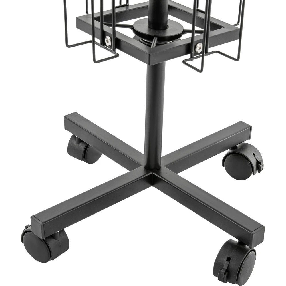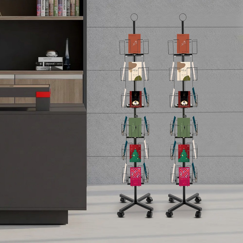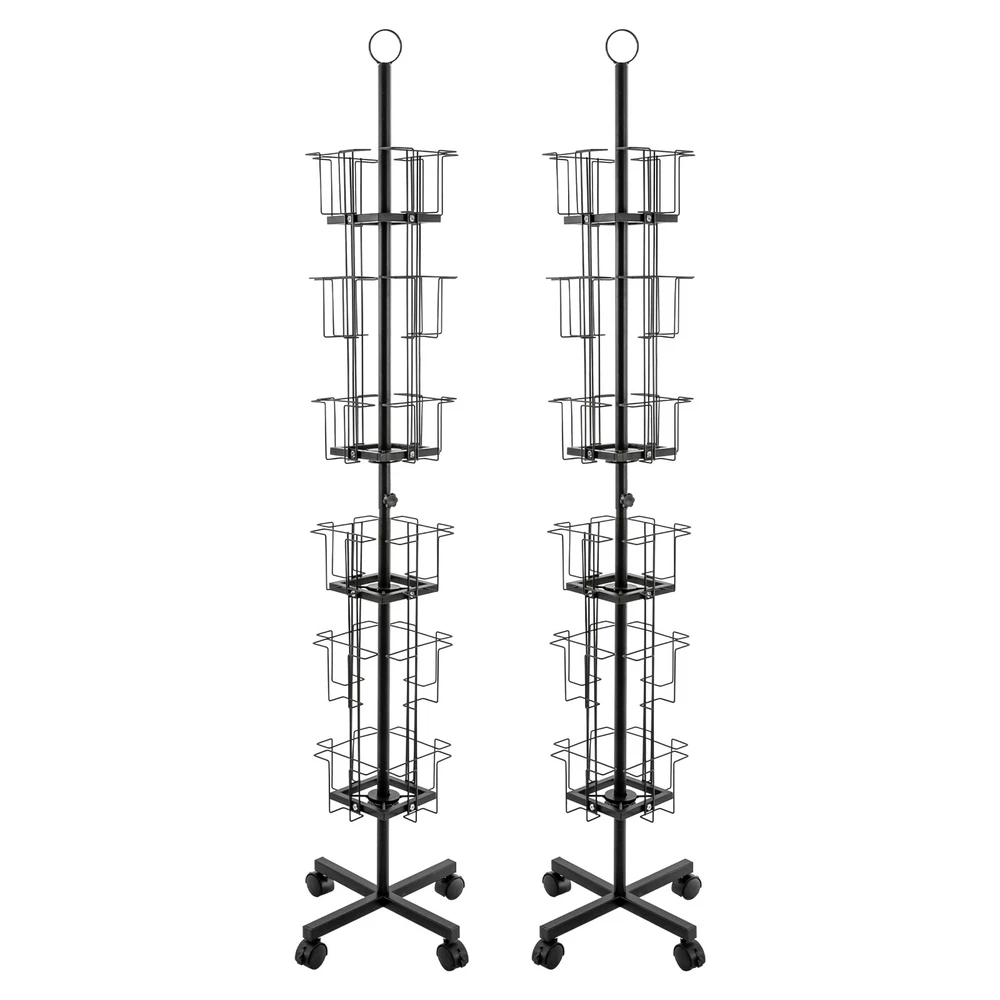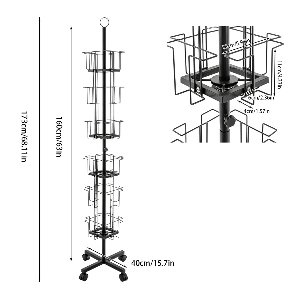 Each Cross Bar Length: 0.4m/1.31ft Rotation Angle: 360° Surface Treatment: Spraying Center Height: 1.6m/5.25ft Brand: Unbranded UPC: Does not apply Assembly Required: Yes Color: Black Material: Iron Mount Type: Free Standing Storable Maximum Card Size: 12.7*17.78cm/5*7in Overall Height: 1.73m/5.68ft Each Pocket Bottom Size(L*W): 6*4cm/2.36*1.57in Wheel Type: 4 Universal Wheels Each Rack(All with Brakes) Number of Items: 2 Each Pocket Size(L*H): 15*11cm/5.91*4.33in Number of Pockets: 24 gtin13: Does not apply