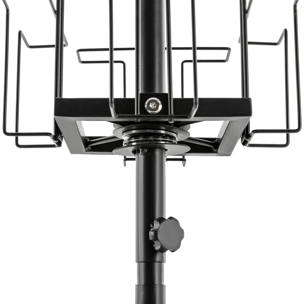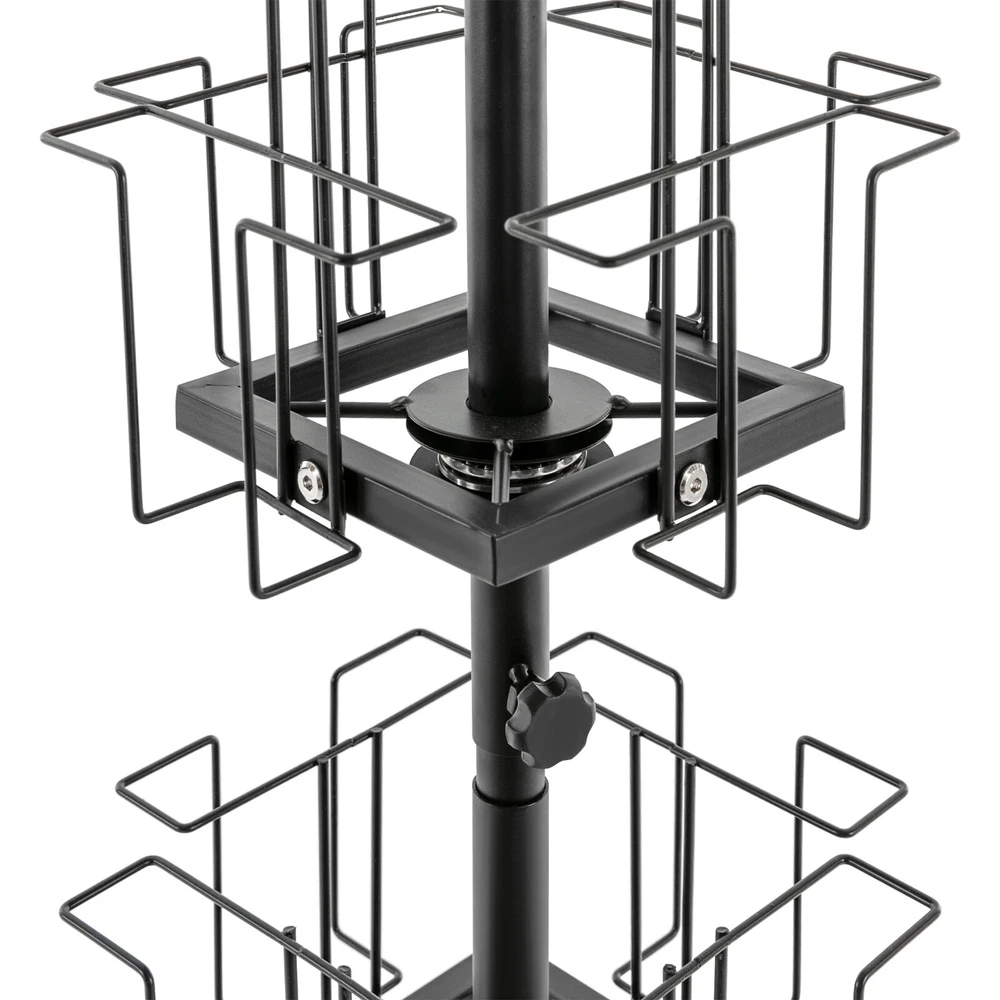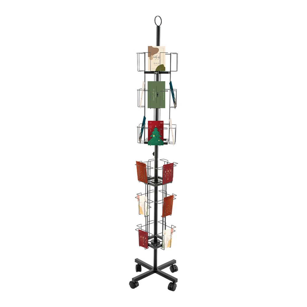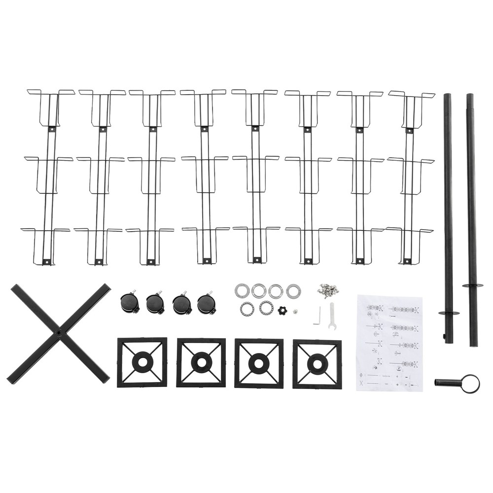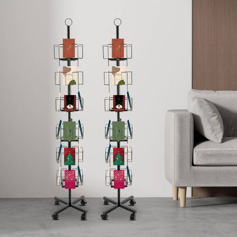 Each Cross Bar Length: 0.4m/1.31ft Rotation Angle: 360° Surface Treatment: Spraying Center Height: 1.6m/5.25ft Brand: Unbranded UPC: Does not apply Assembly Required: Yes Color: Black Material: Iron Mount Type: Free Standing Storable Maximum Card Size: 12.7*17.78cm/5*7in Overall Height: 1.73m/5.68ft Each Pocket Bottom Size(L*W): 6*4cm/2.36*1.57in Wheel Type: 4 Universal Wheels Each Rack(All with Brakes) Number of Items: 2 Each Pocket Size(L*H): 15*11cm/5.91*4.33in Number of Pockets: 24 gtin13: Does not apply