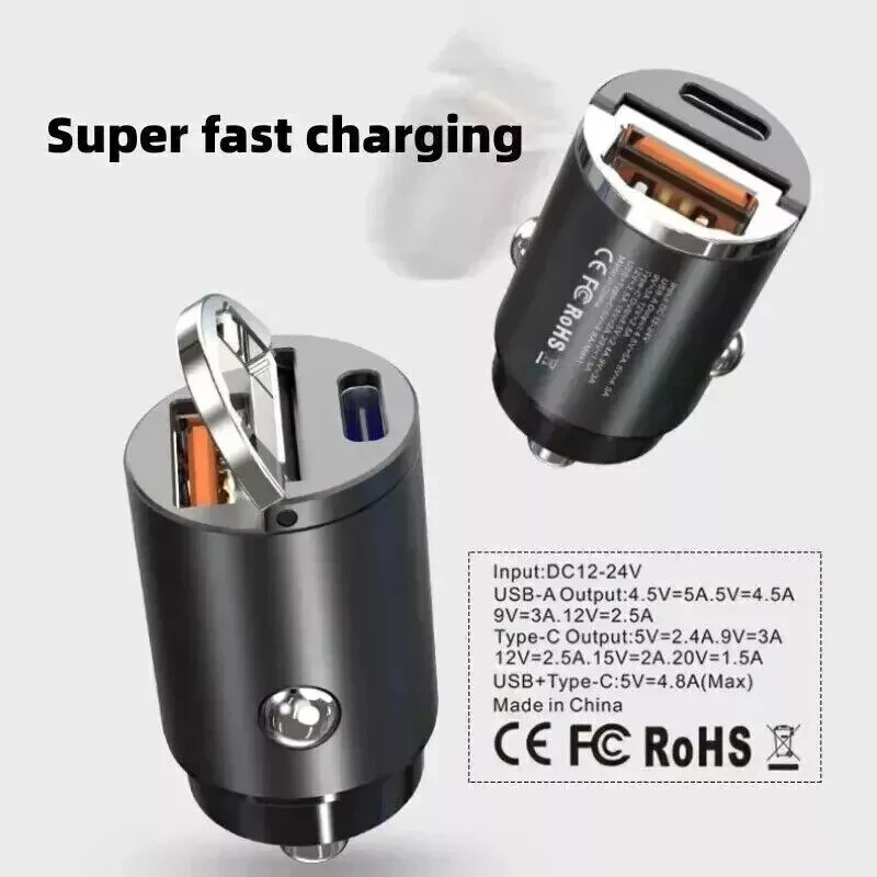 Hidden QC 3.0 PD Pull Ring 30W Input voltage: 12V-24V (general for truck and cargo) Type-C1 output: 4.5V/5A, 5V/4.5A, 9V/3A, 12V/2.5A Type-C2 output: 5V/2.4A, 9V/3A, 12V/2.5A, 15V/2A, 20V/1.5A Material: zinc alloy Weight: 22.6g Size: 39.8 * 20.7mm Compatibility protocol: PPS/PD3.0/PD2.0/QC4.0+/QC3.0/QC2.0/AFC/FCP/PE2.0/ PE1.1/SFCP/Apple 2.4A and other fast charging and transmission