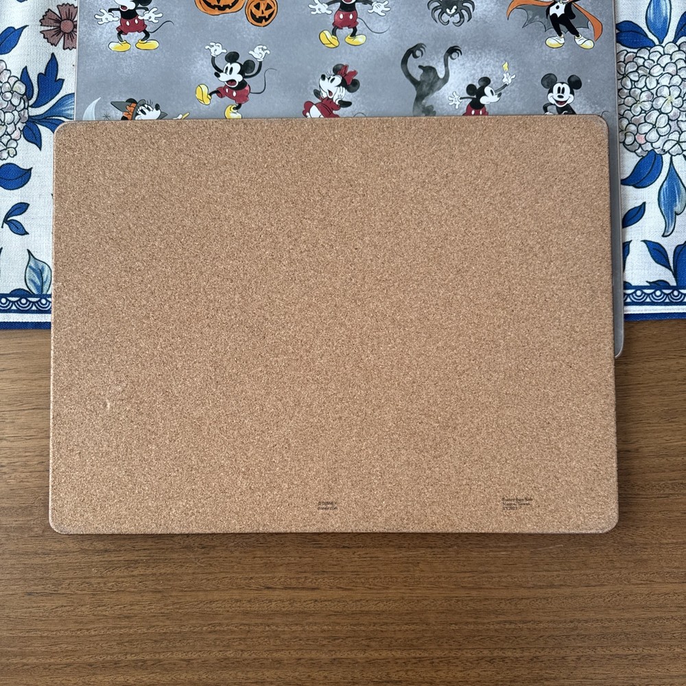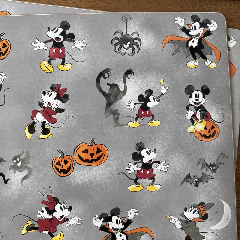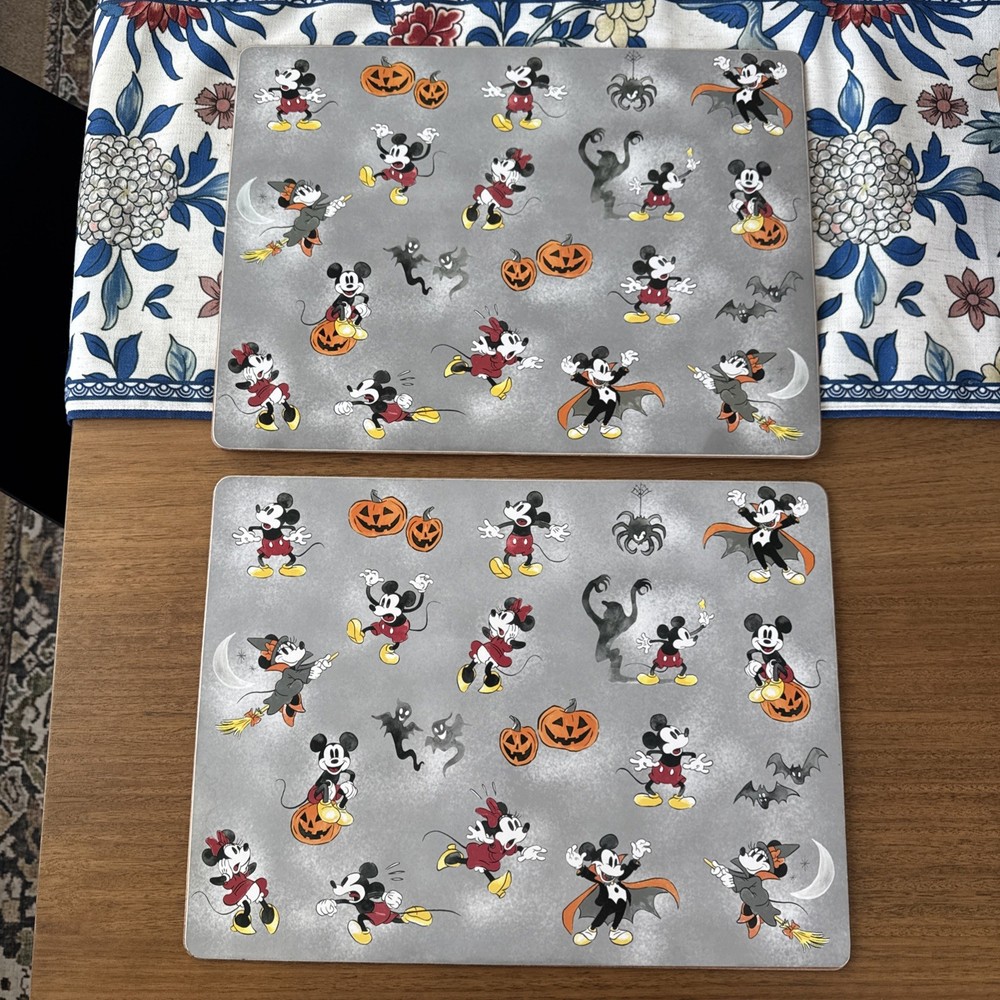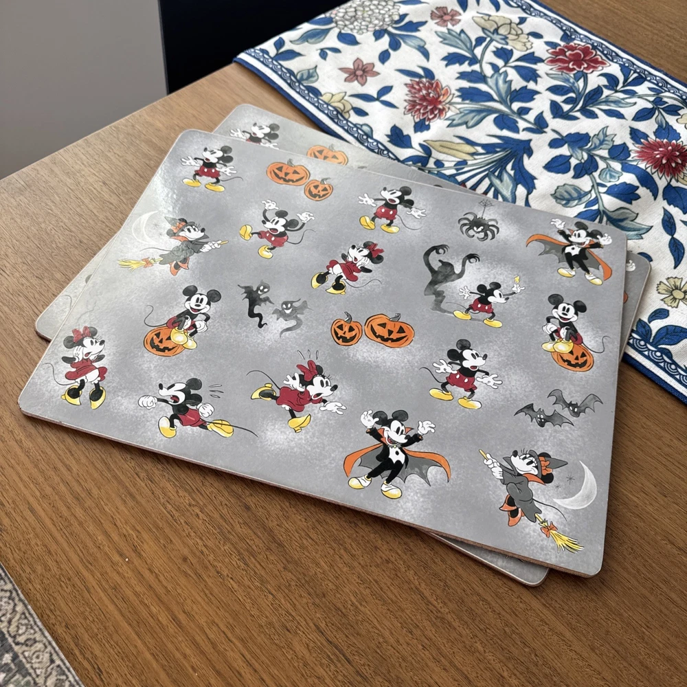 The 2 Pottery Barn Kids Disney Cork Backed Mickey / Minnie Mouse Halloween Placemats are a charming addition to any Halloween-themed dining set. Featuring a rectangular shape and a gray color with Mickey and Minnie Mouse characters, these placemats are not only functional but also add a touch of whimsy to your table setting. Crafted from cork material, they are easy to clean with hand wash only care instructions. Perfect for celebrating Halloween, these placemats are sure to delight both kids and adults alike.
