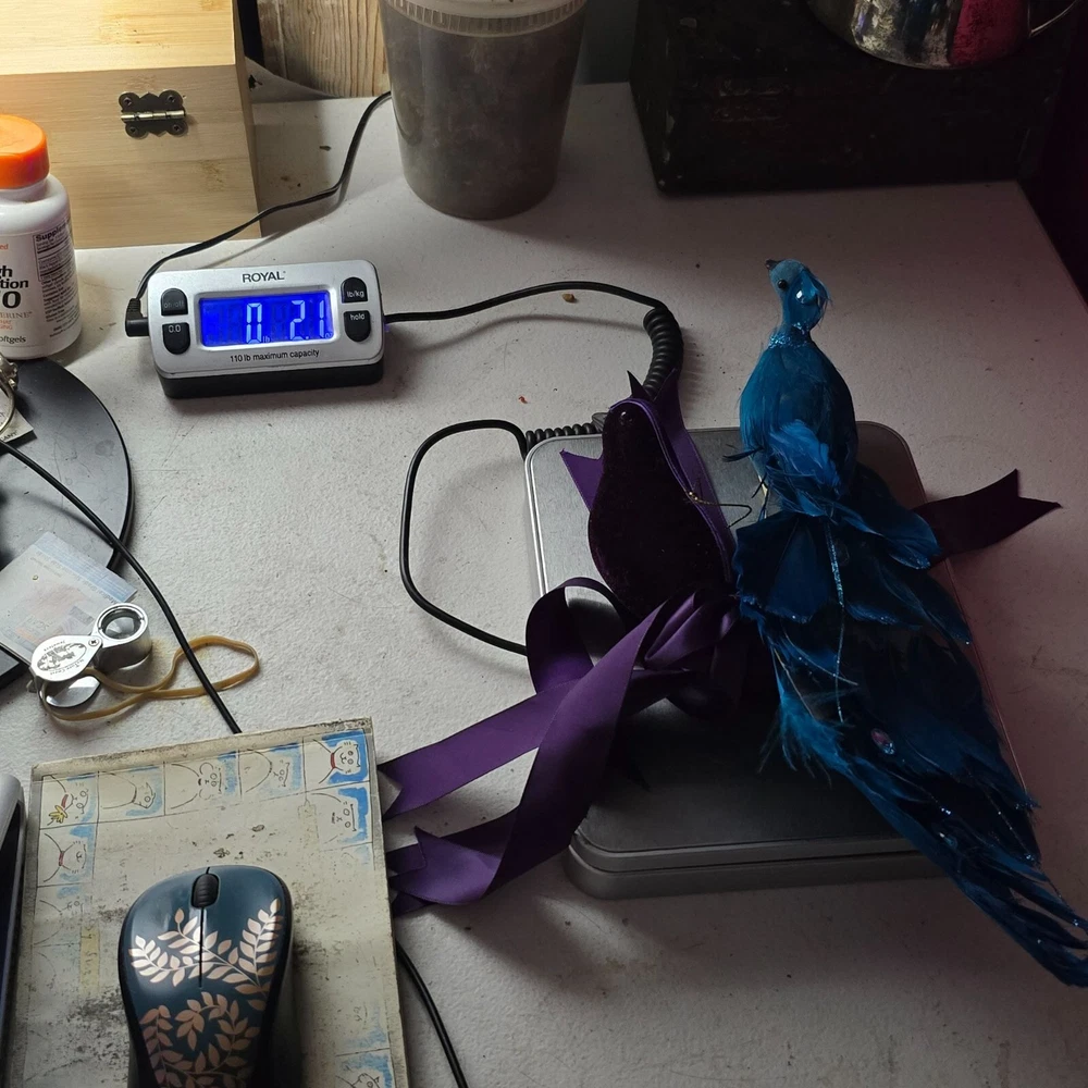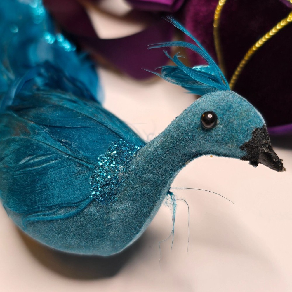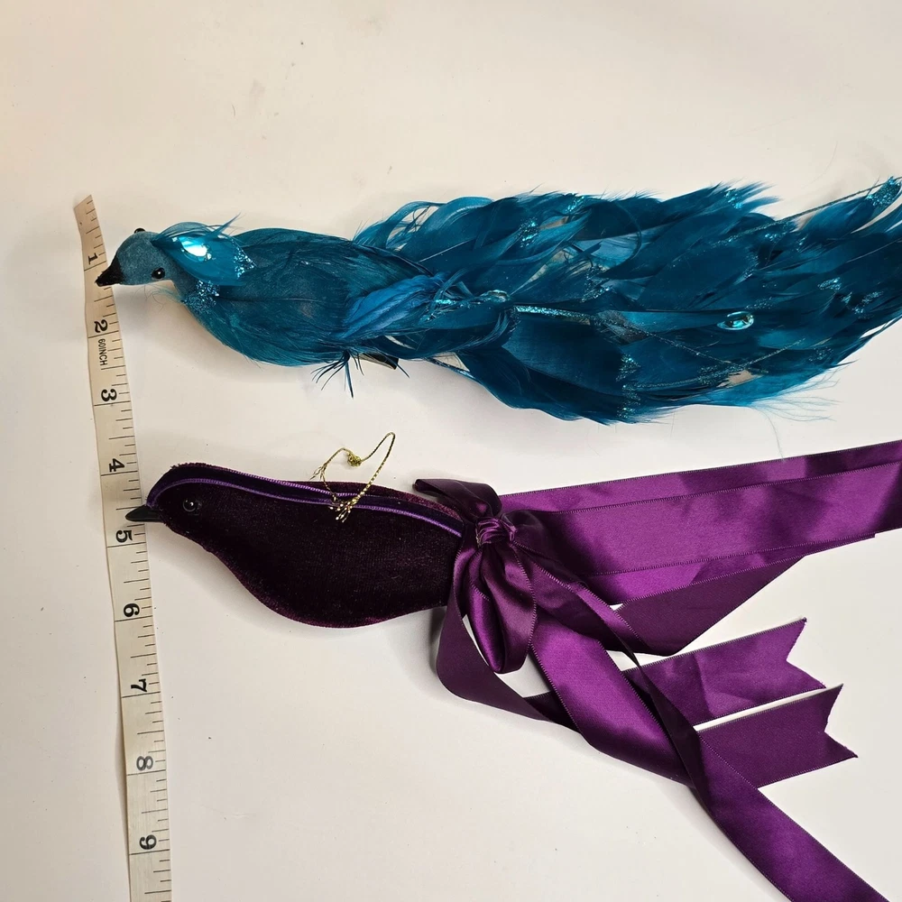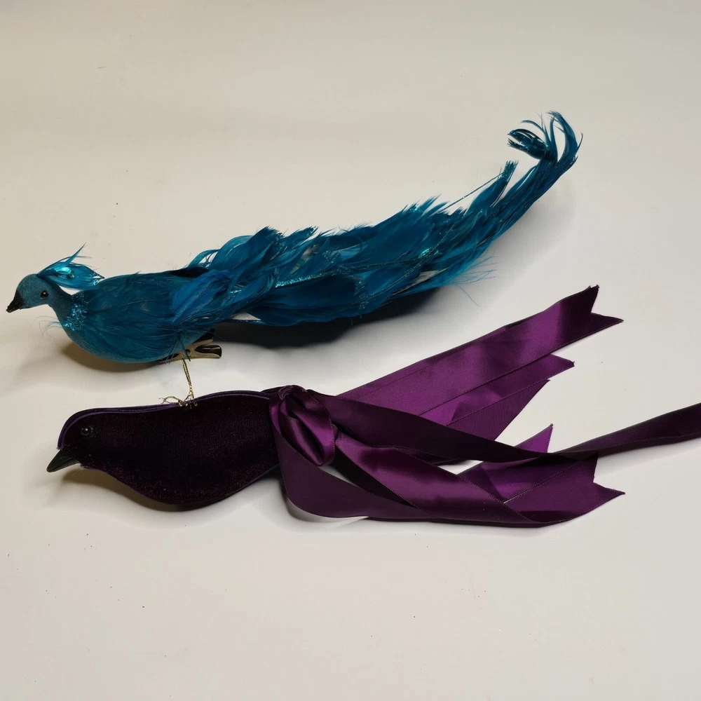 Enhance your home decor with these elegant bird ornaments. Featuring a teal peacock adorned with feathers and glitter, and a purple velvet bird with a satin ribbon, they provide a sophisticated touch to any setting. Ideal for display on mantels, shelves, or as part of a festive arrangement. • Teal glitter accents • Satin ribbon ties • Velvet fabric detail • Lightweight design Features: • Decorative Bird Ornaments, Christmas Birds Size: Approx 12" Condition: Pre-Owned Good Good Condition Gently Used No Clips Please be sure review all photos and description closely before purchasing, thank you! Smoke free work space Please read the description for further details and measurements, Thank you!