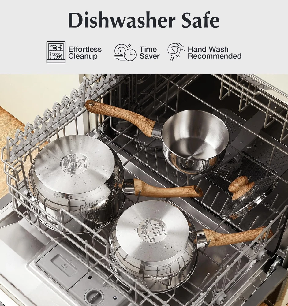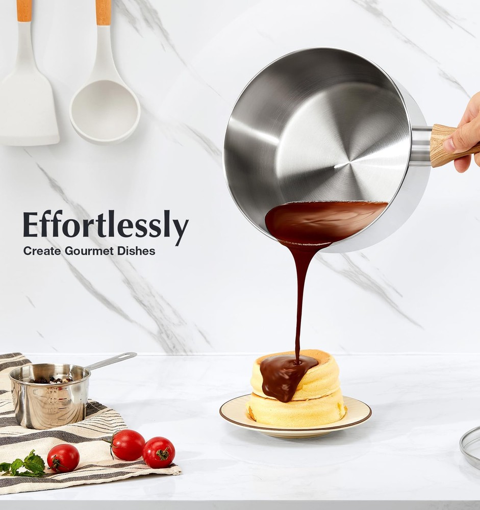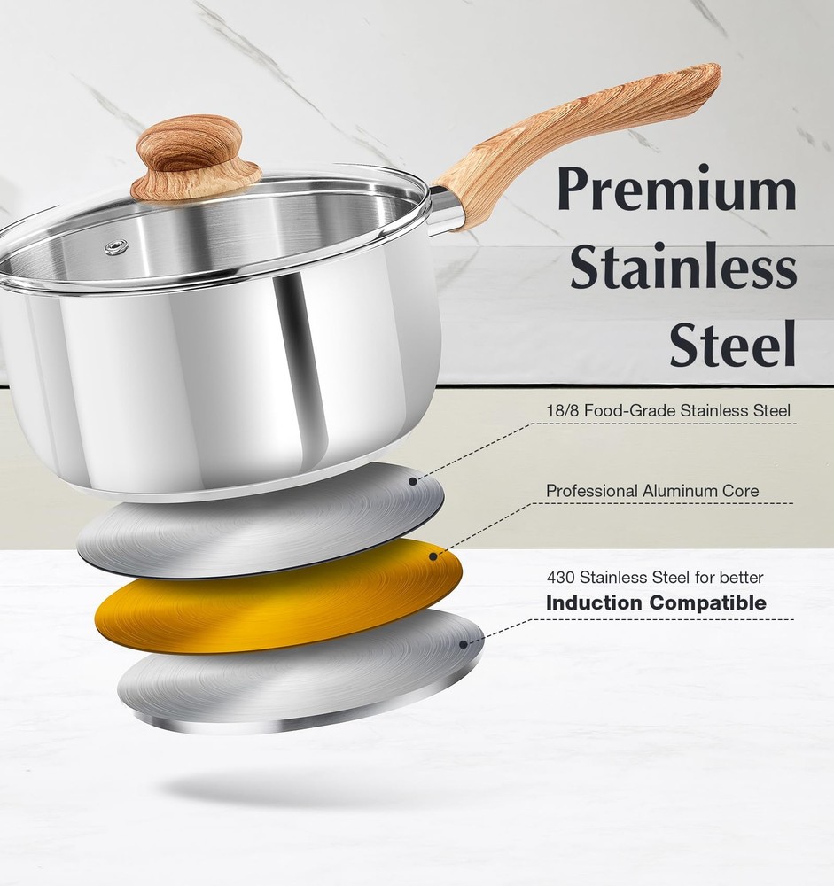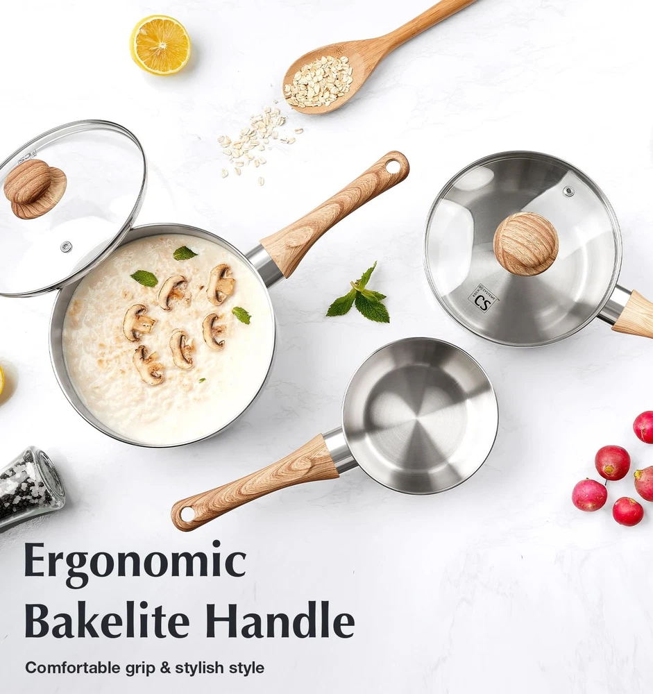 Cook with precision and style using our 2-quart stainless steel saucepan with a bakelite handle and tri-ply bottom. This saucepan is a testament to culinary excellence, offering exceptional heat conductivity and control for optimal cooking results. The bakelite handle stays cool to the touch, providing a comfortable and secure grip while cooking. The tri-ply bottom construction ensures even heat distribution, making it perfect for a wide range of cooking techniques. With its induction compatibility, this saucepan is a versatile addition to any kitchen, allowing you to create delicious meals with ease. Premium Stainless Steel Construction: The stainless steel saucepan set is expertly crafted from 18/10 stainless steel for rapid heating. Its non-reactive cooking surface preserves natural flavors, guaranteeing consistently delicious culinary outcomes. Professional Cooking Results: The superior heat retention and distribution properties of the trip-ply bottom allow for precise temperature control, helping you achieve professional-level cooking results in your own kitchen. Ergonomically Bakelite Handle: Our stainless steel saucepan features a heat-resistant bakelite handle, ensuring both comfort and security while cooking. With its stylish design, it enhances the aesthetic of any modern kitchen, making it an essential choice for home cooks. All-Stove Compatibility: From gas and electric to induction and ceramic cooktops, this saucepan is suitable for all stove types, providing versatility and convenience. Induction Compatible. Easy Maintenance: Crafted from premium brushed finish stainless steel, this set is dishwasher safe for easy cleaning. Its resistance to discoloration ensures it maintains its pristine appearance, guaranteeing enduring quality over time.