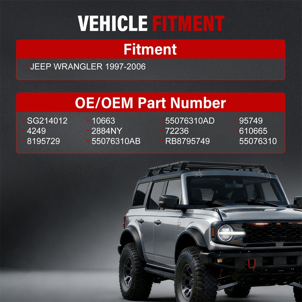 Store Home New Listing Ending Soon Sale items View Feedback Contact us Shock Absorbers & Spring Power Steering Pump Rack & Pinion Engine Rebuild Kit Store Categories Engine Motor Mount Other Water Pump Ignition coil Power Steering Pump Turbo Starter AC Condenser Headlights Brake Caliper Intercooler Charger Wiring Harness Wire Radiator Alternator Splash Guards Mud Flaps oxygen sensor Throttle Body Timing Chain Drive Shaft Motor Mount Camshaft Kit Control Arms Power Steering Gear Box Window Regulator Power Steering Rack A/C Compressor Side Mirror AC Compressor Clutches Wheel Bearing Air Suspension Strut Sun Visors Fuel Pump Assembly Leveling Lift Kit Carburetor Engine Oil Pan Coilovers Mirror Power Air Compressor Oxygen O2 Sensor Shocks, Struts & Assemblies Engine Overhaul Rebuild Kit Wheel Spacers CV Axle Shaft Assembly Oxygen Sensors Air Suspension Struts Lift Support Struts Roof Rack Roof Racks & Cross Bars Oil Pan Car & Truck HVAC Blower Motor 2 Rear Window Lift Support Shocks Struts Fit For 1997-2006 Jeep Wrangler TJ US 2 Rear Window Lift Support Shocks Struts Fit For 1997-2006 Jeep Wrangler TJ US Product Description 2pcs Rear Lift Supports Shock Struts for JEEP WRANGLER 1997-2006, SG214012, 4249, 8195729, 10663, 2884NY, 55076310AB Auto Part Position: Rear Fitment: JEEP WRANGLER 1997-2006 Service Type: Car Replacement Part Number:SG214012, 4249, 8195729, 10663, 2884NY, 55076310AB, 55076310AD, 72236, RB8795749, 95749, 610665, 55076310 Warranty: Our Rear Tailgate Power Lift Support Has 1 1-Year Warranty. All Products Shipped Are Tested And Easy To Install. We Offer True Worry-free Shopping And Convenient Refund Policy Experience—100% Brand New And High-Quality Guaranteed. About this item 1.Replacement Part Number # -SG214012, 4249, 8195729, 10663, 2884NY, 55076310AB, 55076310AD, 72236, RB8795749, 95749, 610665, 55076310 Before ordering, please confirm compatibility and weather are suitable for your vehicle! 2.Compatible Vehicle - Rear Tailgate Power Lift compatible with JEEP WRANGLER 1997-2006 3.Advantage - It’s easy to install, durable and corrosion-resistant, wear-resistant, heat-resistant, strong impact resistance, and good overall performance. More convenient to directly replace old or damaged. 4.High Performance - This newest tailgate power lift support, which is made of high durable material, the quality meets or exceeds OEM standards. 100% Tested Before Leaving The Factory. 5.After-Sales Service - We have 1 year warranty, Worry-free Return And Refund Policy, Please Buy With Confidence!If You Have Any Questions About our product Please Contact Us,We Will Deal With It As Soon As Possible! US Warehouse,Fast Delivery! Warranty: limited 5 years warranty - free one time replacement. - Ship within 24 hours - Support 30 days return policy - Reply within 24 hours Contact Us: If you have the following issues, please contact us to get your problems solved: 1. Item Not Received 2. Item Not As Description 3. I Need to Return My Item 4. Pre-sale Inquiry 5. Others About Us Payment Shipping Returns Contact Us About Us Cotit Parts Story: Mission: The mission of Cotit Parts automotive parts is to provide customers with excellent quality and reliability, ensuring their vehicles are always in optimal condition. We aim to be the preferred brand in the field of car maintenance and repair, offering unmatched value and trust to our customers. Philosophy: At Cotit Parts, we believe that every single automotive part plays a crucial role, influencing the overall performance and safety of the vehicle. Therefore, we strive for the perfect combination of exceptional quality, innovative technology, and superior service to meet the demand for high-standard automotive parts. Founder's Experience: The founder of Cotit Parts automotive parts, Cooper, is an automotive engineer and an expert passionate about car maintenance. He held key positions in renowned car manufacturers and aftermarket companies, accumulating extensive industry experience. However, he recognized the varying quality of automotive parts available in the market and was determined to create the Cotit Parts brand, offering reliable and high-quality parts to provide customers with worry-free maintenance and repair experiences. "Excellence in Quality, Confidence in Every Drive" - Cotit Parts Automotive Parts, infusing your vehicle with reliable power! Cotit Parts automotive parts stand out in a highly competitive market due to the following differentiating factors : 1,Superior Quality: Cotit Parts strictly controls every production process to ensure all parts meet the highest quality standards. We utilize premium materials and advanced manufacturing techniques, subjecting each component to rigorous testing and validation for durability, performance, and safety. 2,Innovative Technology: Cotit Parts continuously introduces innovative technologies, incorporating the latest advancements into the design and manufacturing of our parts. We strive to deliver products with outstanding performance and advanced features, meeting customers' expectations for enhanced vehicle performance and driving experience. 3,Customer Care: We understand the importance of customer satisfaction in vehicle maintenance and repair. Therefore, Cotit Parts always prioritizes customer needs. We provide professional pre-sales consultation and after-sales services, assisting customers in selecting the right parts for their vehicles and offering installation and maintenance guidance to ensure a worry-free user experience. 4,Reliability and Trust: Cotit Parts is renowned for its reliability and longevity. Our parts undergo stringent testing and validation to operate reliably under various conditions, providing customers with long-term performance and dependability assurance. By choosing Cotit Parts automotive parts, you gain the guarantee of exceptional quality, innovative technology, and reliability. We are committed to providing the best maintenance and repair solutions for your be