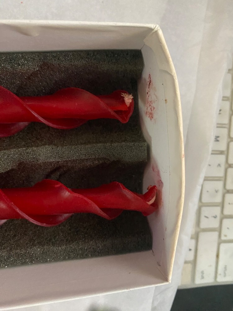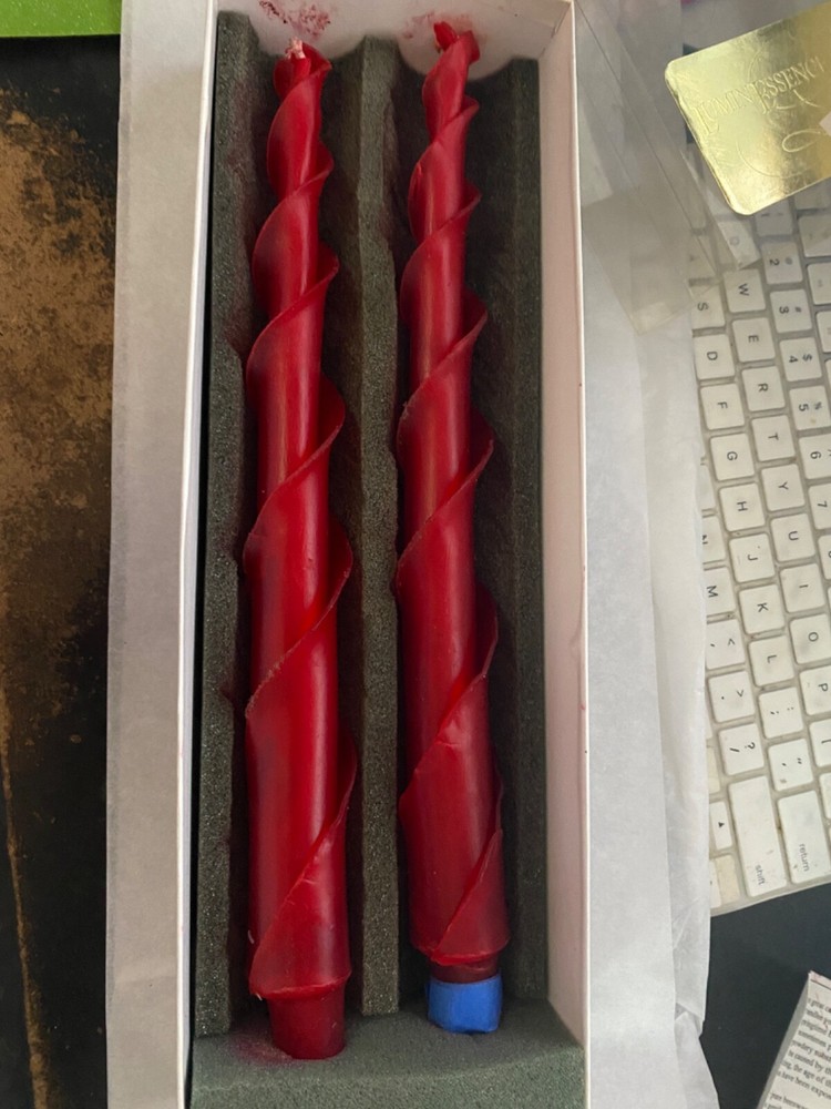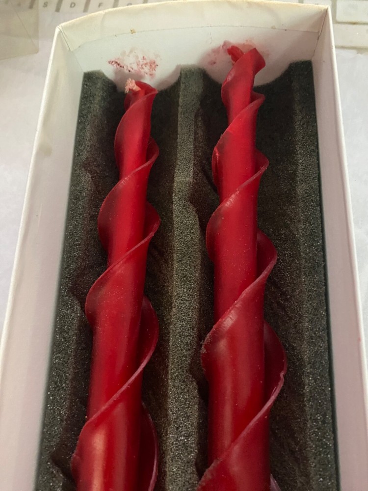 Brand new in the box , there are 2 10" tapers which are twisted They are red and made of beeswax .