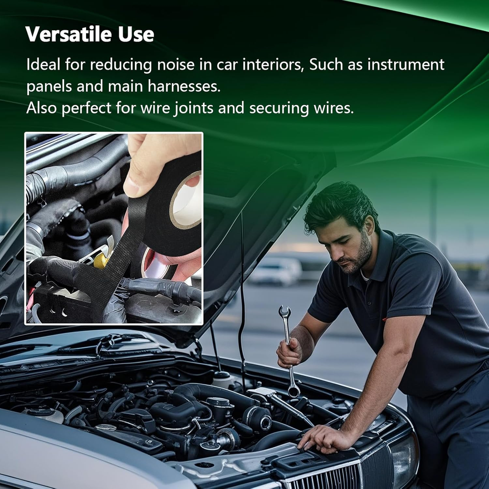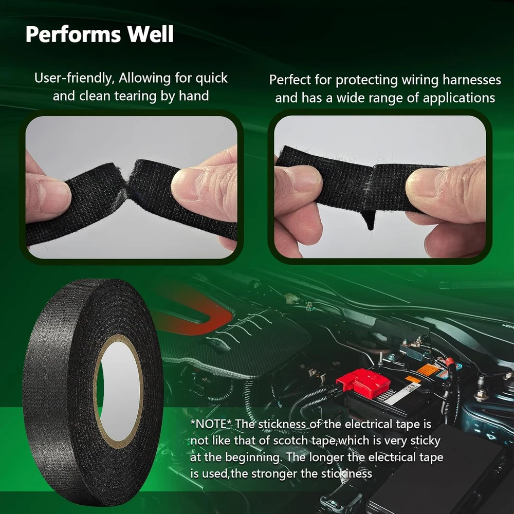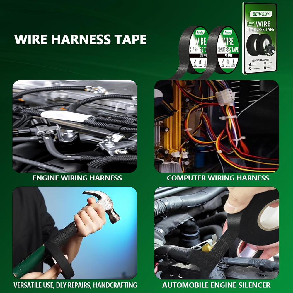 Store New Arrivals Add to Favorite View Feedback Contact 2 Rolls Automotive Wire Harness Tape, 50 Feet, High Temp Self-Adhesive Cloth Ele Description Item model number Wire Tape-2 Style 2-pack Number of Items 2 Color Black Material Polyester Country of Origin China Special Feature Electrical Package Dimensions 7.05 x 3.46 x 0.79 inches; 3.53 ounces High temp Wire Harness Automotive Cloth Tape capable of withstanding harsh temperatures (-40℉ to 250℉) while delivering excellent soundproofing and vibration dampening. This engine tape wrap Matches or exceeds OEM wire harness tapes in thickness, tensile strength, and appearance, with extra-sticky adhesive for quick bundling of hard-to-reach cables. Apply this Wire Loom Tape to cables easily. No scissors needed - simply tear it by hand. Its flexible nature makes adjusting the length a breeze. Puncture and Abrasion Resistance: This automotive felt tape resists abrasions and corrosion, preserving cables in pristine condition. Widely Applicable: cloth electrical tape Beyond automotive use, it doubles as an excellent tool for organizing appliance cords and household wiring. Product Description Efficient and Durable Solution Feature of wire cloth tape for Electrical Automotive Engine Harness Easy to Tear wire harness cloth tape is easy to tear and wrap around wires, simply tear by hand, No need for scissors! No glue residue after tearing. Good Performance Cloth wire tape features amazing high and low temperature stability, abrasion and corrosion-resistant, works great between -40°F~250°F Widely Use Wire harness automotive cloth tape suitable for automotive engine, battery or car audio installation, also can be used for insulation protection. Automotive cloth Tape Keep your wiring neat and secure with this strong, easy-to-tear adhesive cloth tape — ideal for bundling or protecting wires. Wire Harness Tape Adhesive tape effectively protect and bundle wire harnesses for insulation and protection of engine compartment and battery winding, sound reduction shock absorption, and provide heat and wear protection Is this tape suitable for engine bay and high-heat areas? Yes, this high-temp wire harness tape is designed to withstand temperatures from -40℉ to 250℉. It’s perfect for engine wiring harnesses, offering heat resistance, sound dampening, and vibration reduction. Is this tape suitable for OEM-level automotive wiring harnesses? Yes. It meets or exceeds OEM standards for adhesion and durability. Perfect for professional wire harness wrapping, ensuring tight, secure, and heat-resistant bundling. What can this tape be used for besides cars? It’s great for bundling appliance cords, fixing household cables, wrapping motorcycle wires, or soundproofing interior panels. A truly versatile solution for daily use. ABOUT US We offer the best prices around on high quality products. Our E-store includes media such as books, movies, music and games while offering electronics, toys, sporting apparel, clothing, tools, general home, garden items and more. SHIPPING We are always working hard to ensure your package arrives as soon as possible. Please understand that some factors like weather, high postal traffic, and the performance of shipping companies are outside of our control. We offer free shipping to the lower 48 states and ship within 2 business days of payment, usually sooner. We do not accept P.O. Boxes. Please provide a physical address. For shipping outside of the continental USA, we only use eBay's Global Shipping Program.The item is shipped to KY and then sent to the rest of the world. International customers are responsible for all duties and taxes. Continue to check out in order to calculate costs for shipping the item to your country. Messages regarding eBay's Global Shipping Program MUST be directed at eBay EXCLUSIVELY. RETURNS We offer a 30-Day Return Policy on items which you are not completely satisfied with. You have the option for a full-refund or an exchange of the item. No returns are available on items shipped outside of the USA. PAYMENT We accept PayPal. CONTACT US This page content is yet to come Please ad us to your favorite seller and visit again later Thank You CUSTOMER SATISFACTION We try our very best to make sure every customer is completely satisfied. If there's a problem, message us! We're happy to help. WE ACCEPT Copyright © 2021 AutoDS. | All Rights Reserved