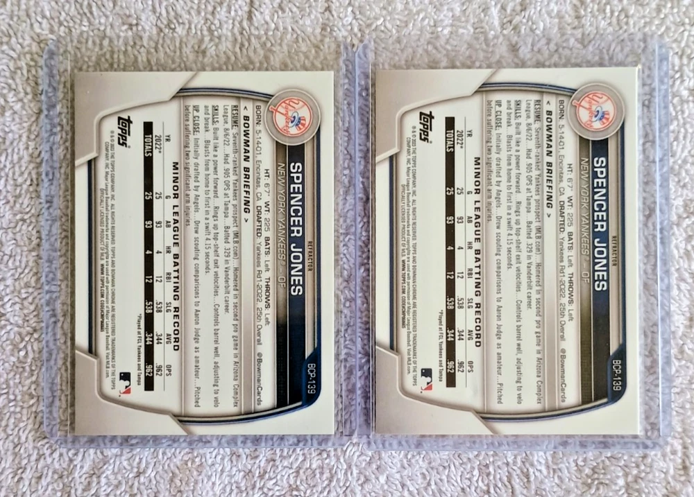2 SPENCER JONES 2023 BOWMAN CHROME LUNAR REFRACTOR RC LOT # BCP13 YANKEES SHIPPING WILL BE $4.99. I DO COMBINE SHIPPING FOR ADDITIONAL ITEMS PURCHASED. PLEASE CONTACT ME FOR DISCOUNTED RATES. USPS FIRST CLASS SHIPPING UNLESS OTHERWISE LISTED. I ONLY SHIP TO THE U.S. EBAY SELLER WITH 100% FEEDBACK. PLEASE VIEW MY OTHER LISTING. MONEY BACK IS GURANTED IF YOU NOT SATISFIED WITH THE RETURN OF THE ITEM OR ITEMS.
