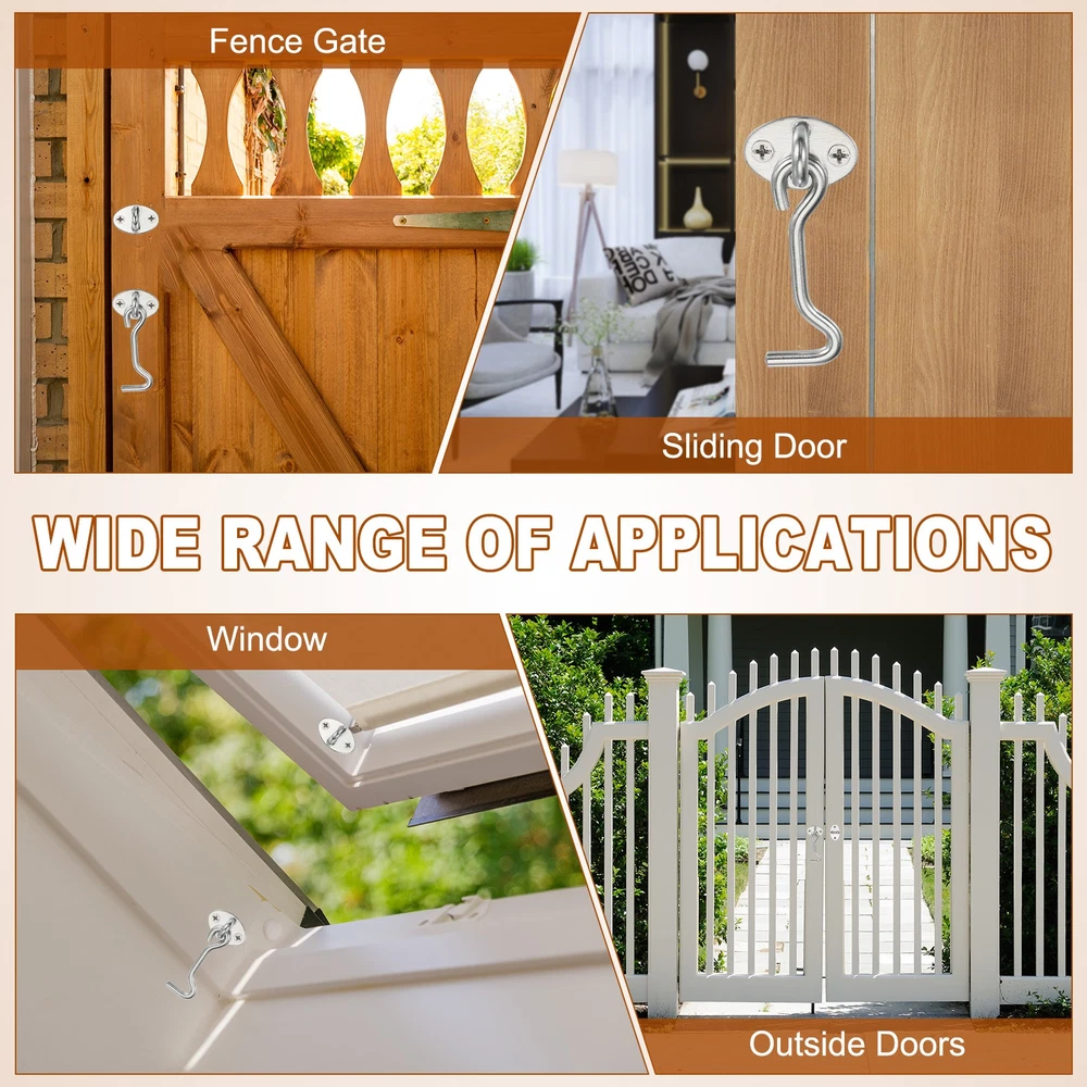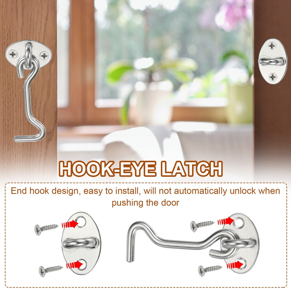 Document What is this?Hook eye latch, which is widely used in cabinets, sliding barn doors, cabin doors, swing windows, garages, sheds, gate, back doors, closet doors, front porches, fences, cabinets, shutters, alloy windows, etc., to secure the door by hooking the latch into the eye plate, thereby providing privacy and security.What will I get?The package contains 2 hook and eye latches, with 8 mounting screws. The door latch length is 8.5 cm / 3.3 inch; the mounting plate size is (W*H*Thickness): 40x21x2 mm /1.6 x 0.8 x 0.08 inch, the center distance is 27 mm / 1.1 inch, and the screw length is 15mm / 0.6 inchAre there any advantages of the product?The latch hook adopts the end hook design, which will not automatically unlock due to the push of the door, ensuring security and privacy.The stainless steel electroplating process makes the hook and eye latch durable, not easy to rust or breakage, and can be used for a long time in various weather environments.How to use it?Install the eye plate on the door frame and the hook latch on the corresponding door edge, aligning to ensure proper engagement.Close the door and hook the latch into the eye plate to secure the door in place.To unlock, simply lift the hook from the eye plate to release the door.What should I notice?Please confirm the door latch size is suitable for your door before placing an order. 2 Set Hook and Eye Latch Barn Door Lock Gate Latch 3" with Screws Silver What is this? Hook eye latch, which is widely used in cabinets, sliding barn doors, cabin doors, swing windows, garages, sheds, gate, back doors, closet doors, front porches, fences, cabinets, shutters, alloy windows, etc., to secure the door by hooking the latch into the eye plate, thereby providing privacy and security. What will I get? The package contains 2 hook and eye latches, with 8 mounting screws. The door latch length is 8.5 cm / 3.3 inch; the mounting plate size is (W*H*Thickness): 40x21x2 mm /1.6 x 0.8 x 0.08 inch, the center distance is 27 mm / 1.1 inch, and the screw length is 15mm / 0.6 inch Are there any advantages of the product? The latch hook adopts the end hook design, which will not automatically unlock due to the push of the door, ensuring security and privacy. The stainless steel electroplating process makes the hook and eye latch durable, not easy to rust or breakage, and can be used for a long time in various weather environments. How to use it? Install the eye plate on the door frame and the hook latch on the corresponding door edge, aligning to ensure proper engagement. Close the door and hook the latch into the eye plate to secure the door in place. To unlock, simply lift the hook from the eye plate to release the door. What should I notice? Please confirm the door latch size is suitable for your door before placing an order. Hot Item Payment 1.We accept eBay payment . 2.Payment must be received within 7 business days of auction closing. Shipping 1.We ship to your eBay or Paypal address. Please make sure your eBay and Paypal address is correct before you pay. 2.Items will be shipped within 1-3 business day when we received payment. 3.Delivery time depends on destination and other factors. Description Policy 2 Set Hook and Eye Latch Barn Door Lock Gate Latch 3" with Screws Silver What is this? Hook eye latch, which is widely used in cabinets, sliding barn doors, cabin doors, swing windows, garages, sheds, gate, back doors, closet doors, front porches, fences, cabinets, shutters, alloy windows, etc., to secure the door by hooking the latch into the eye plate, thereby providing privacy and security. What will I get? The package contains 2 hook and eye latches, with 8 mounting screws. The door latch length is 8.5 cm / 3.3 inch; the mounting plate size is (W*H*Thickness): 40x21x2 mm /1.6 x 0.8 x 0.08 inch, the center distance is 27 mm / 1.1 inch, and the screw length is 15mm / 0.6 inch Are there any advantages of the product? The latch hook adopts the end hook design, which will not automatically unlock due to the push of the door, ensuring security and privacy. The stainless steel electroplating process makes the hook and eye latch durable, not easy to rust or breakage, and can be used for a long time in various weather environments. How to use it? Install the eye plate on the door frame and the hook latch on the corresponding door edge, aligning to ensure proper engagement. Close the door and hook the latch into the eye plate to secure the door in place. To unlock, simply lift the hook from the eye plate to release the door. What should I notice? Please confirm the door latch size is suitable for your door before placing an order. Hot Item Payment 1.We accept eBay payment . 2.Payment must be received within 7 business days of auction closing. Shipping 1.We ship to your eBay or Paypal address. Please make sure your eBay and Paypal address is correct before you pay. 2.Items will be shipped within 1-3 business day when we received payment. 3.Delivery time depends on destination and other factors.