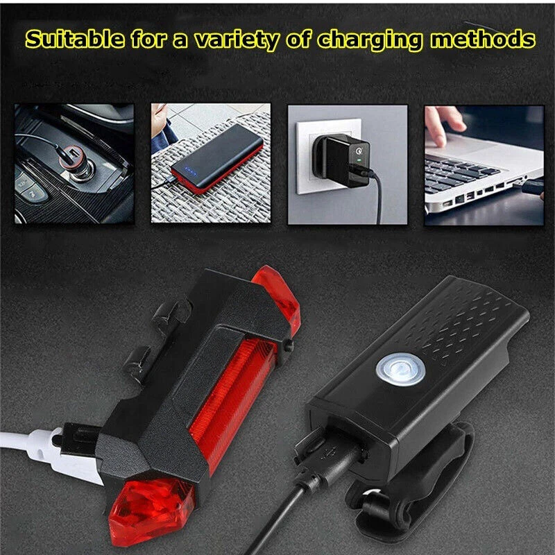 Product Description Product Features: Super Bright Bike Lights: Include Front Cycling Light and Back Light Front light has 3 modes-High/Low/Flashing,torch light with bike clamp, Button switch. Special designed light beam produces powerful lumen and generates a brilliant floodlight for Large area without wasting energy. USB rechargeable: Built in Rechargeable Li-ion battery, easily charged from your computer or any device with a USB port. 360º Visibility: Safety set for riding at night.Both a headlight and a tail light making your bicycle stand out with unmatched 360º visibility so you and your loved ones are safer in any low light conditions. Durable bike lights-Durable aluminum body, shock-resistance endure rough handling. Do not be afraid of the rough road. Waterproof: IP65-rated water resistant and designed for use in heavy rain and outside riding. Mini design ,lightweight,space-saving. A perfect gift for yourself or friend Installations: Easy to install with no tool required The fla shlight is easy to install on the bicycle with the adjusta ble bracket(3 small holes to adjust) without detach the mount from the bike. Specification: Condition: 100% Brand New and High Quality ! Type: Bicycle Light Materials: Aluminum alloy+Rubber Color: Black headlight+Red tail light Charging Method: USB Rechargeable Headlight Light Modes: (High/Low/Flashing) Taillight Light Modes: (Slide-Flashing-Always on) Waterproof Rate: IP65 Power Indicator: Battery Indicator LED flashes when battery power is low giving you time to lower light mode and conserve power. Mode Memory Function: returns to the mode last selected before powering down. Application: for cycling, hiking, camping, or any outdoor activity Package Includes: 2 x Front Light 2 x Back Light 4 x USB Cable 4 x O-ring Payment Shipping Returns Contact Us All Modes of Payment are acceptable,such as Apple pay, Google pay, PayPal, credit card, etc. We will deliver the items to you within the processing time. Please provide us your correct receiving address (include house number, Street name) , so that we can ship the order to you as soon as possible! If you need us to ship the items by other way, please feel free to contact us. Thanks! Please check your shipping address carefully before checkout, it can't be changed if order completed. If you are not satisfied with your purchasing, you can return the product and get a full refund. But we will not responsible for the shipping and people damaged. You can return a product for up to 30 days from the date you’ve purchased it. Please contact us to confirm the return address before you return the items. Incorrect/Faulty/Damaged Items: Please contact us to arrange for the return via eBay messaging or one of the numbers above. NO postage will be refunded unless agreed upon in email or writing prior to returning. Monday to Friday 9:00 am to 6:00 pm. We do not work holidays . If you send email to us,In our working hours will be resumed within 24 hours. If you we are not satisfied with the product or service ,please contact me and don't give us negative or natural feedback,We must give you a satisfactory solution. Payment All Modes of Payment are acceptable,such as Apple pay, Google pay, PayPal, credit card, etc. Shipping We will deliver the items to you within the processing time. Please provide us your correct receiving address (include house number, Street name) , so that we can ship the order to you as soon as possible! If you need us to ship the items by other way, please feel free to contact us. Thanks! Please check your shipping address carefully before checkout, it can't be changed if order completed. Returns If you are not satisfied with your purchasing, you can return the product and get a full refund. But we will not responsible for the shipping and people damaged. You can return a product for up to 30 days from the date you’ve purchased it. Please contact us to confirm the return address before you return the items. Incorrect/Faulty/Damaged Items: Please contact us to arrange for the return via eBay messaging or one of the numbers above. NO postage will be refunded unless agreed upon in email or writing prior to returning. Contact Us Monday to Friday 9:00 am to 6:00 pm. We do not work holidays . If you send email to us,In our working hours will be resumed within 24 hours. If you we are not satisfied with the product or service ,please contact me and don't give us negative or natural feedback,We must give you a satisfactory solution. powered by