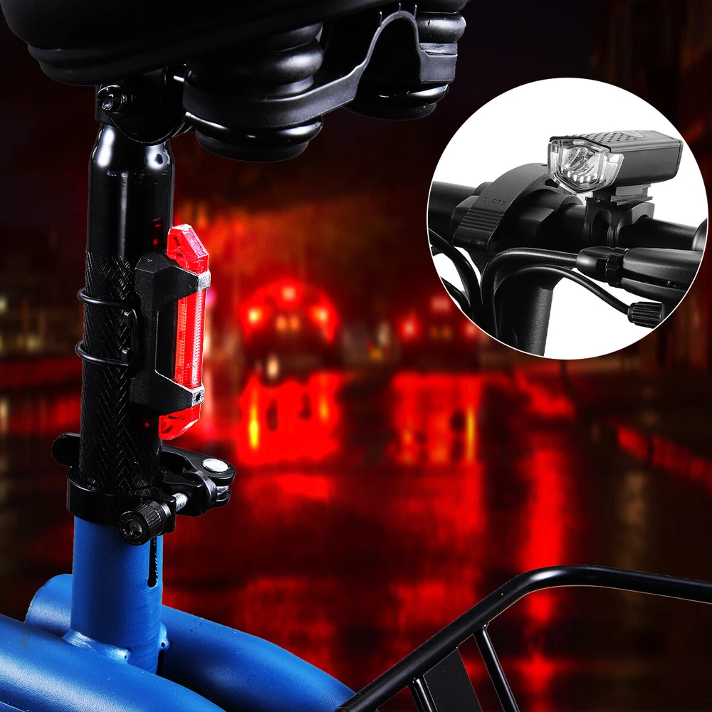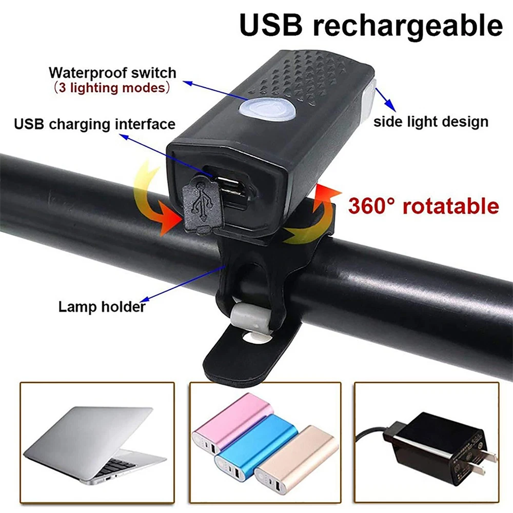 Product Features: Super Bright Bike Lights: Include Front Cycling Light and Back Light Front light has 3 modes-High/Low/Flashing,torch light with bike clamp, Button switch. Special designed light beam produces powerful lumen and generates a brilliant floodlight for Large area without wasting energy. USB rechargeable: Built in Rechargeable Li-ion battery, easily charged from your computer or any device with a USB port. 360º Visibility: Safety set for riding at night.Both a headlight and a tail light making your bicycle stand out with unmatched 360º visibility so you and your loved ones are safer in any low light conditions. Durable bike lights-Durable aluminum body, shock-resistance endure rough handling. Do not be afraid of the rough road. Waterproof: IP65-rated water resistant and designed for use in heavy rain and outside riding. Mini design ,lightweight,space-saving. A perfect gift for yourself or friend Installations: Easy to install with no tool required The fla shlight is easy to install on the bicycle with the adjusta ble bracket(3 small holes to adjust) without detach the mount from the bike. Specification: Condition: 100% Brand New and High Quality ! Type: Bicycle Light Materials: Aluminum alloy+Rubber Color: Black headlight+Red tail light Charging Method: USB Rechargeable Headlight Light Modes: (High/Low/Flashing) Taillight Light Modes: (Slide-Flashing-Always on) Waterproof Rate: IP65 Power Indicator: Battery Indicator LED flashes when battery power is low giving you time to lower light mode and conserve power. Mode Memory Function: returns to the mode last selected before powering down. Application: for cycling, hiking, camping, or any outdoor activity Package Includes: 2 x Front Light 2 x Back Light 4 x USB Cable 4 x O-ring
