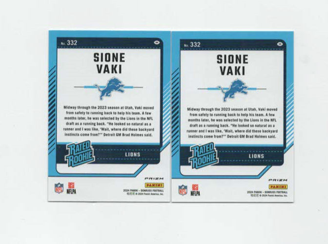 You are bidding on one LOT OF (2) SIONE VAKI 2024 DONRUSS RATED ROOKIE RED PANDORA OPTIC PRIZM ROOKIE CARDS #332. Shipping & Handling in the US is $4.50 MAILED IN A PADDED ENVELOPE WITH TRACKING/DELIVERY CONFIRMATION . Please add .50 cents per extra auction won. Check my other auctions for new released cards from your favorite teams or players. Thank you.