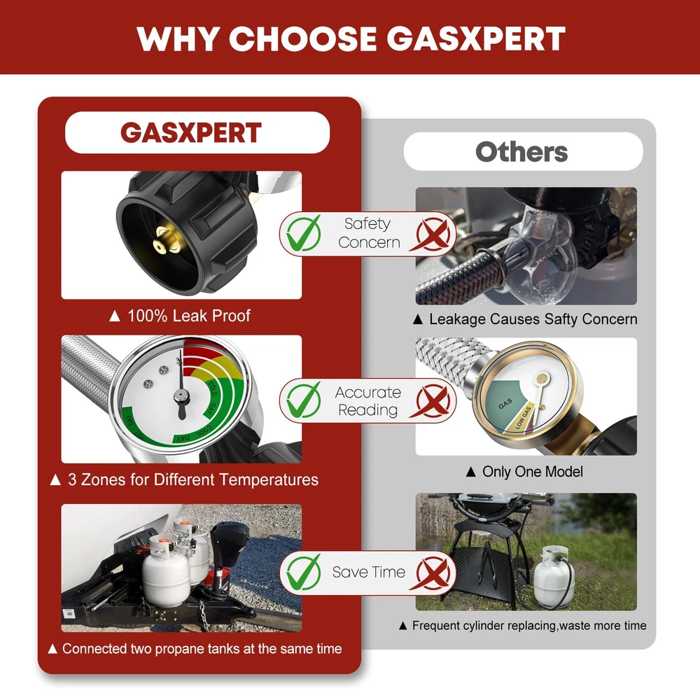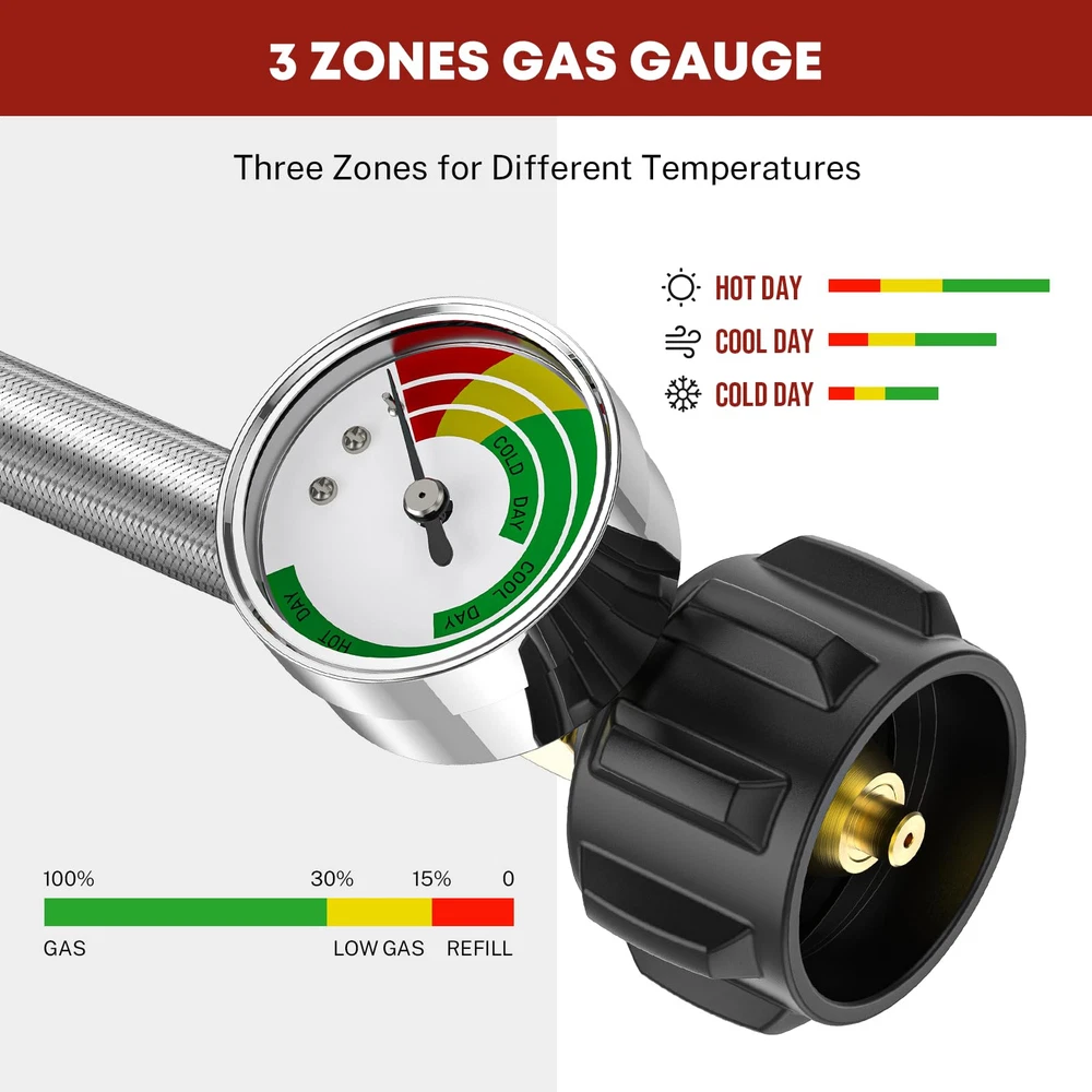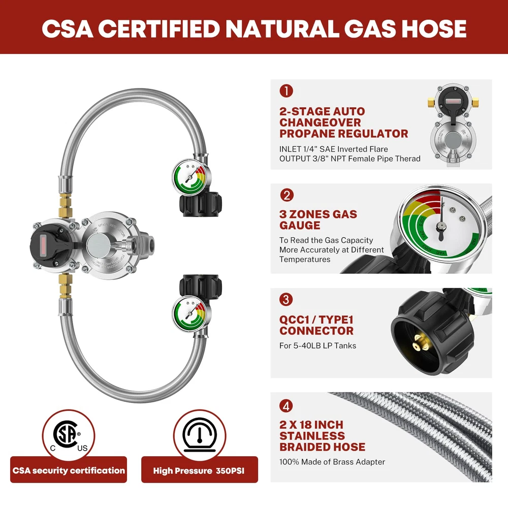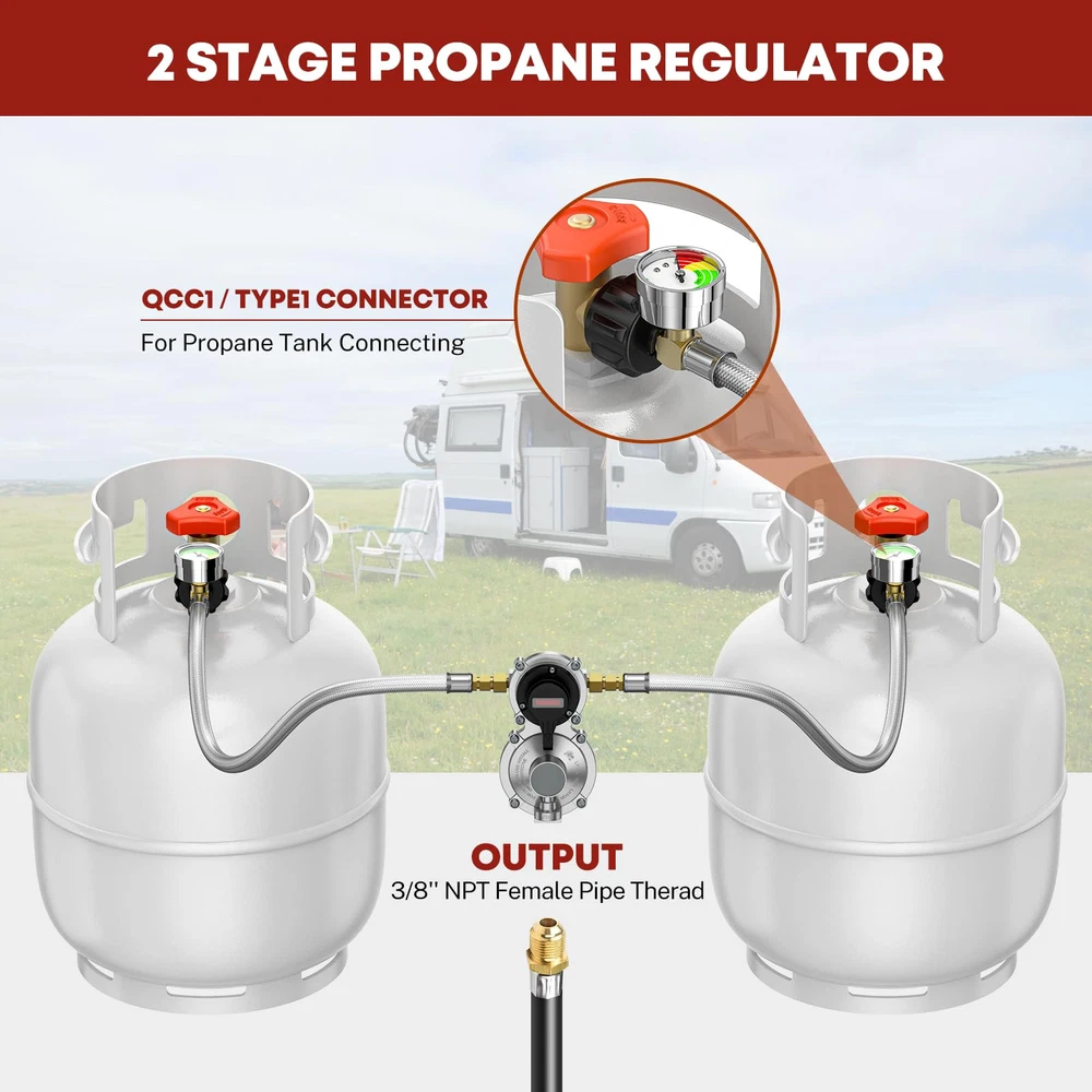 High-Quality Materials - Made of 100% solid brass, propane hose and regulator are durable and long-lasting. The RV pigtail propane hose is made of stainless steel braided material, ensuring air tightness and stability. All fittings are CSA certified. Package Includes: 1 PC 2 Stage Auto Changeover RV Propane Regulator, 2 pack 18'' Stainless Braided QCC1 1/4" Inverted Male Flare RV Pigtail Propane Hoses with Gauge, 1 PC Roll Sealing Tape, and 1 PC Wrench. Function Upgrade & 3 Zones Gas Gauge - Connect propane tanks at once with 's 2-Stage regulator, won't stop working because of them is out of gas, automatically switches from primary to reserve tank when primary is empty. At the same time, you can use the rotary pointer to designate of the tank to work on, and the indicator changes color to let you know when a tank needs to be refilled. 3 Zones gas level gauge for reading the gas level accurately at different temperatures! Specification & Parameters - 's RV propane regulator has a primary cylinder capacity of 210,000 BTU/hr and a reserve cylinder capacity of 130,000 BTU/hr. Inlets are 1/4" SAE Inverted Flare, Outlet is 3/8" Female NPT. RV pigtail propane hose has a 1/4" Male Inverted Flare and QCC1 Fitting. Versatile Application - Suitable for RVs, campers, and travel trailers with dual propane tanks. These 18" RV pigtail propane hoses with 2-stage propane regulator can connect dual 5-40 lb refillable propane tanks or LP gas tanks to your camper's 1/4" inverted male flare. Replace any existing automatic changeover regulator on your current RV, Travel Trailer, Camper, maintains constant and continuous gas. We Not Only Provide Propane Hoses - All propane hoses are under 1-Year . As we value every customer’s voice and experience with our products as well as with our service, we provide 24hrs/7days non-stop customer support to you. Pls feel free to us whenever you are concerned about the product or after-sales service.