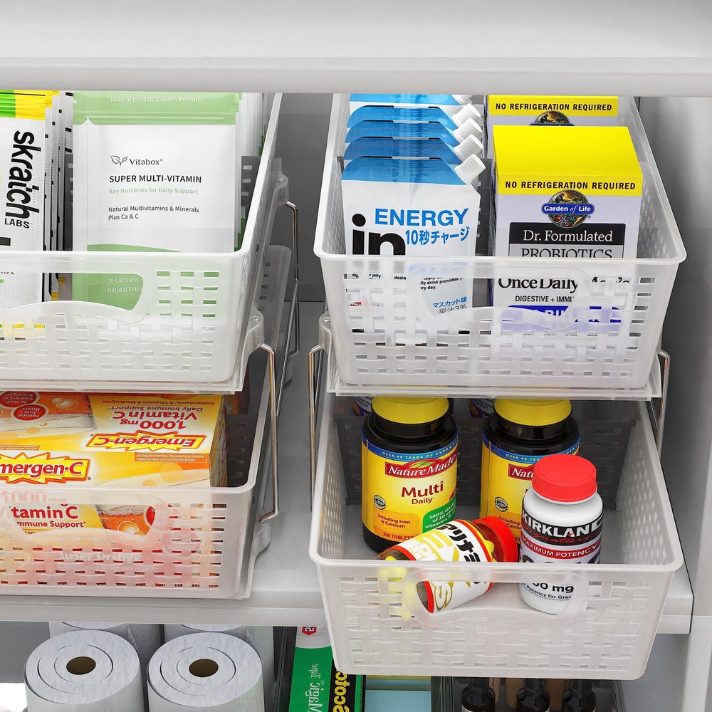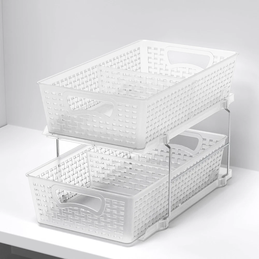 Great Bathroom Organizer Tray, Plastic Perforated Tray in Humid Places Sliding Basket for easy access in limited space ; Weaved Basket Bold Design Two drawers. Great for kitchen, bathroom and storage room organization. Gain more space in the cabinet, pantry room or even open space No drill, no power tools needed. Easy assemble and save more space Outer Dimension: 14.4" L X 8.3" W X 9.8" H
