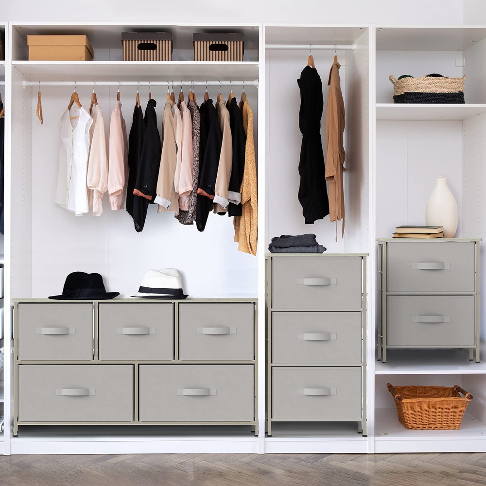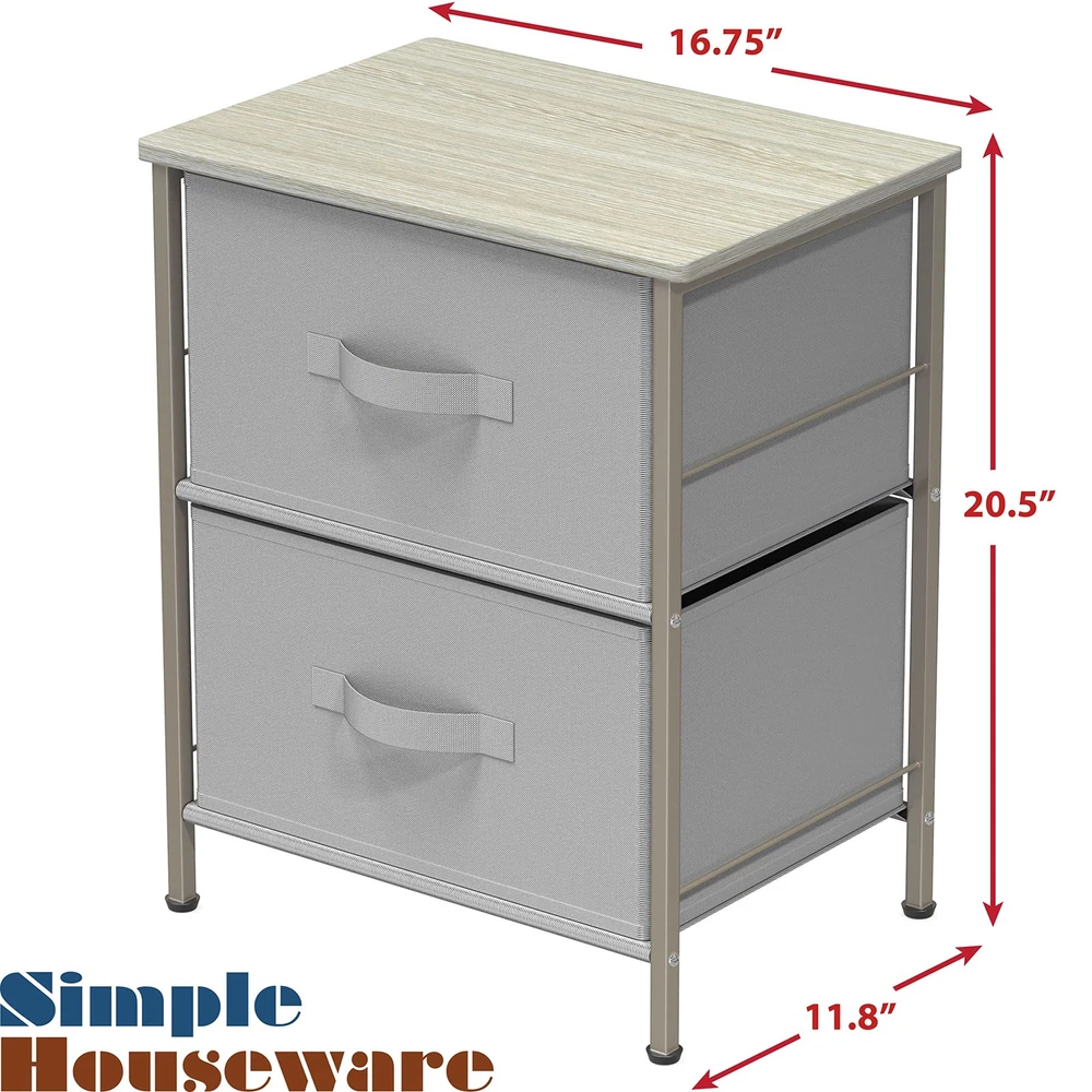 2 Tier Night Stands Dresser for Bedroom Organizer Drawer Storage Tower, Grey 2-Tier Shelf Dresser with 2 Collapsible Baskets Bin. Free-Standing Design for bedroom night stand / closet clothes storage furniture Sturdy Metal Frame Construction with Classic Bronze Coating. Durable MDF Wood Top for your bedroom items such as lamps, books and decor. Each Basket has 5 heavy cardboards (include bottom side) support each side Dimension: 16.75" D x 11.8'' W x 20.5" H