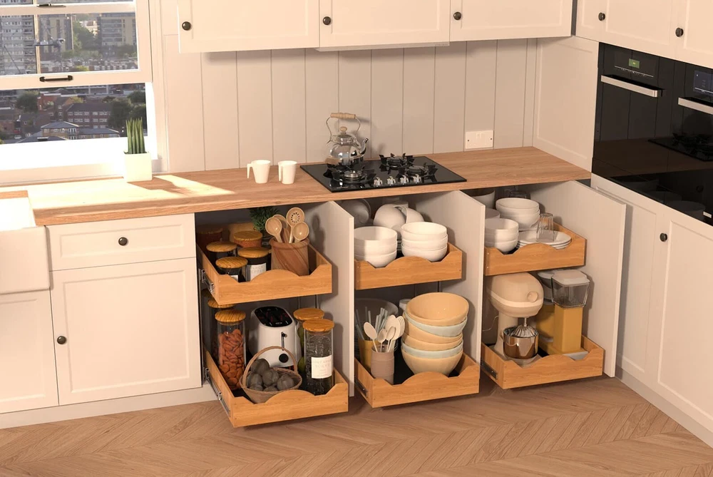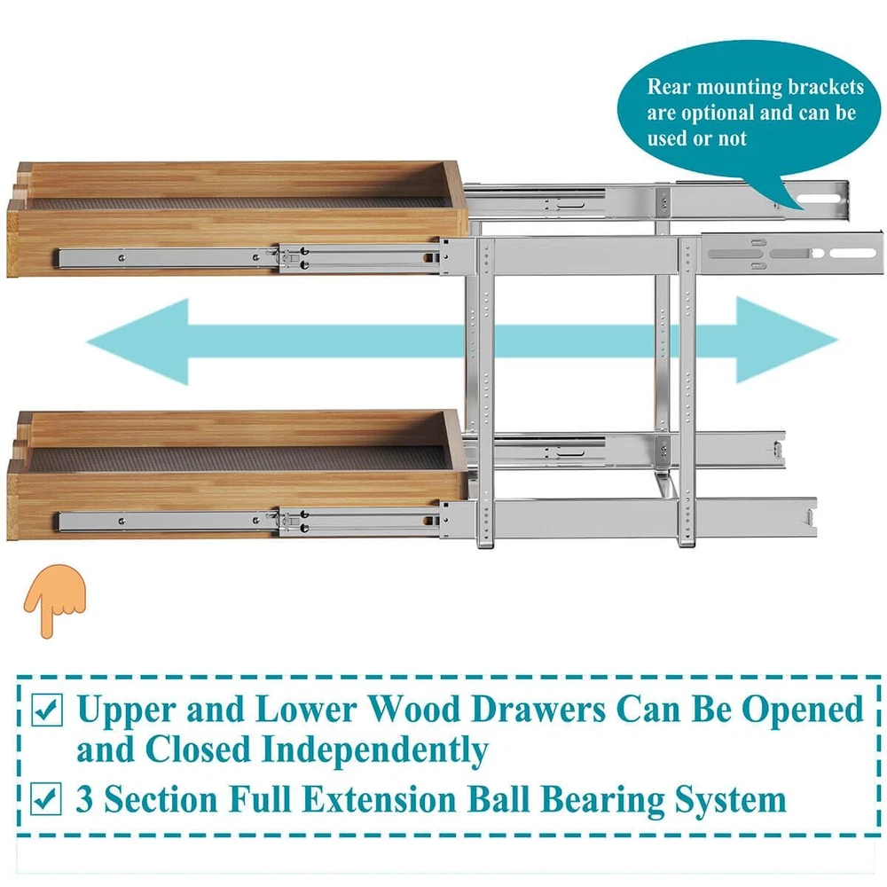 2 Tier Pull Out Wood Cabinet Organizer: Organizing your cabinet space just got easier with the 2-tier pull-out sliding shelf. Now you can make the most of cabinet space and easily access all your pots, pans, small kitchen appliances, cleaning products, canned goods, and other items. The Size of Cabinet Pull Out Shelves:20"W x 21"D x 15"H. This 2 tier slide out wood cabinet organizer needs at least 21 inch wide and larger net cabinet openings. Min cabinet interior depth: 22.5 inch. Easy to Install: Comes with step by step installation manual and all the hardware necessary for a quick, easy install. Both upper and lower Wood Drawer fully slide out independently on precision ball bearing slides so you can reach to your items easily and more quickly. Excellent Design: The upper and lower Wood Drawer has 2 height adjustment options, and the installation compatibility in the cabinet is better. When installing the lower Wood Drawer, there are two heights to choose from, Which can easily solve the problem that the lower Wood Drawer cannot be pulled out due to the lip of the cabinet. PREMIUM SERVICE: Please choose the right size before you purchase. For our customers, this pull out shelves comes with Lifelong Technical Support & Premium Service. If you have any issues about the pull out drawers, please contact us first, we will give you the satisfied solution as soon as possible. PLEASE NOTE: The overall width is 20" and the width of the wooden drawer is 18.4".