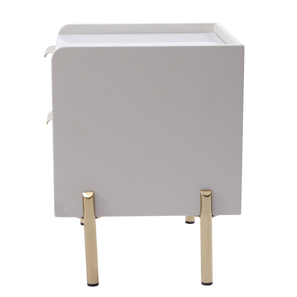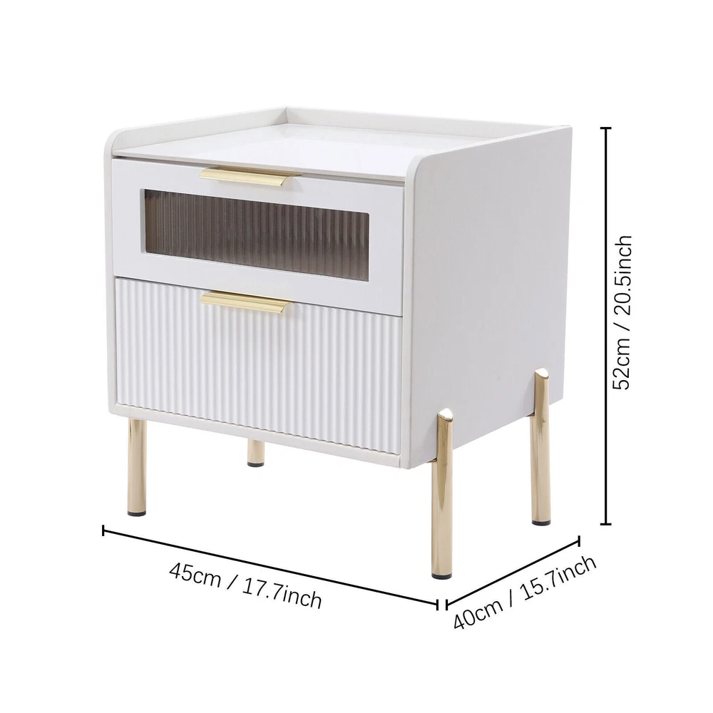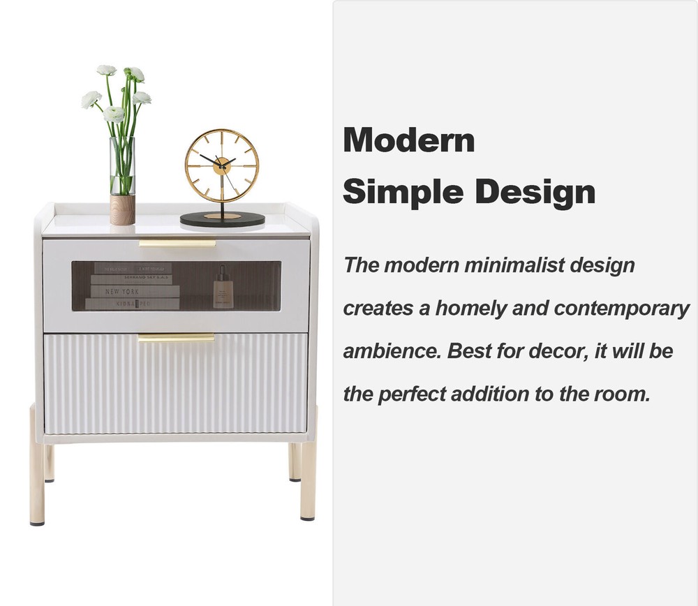 【For rooms】Overall Dimensions of Table:17.7" L x 15.7" W x 20.5" H, It strikes a clean-lined rectangular silhouette.It offers you enough space for your various things.You can use the open shelf to place your mobile phones, books, clocks, table lamps,magazines, etc. 【Modern and simple design】The modern minimalist design creates a homely and contemporary ambience. Best for decor, it will be the perfect addition to the room. 【Versatile use】This bedside table is versatile. Whether as a coffee table, end table, beside table or console table, it is a space-saving storage table. In addition, its elegant style will give modern accents to beautify your room. 【Smart storage】This modern two-drawer nightstand provides a storage solution for remotes,your favorite books, keepsakes, glasses... 2 Tiers End Table Storage Nightstand Side Table Bedroom Nightstand Decoration DESCRIPTION 【For rooms】Overall Dimensions of Table:17.7" L x 15.7" W x 20.5" H, It strikes a clean-lined rectangular silhouette.It offers you enough space for your various things. 【Versatile use】This bedside table is versatile. Whether as a coffee table, end table, beside table or console table, it is a space-saving storage table. In addition, its elegant style will give modern accents to beautify your room. 【Smart storage】This modern two-drawer nightstand provides a storage solution for remotes,your favorite books, keepsakes, glasses, and other necessaries at hand. The tabletop is perfect for displaying a lamp, clock, potted plant or photo frame to offer warmth and personalized decoration. 【No assembly required】You only need to simply install four table legs, saving you valuable time and effort. Enjoy a clean and tidy bedroom now. Describe: Product Dimensions: 17.7" L x 15.7" W x 20.5" H Material: Metal+MDF+glass+artificial leather Color: white + gold You only need to simply install four table legs, saving you valuable time and effort. Enjoy a clean and tidy bedroom now. Versatile and modern, leather, metal, glass are paired to create a modern, minimalist vibe. Smart storage, this two-drawer nightstand provides a storage solution for remotes, your favorite books, keepsakes, glasses and other necessaries at hand. Best for decorating,the tabletop is perfect for displaying a lamp, clock, potted plant or photo frame to offer warmth and personalized decoration. Payment Delivery details Terms of sales About us Contact us Payment We accept ebay payment 。 Fees such as import duties, taxes are not included in the item price or shipping costs. These charges are the buyer's responsibility. Delivery details Shipping: 2-9 working days to: USA Terms of sales We maintain high standards of excellence and strive for hundred percent customer satisfaction. Feedback is very important to us. We hope that you contact us immediately before you give neutral or negative feedback, so that we can address your concerns. It is impossible to address issues if we do not know about them! About us Your satis faction is our ultimate goal. We work hard to earn your trust and future business. Our certified technicians have tested each item before shipping. The unit comes with 1 year limited warranty on all manufacturing defects. a) If you receive a defective item, you may return it or ask for a discount. Please contact us within 14 days after you receive the package. b) What you returned must be intact and in its original packaging as re? u. Customer is responsible for shipping costs of the returned item. c) We will cover the cost of shipping back t with the shipping rate indicated in the registration page. We will send you a new unit or refund the full payment you paid. Thank you. Contact us Business Hour Business Hour: Monday To Friday: 8:30 AM to 5:00 PM (Beijing China time) Due to time zones, our reply to your questions may not be immediately. But within above working time, we will reply your email within 24 hours. If it's non-workdays, please kindly be patient and wait till Monday. Please contact us with ebay message. Please feel free to contact us if you have any questions. Monday To Friday: 8:30 AM to 5:00 PM (Beijing China time) Due to time zones, our reply to your questions may not be immediately. But within above working time, we will reply your email within 24 hours. If it's non-workdays, please kindly be patient and wait till Monday. Please contact us with ebay message. Please feel free to contact us if you have any questions.