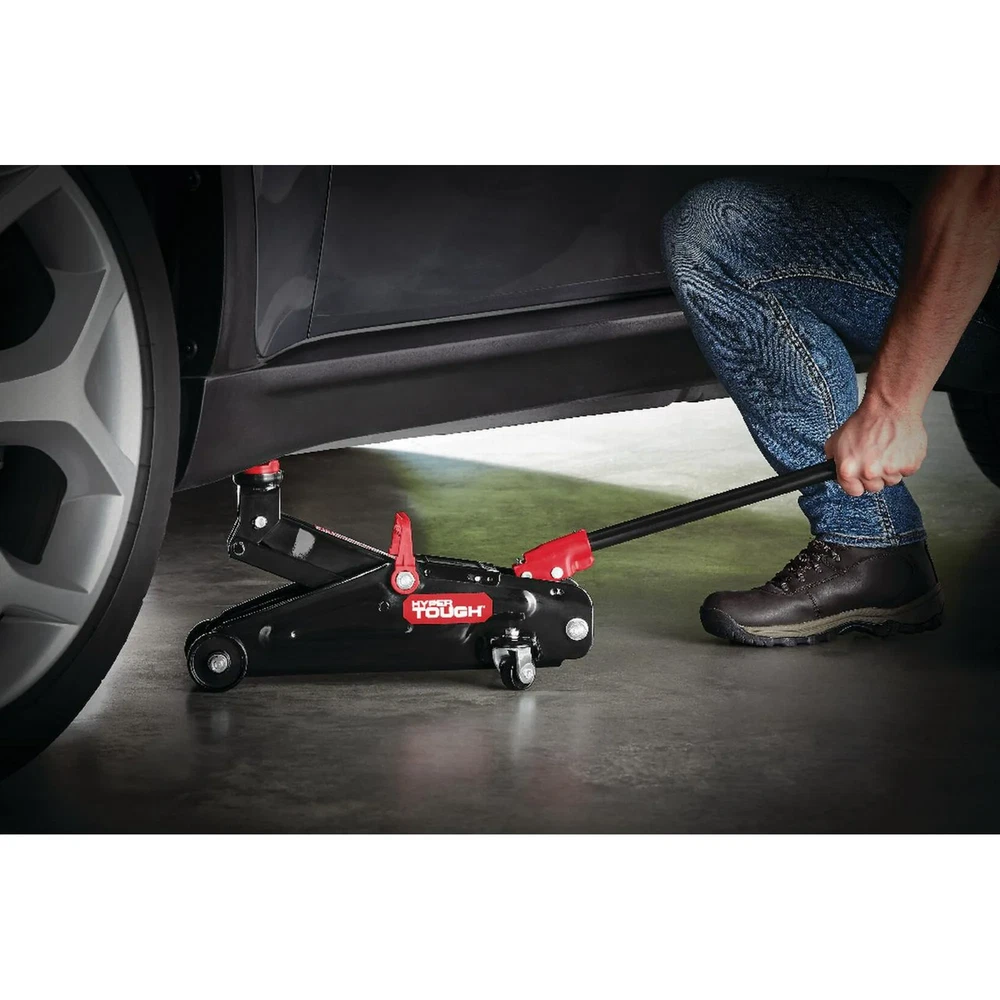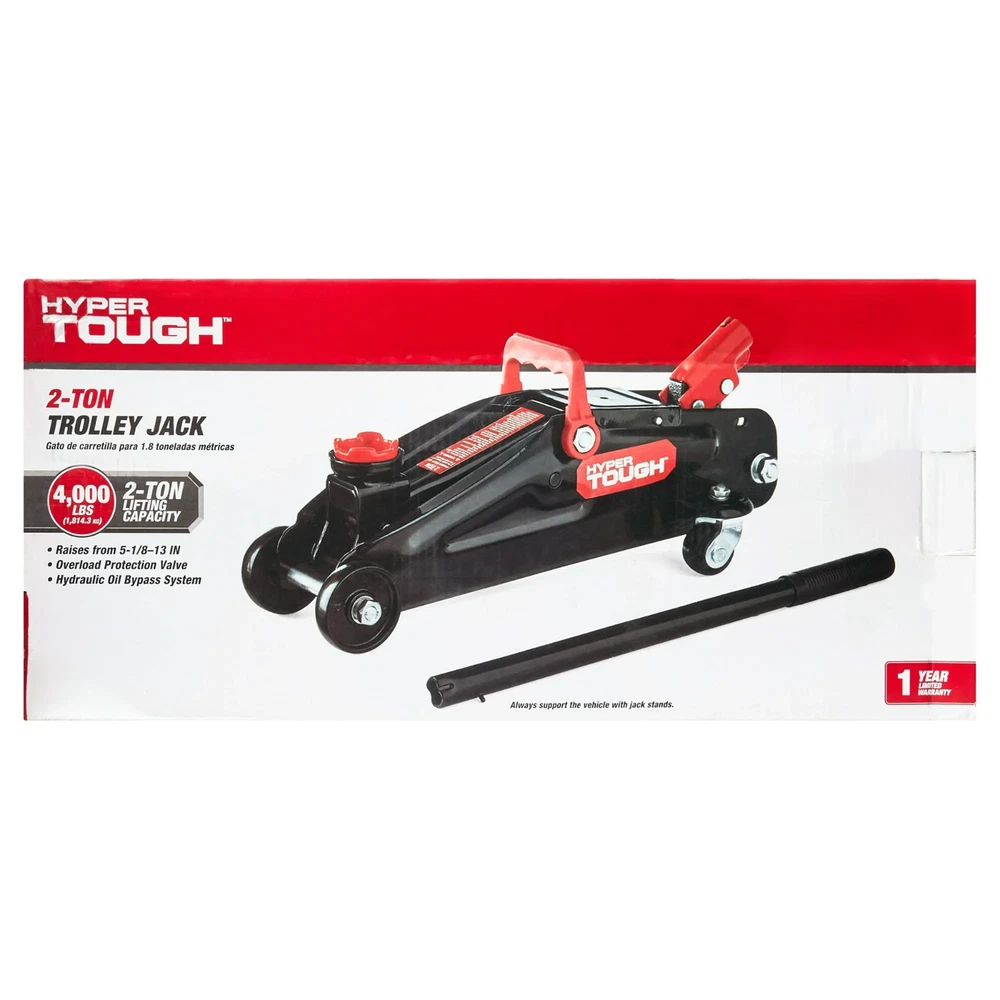 2 Ton Trolley Jack Floor Lift Car Truck Tire Change Portable Heavy Duty Garage The Hyper Tough 2-Ton Trolley Jack is a must-have accessory for all automobile owners so you can change tires or perform other vehicle maintenance with ease. With its heavy-duty steel construction, it has the strength to lift a wide range of makes and models, and the built-in safety valve protects against jack over-loading. This trolley jack features a minimum lifting height of 5-1/8" and a maximum height of 13", which is ideal for most cars, and a maximum load weight of 2 tons (4000 pounds). The swivel saddle provides smooth maneuvering and positioning while the over-pump bypass valve lets off excess pressure. The rear casters of this 2-ton trolley jack provide smooth maneuvering and positioning. It also features a lifting handle that detaches for transport and storage and a carrying handle for portability and for keeping it in your vehicle's trunk or in your garage, so you can be prepared at all times. Make vehicle maintenance easier with the Hyper Tough 2-Ton Trolley Jack. Hyper Tough helps get the job done. Whether you're new to home improvement or a DIY guru, Hyper Tough offers an assortment of affordable and reliable tools to help complete your projects. From power tools and hand tool sets to shelves and storage cases, Walmart.com has everything you need to tackle all your projects at Every Day Low Prices. Hyper Tough 2-Ton Trolley Jack Maximum loading weight: 2 tons (1814.3KG) Lifting range: 5-1/8" to 13" Heavy-duty steel construction provides stability and endurance Swivel saddle provides smooth maneuvering and positioning Carry handle for convenient transportation Rear casters provide smooth maneuvering and positioning Built-in safety valve protects against jack over-loading Hydraulic oil by-pass system protects ram from being over-extended