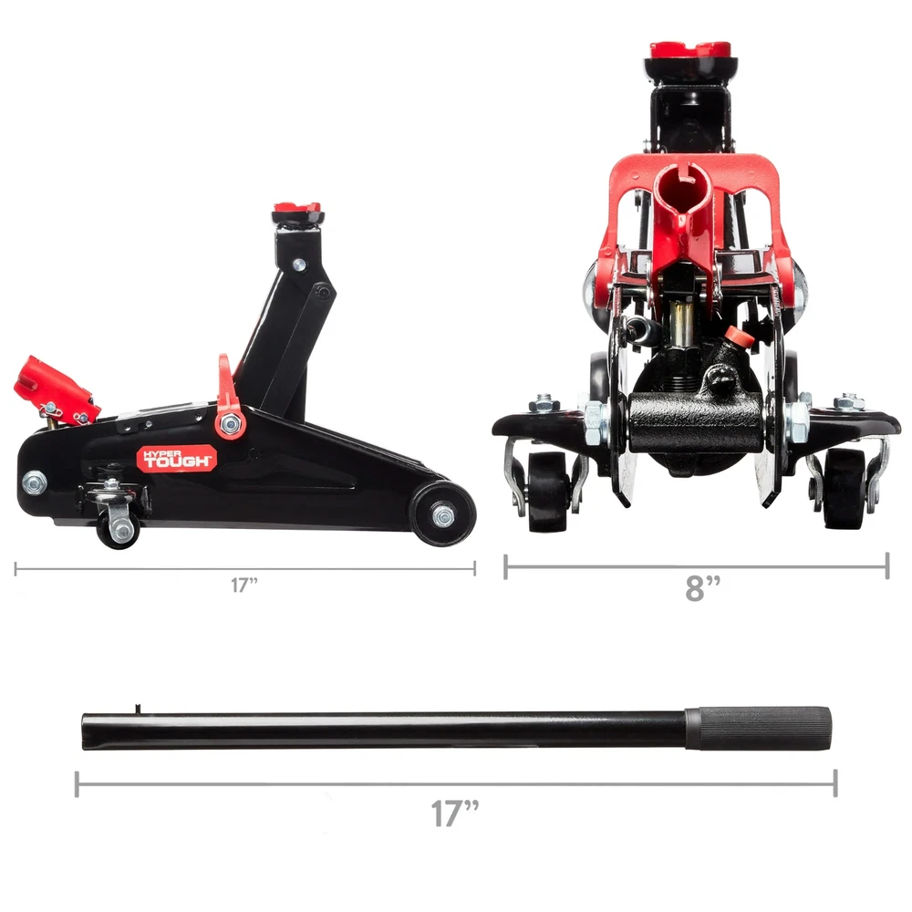 2 Ton Trolley Jack Floor Lift Car Truck Tire Change Portable Heavy Duty Garage The Hyper Tough 2-Ton Trolley Jack is a must-have accessory for all automobile owners so you can change tires or perform other vehicle maintenance with ease. With its heavy-duty steel construction, it has the strength to lift a wide range of makes and models, and the built-in safety valve protects against jack over-loading. This trolley jack features a minimum lifting height of 5-1/8" and a maximum height of 13", which is ideal for most cars, and a maximum load weight of 2 tons (4000 pounds). The swivel saddle provides smooth maneuvering and positioning while the over-pump bypass valve lets off excess pressure. The rear casters of this 2-ton trolley jack provide smooth maneuvering and positioning. It also features a lifting handle that detaches for transport and storage and a carrying handle for portability and for keeping it in your vehicle's trunk or in your garage, so you can be prepared at all times. Make vehicle maintenance easier with the Hyper Tough 2-Ton Trolley Jack. Hyper Tough helps get the job done. Whether you're new to home improvement or a DIY guru, Hyper Tough offers an assortment of affordable and reliable tools to help complete your projects. From power tools and hand tool sets to shelves and storage cases, Walmart.com has everything you need to tackle all your projects at Every Day Low Prices. Hyper Tough 2-Ton Trolley Jack Maximum loading weight: 2 tons (1814.3KG) Lifting range: 5-1/8" to 13" Heavy-duty steel construction provides stability and endurance Swivel saddle provides smooth maneuvering and positioning Carry handle for convenient transportation Rear casters provide smooth maneuvering and positioning Built-in safety valve protects against jack over-loading Hydraulic oil by-pass system protects ram from being over-extended Assembled Product Weight: 19.3 lb Assembled Product Dimensions (L x W x H): 17.25 x 7.62 x 5.50 Inches