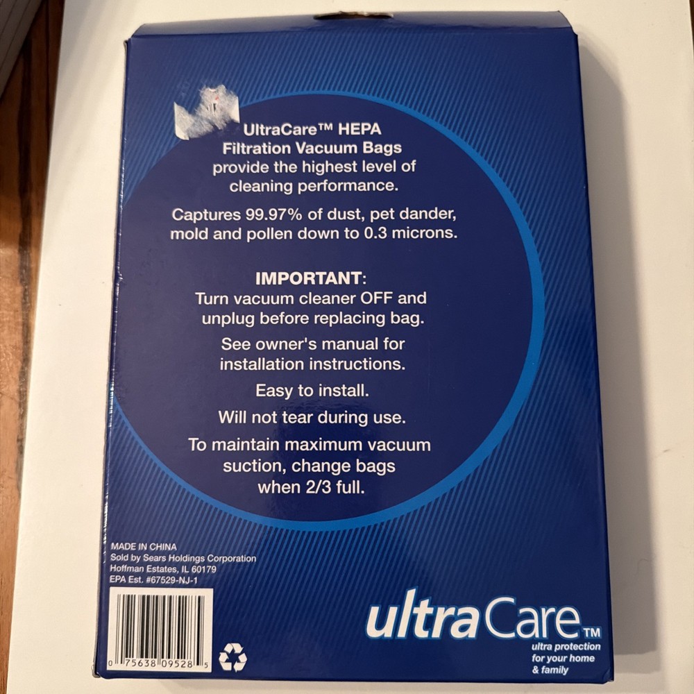 New box of 2 Ultra Care Kenmore O Canister HEPA Cloth Vacuum Bags, designed for the Kenmore O Upright vacuum cleaner model. These bags offer a high filtration rate of 99.7% to ensure efficient cleaning performance. Made of synthetic fiber material, the bags are disposable, hypoallergenic, and easy to install. With a straightforward design and compatibility with the Kenmore brand, these vacuum bags provide a convenient solution for maintaining a clean and healthy home environment.
