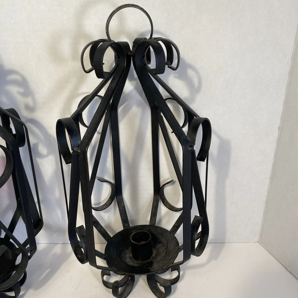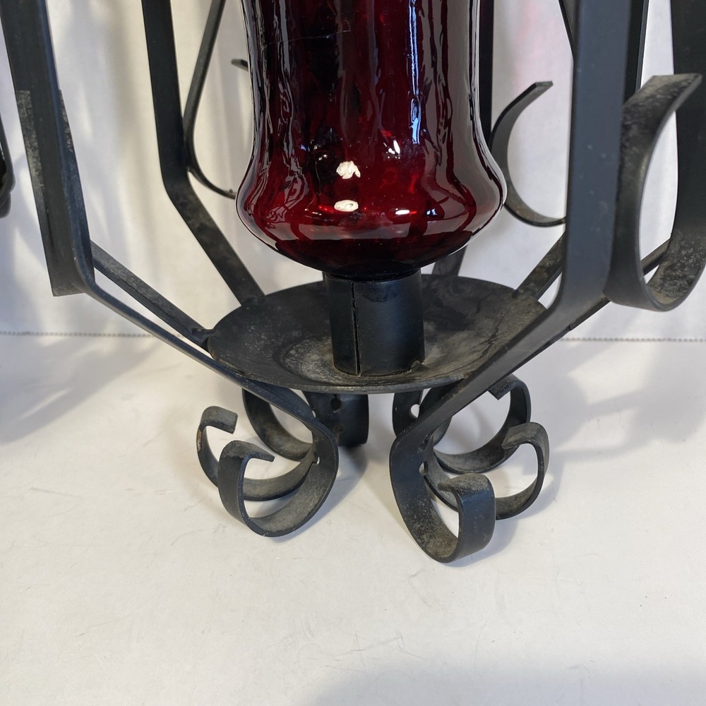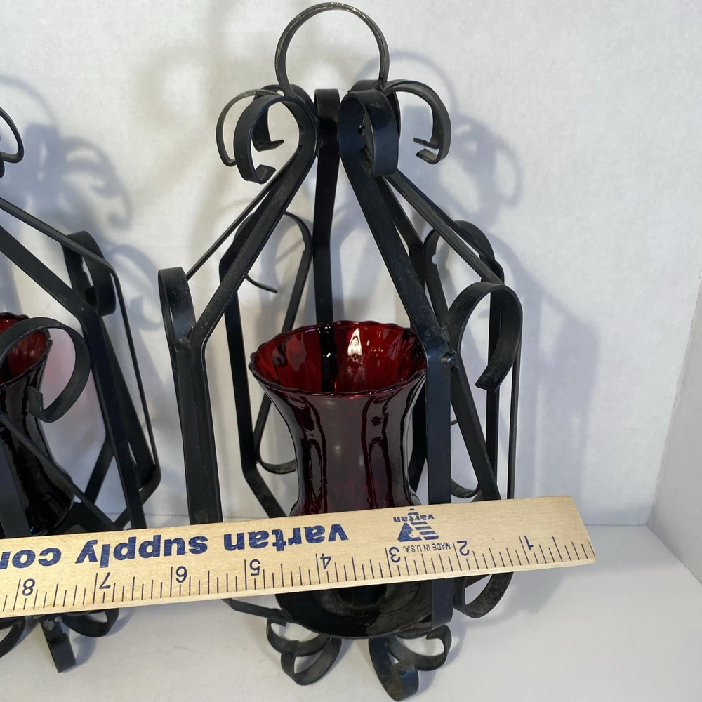 Great vintage find. Set of two black wrought iron Spanish hanging lanterns candleholders. Both have red Peg votives with grommets. Votives are in excellent condition, no chips or cracks. Wrought iron lanterns are in good condition with some patina. Please see pics carefully. All measurements are in pictures. Ships the next business day after payment.😊