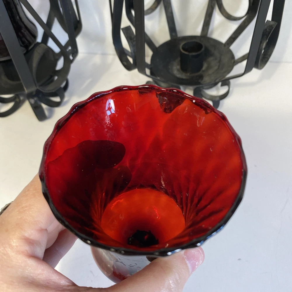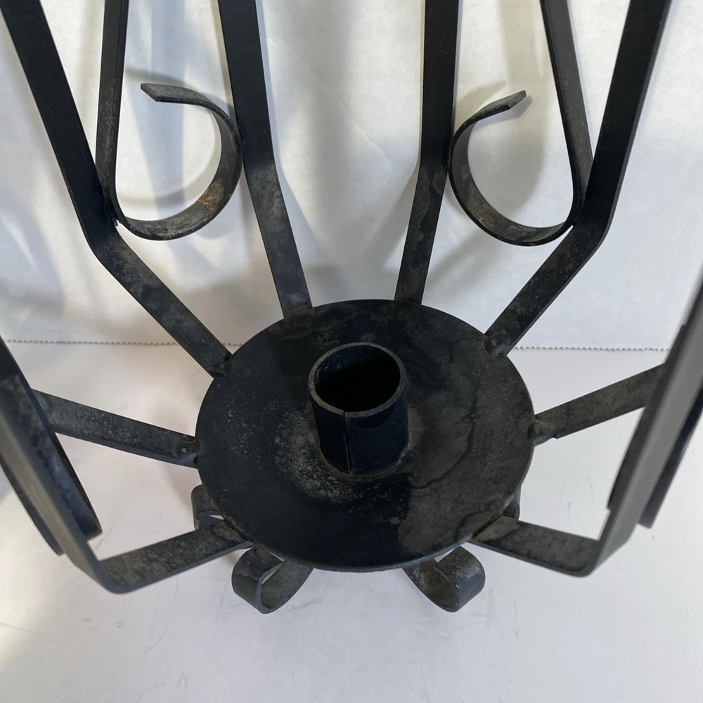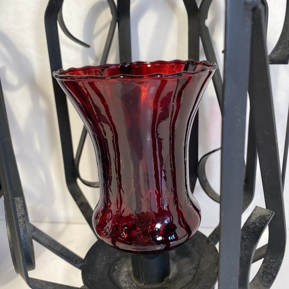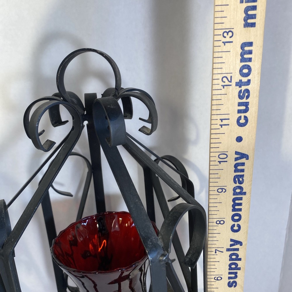 Great vintage find. Set of two black wrought iron Spanish hanging lanterns candleholders. Both have red Peg votives with grommets. Votives are in excellent condition, no chips or cracks. Wrought iron lanterns are in good condition with some patina. Please see pics carefully. All measurements are in pictures. Ships the next business day after payment.😊