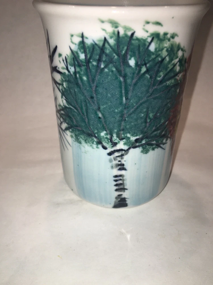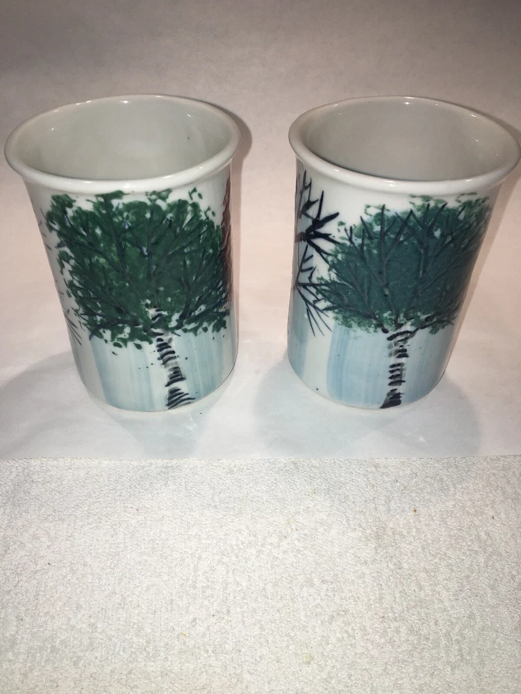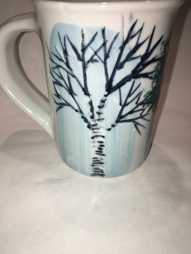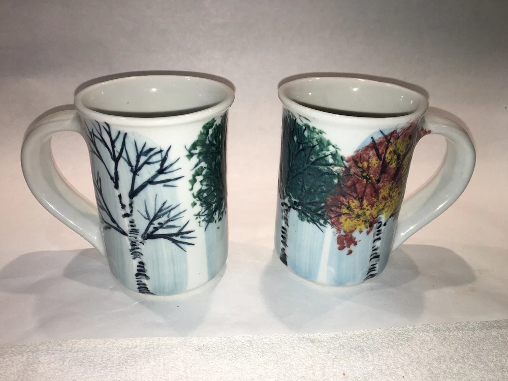 2 Vintage GEORGETOWN POTTERY Maine SEASONAL BIRCH large mugs 2007 - Discontinued For your consideration are these 2 lovely Georgetown Pottery large ceramic mugs in the discontinued Seasonal Birch pattern inspired by the beautiful birch trees that dot the Maine landscape and the seasonal changes they go through each year. If you are looking to replace broken pieces or augment your existing collection, here is your opportunity. They are in excellent preowned condition with no issues to note. Seem to have never been used! Check out the photos for more details. They measure 4.5" high x 3. 25” diameter and hold about 12 -14 oz to the rims. They are substantial mugs and will weigh about 3-4 lbs packed safely. They are signed and appear to be dated 07 for 2007. Thank you.