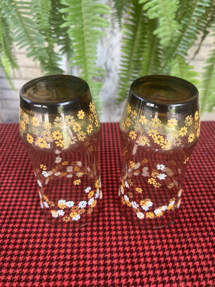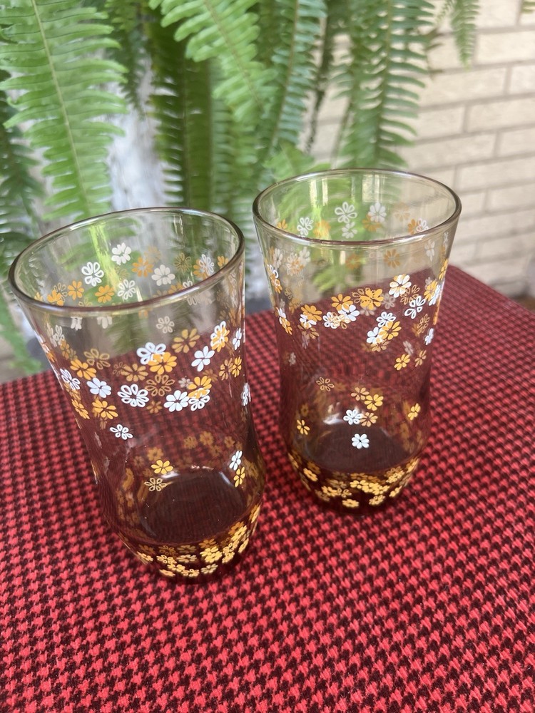 The product is a set of two vintage Libbey Amber Crazy Daisy Strawflower 12 oz tumblers drinking glasses from the 1970s. These tumbler glasses feature a stylish crazy daisy strawflower pattern in shades of amber, white, and yellow. Made of glass, these coolers are perfect for enjoying your favorite beverages in a retro and unique style. Cheers to the 1970s with these classic and colorful tumblers. Glasses are in BEAUTIFUL condition and are ready for their new home.