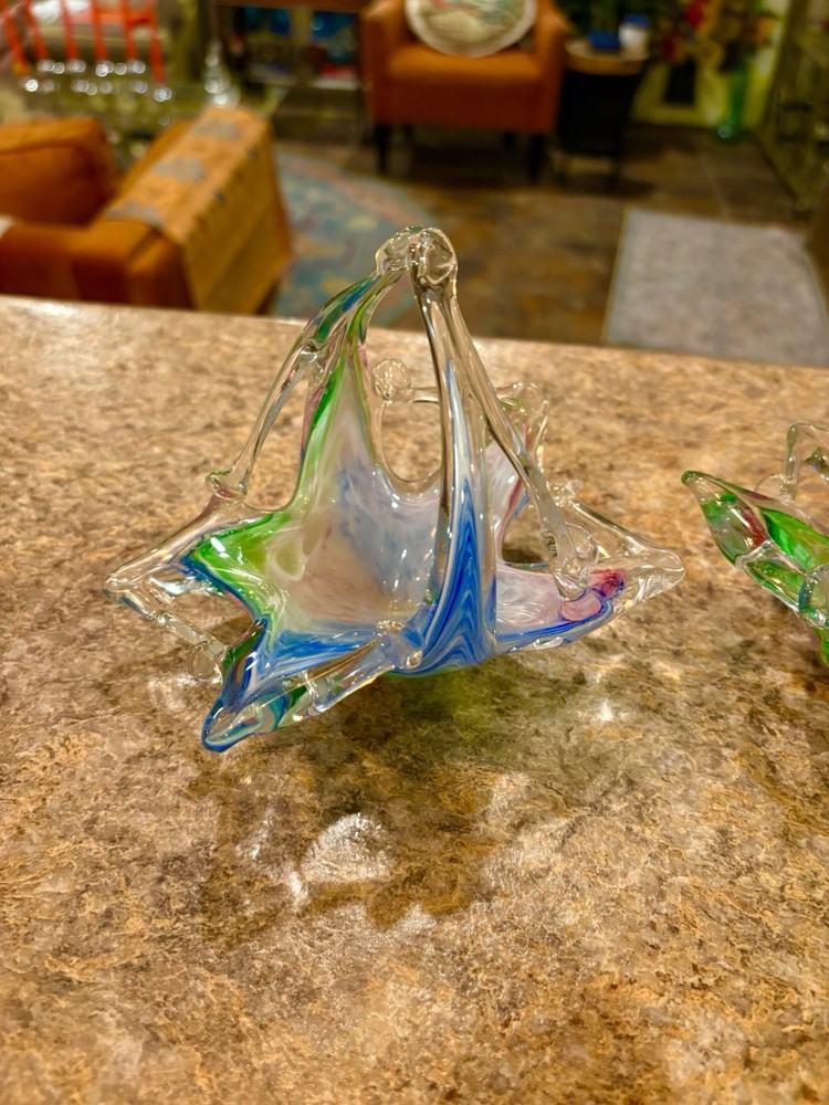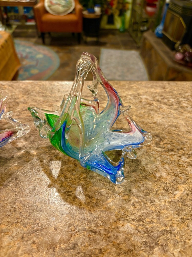 2 Vtg Murano Hand Blown Art Glass Swan Candy Trinket Bowl Dish Pink Green Blue