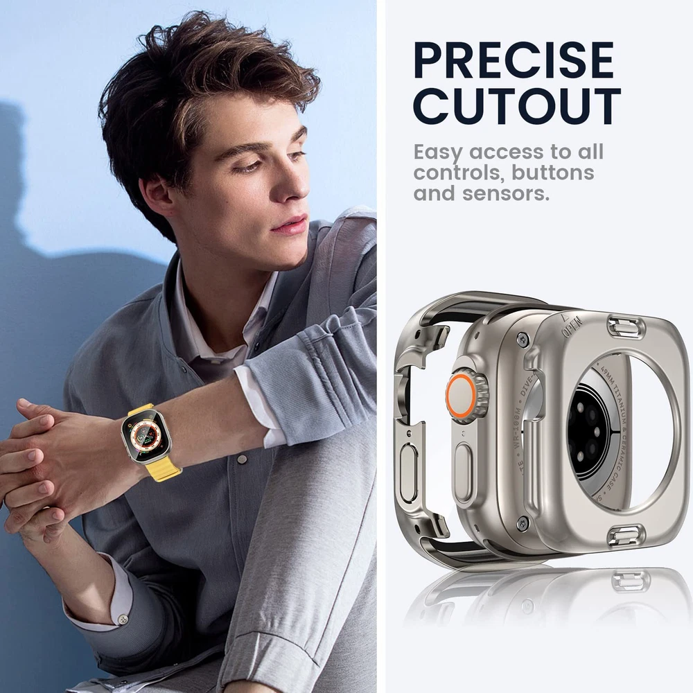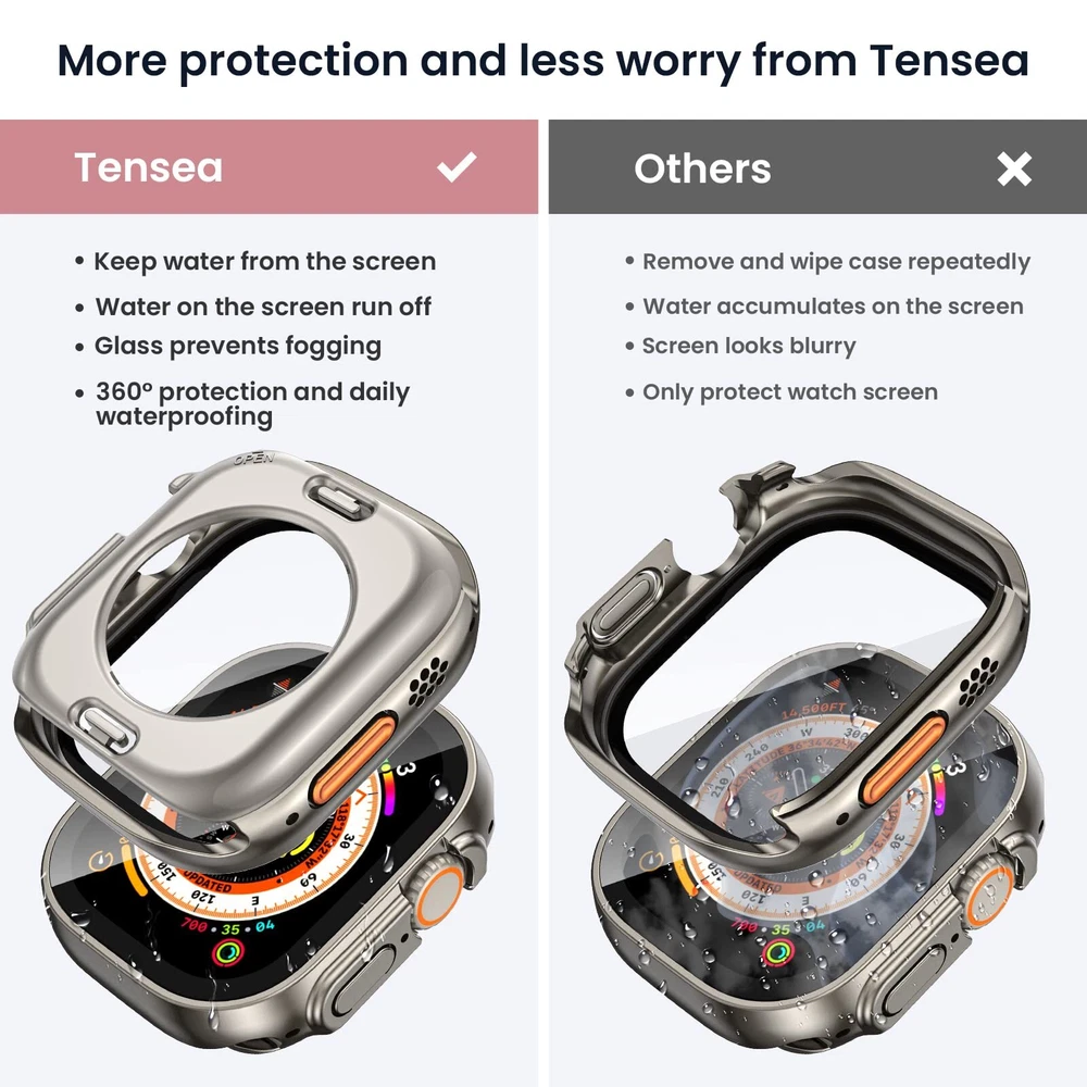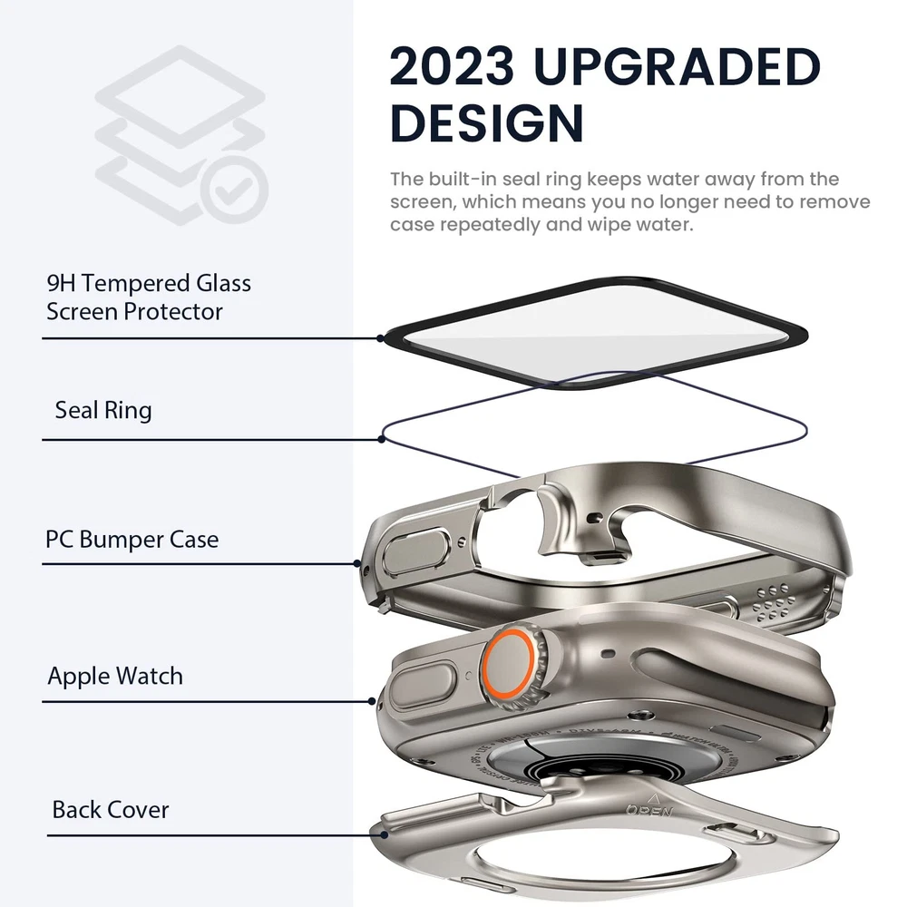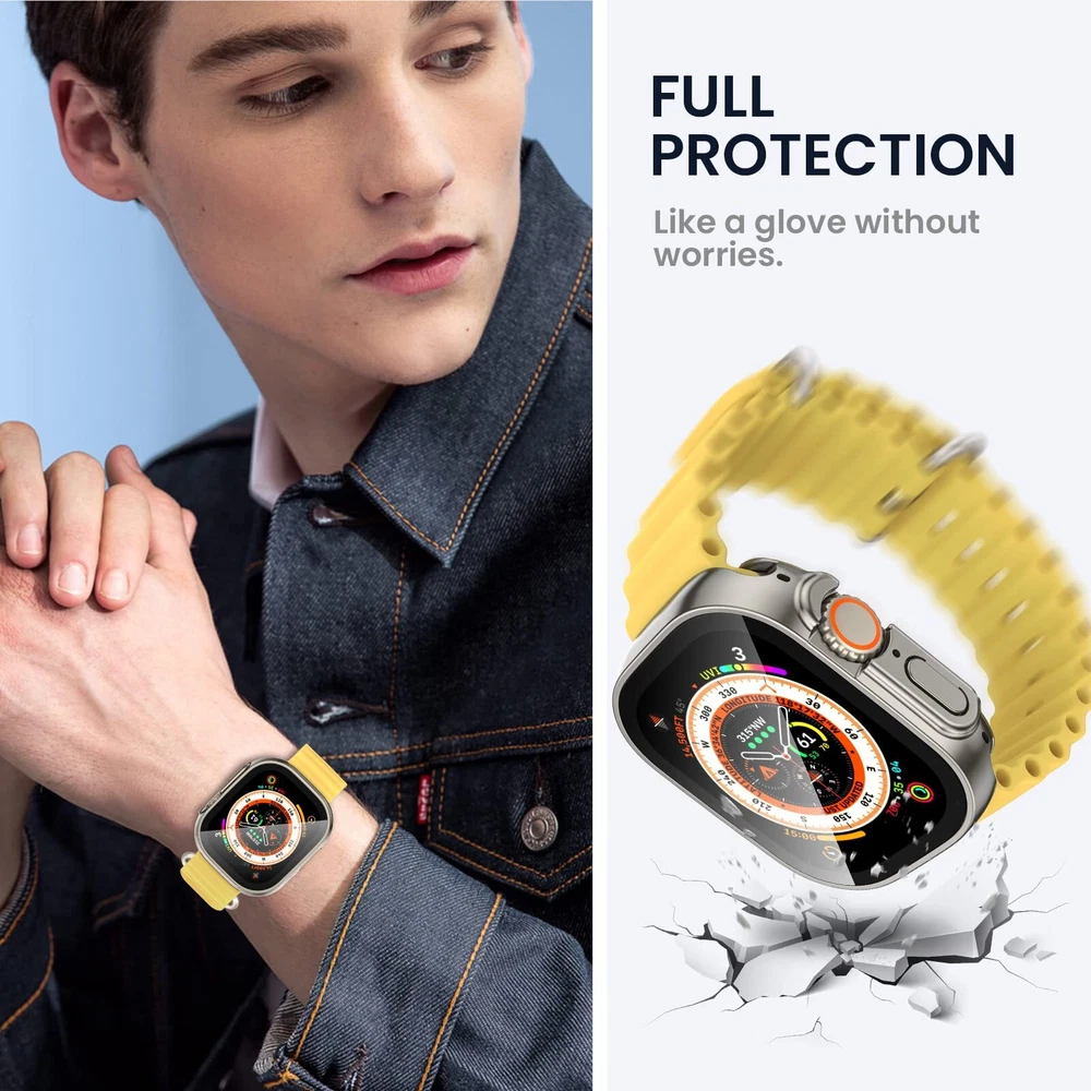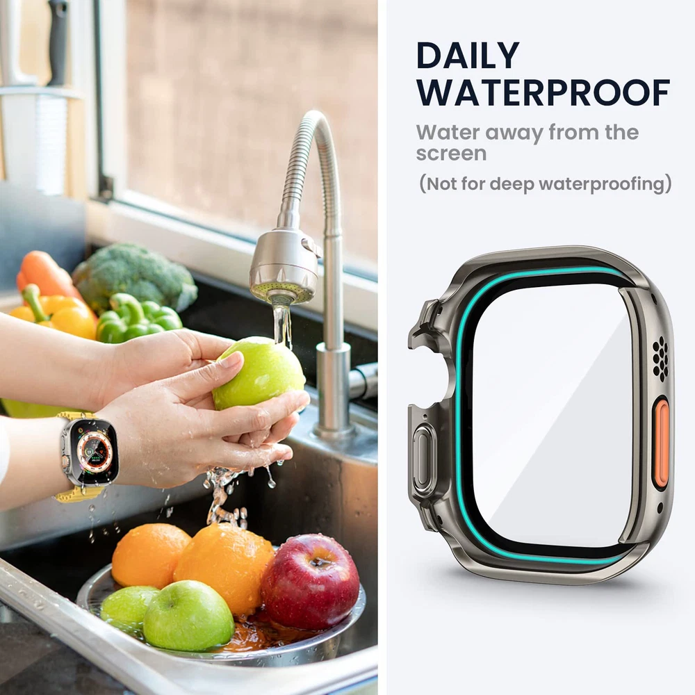 【COMPATIBILITY】The iWatch face guard with back cover is tailored to fit Apple Watch Ultra 2 49mm, Apple Watch Ultra 49mm. Bumper cover built in screen protector give nice snug fit. NOTE: Not compatible with i Watch Series 9/8/7 41mm 45mm, SE Series 6/5/4 40mm 44mm, Apple Watch SE 2nd/SE 2023 40mm 44mm, Series 3/2/1 38mm 42mm 【DAILY WATERPROOF】The apple watch Ultra 2/Ultra 49mm built-in seal ring keeps water away from screen, which means you no longer need to remove case repeatedly and wipe water. It is waterproof perfectly for daily wear - showering, hand washing, sweating, rain, etc. The oleophobic coating on the surface of tempered glass will not cause water to collect on the glass [NOTE: Not suitable for deep waterproofing, such as diving and swimming, etc] 【360° PROTECTION】This compatible iWatch Ultra2/Ultra 49mm face cover which can all around protect the front and back of your watch from dust, dirt, scratches and damages. These 9H tempered glass screen protector don’t affect the touch sensitivity. The sweatproof watch case is easy to install without removing the band 【UPGRADED MATERIAL】The anti-scratch tempered glass is 9 grade hardness. The shock-absorbing PC material is more hard, tougher and protective than traditional TPU. Glass can prevent fogging caused by the difference in temperature between cold and hot 【Easy Installation】There is installation video on our product page and instruction is included in the package.【Easy Removal】- A removal tool is included to remove the case without damaging the watch.【What You Get】1 x 49mm Apple Watch front case, 1 x back cover, 1 x removal tool, 1 x cleaning tool. ( Smart watch, band and charger are not included ) If there are any problems with it, please get in touch with us without hesitation
