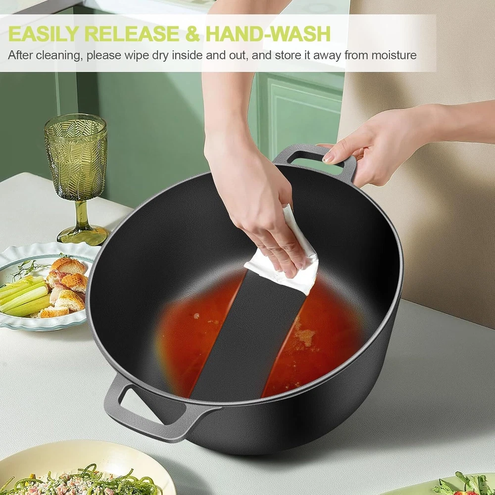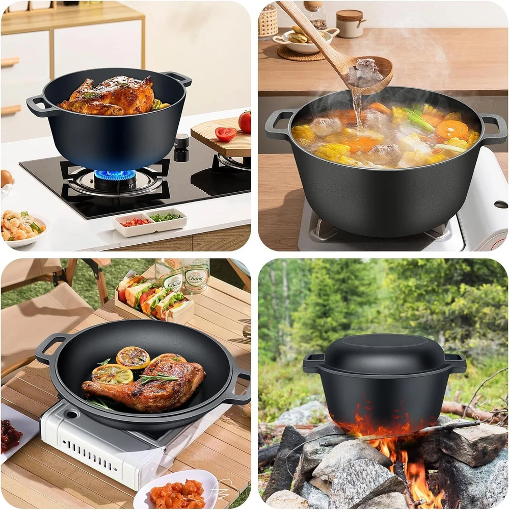 🍳【2-In-1 CAST IRON DUTCH OVEN】The 2-In-1 cast iron dutch oven pot with skillet lid has been burned with high-quality vegetable oil,(no synthetic coatings or chemicals). The shallow skillet that can be used as a lid. The domed pot can be used as a bean pot. Cast iron skillets is tend to get better with age, the more you use it, the better it performs 🥘【ENCLOSED THERMAL CIRCLE】This iron dutch oven pot is design with circulating shower type lid, the raised design of the pot cover allows water vapor to circulate in the pot and locks the nutrition and moisture of the food, evenly fall on the food to maintain the original nutrition, possess pretty heat retention performance. 🔥【SLEEK & ERGONOMIC DESIGN】Cast iron skillet set come with 2 integrated helper handles on each pot and skillet to help you transport your family recipes smoothly and safely to the dinner table. You can easily lift and move the cast iron pot with lid more conveniently. Please notice that wear cooking gloves (not included) when moving pot and skillet as the handle is not anti-scalding. 🧳【SUITABLE FOR ALL STOVES】Our premium Iron Dutch oven is designed to shine on various stovetops, including gas, electric, ceramic, and even induction. Plus, it's oven safe up to 500℉, offering an exceptional range of cooking options. 🧽【EASY TO CLEAN AND MAINTAIN】Just wash the cooker with warm soapy water, and then dry it thoroughly before storage. To protect the appearance of luster, avoid using citrus cleaners. Note: Do not use metal pads or utensils, otherwise the enamel coating will be scratched or broken.