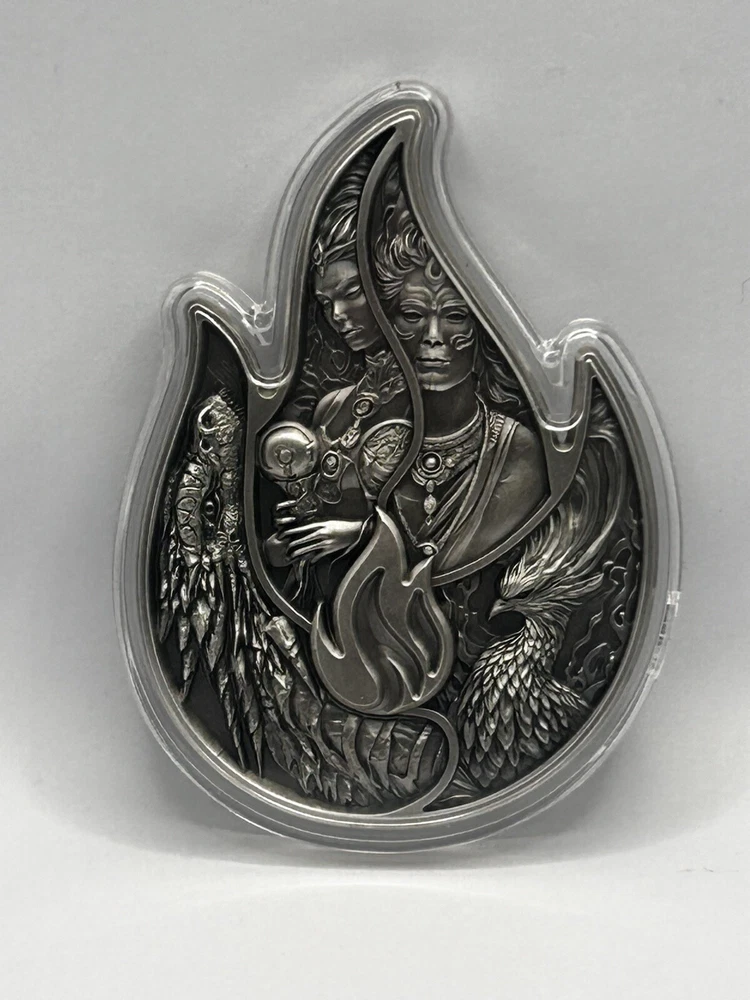 The product is a 2 oz silver Stacker Eternal Flame coin with a fineness of 999. It is minted by Today LTD and comes with certification. The item has dimensions of 7" in height, 7" in length, and 5" in width, with a weight of 1 oz. The design features an eternal flame motif.