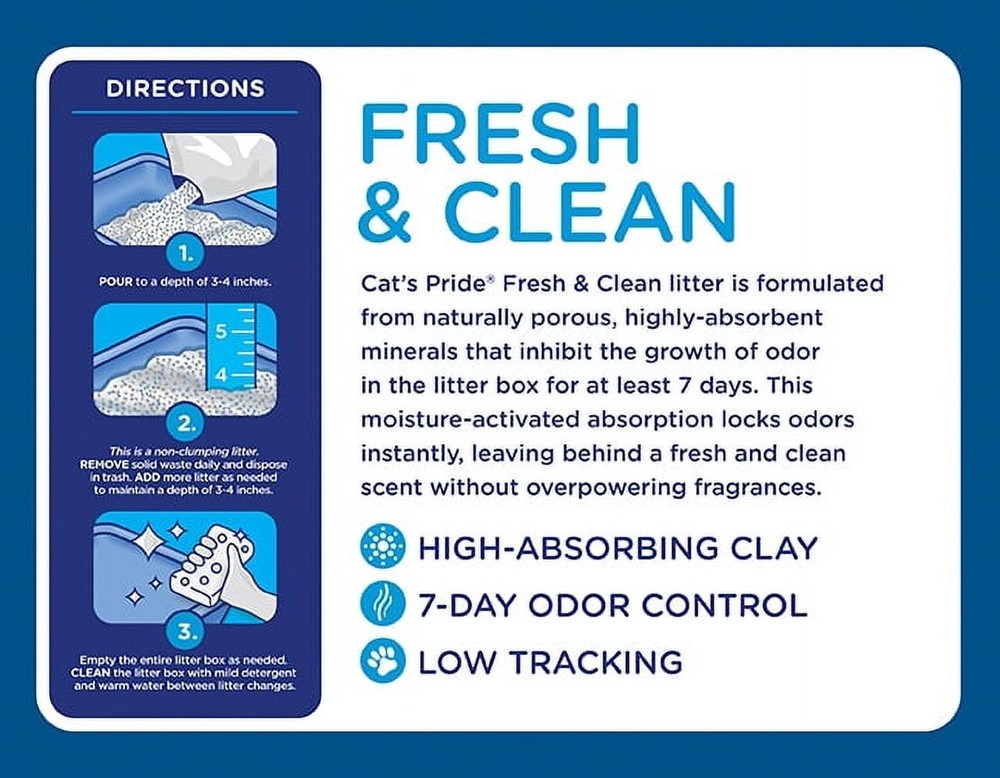 Cat’s Pride Fresh & Clean premium scented non-clumping litter features a highly-absorbent clay formulation designed to keep your home fresh & clean. With 7 days of odor control, low tracking, a fresh scent, and a premium formulation, this litter provides the perfect solution for a remarkable, hassle-free cleanup. Premium High-Absorbing Clay 7-Day Odor Control Low Tracking