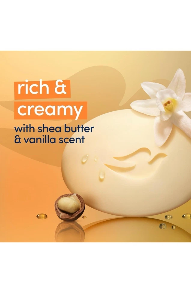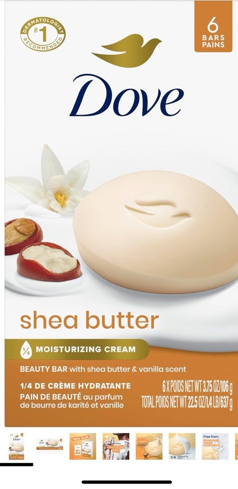 The Dove Beauty Bar Soap Shea Butter 6 Count is a set of six regular-sized bars of soap by the brand Dove. Each bar is infused with shea butter and has a vanilla scent, making it perfect for adult use. Manufactured by Unilever in the USA, these bars weigh 3.75 oz. each and are ideal for keeping your skin moisturized and healthy during bath time.