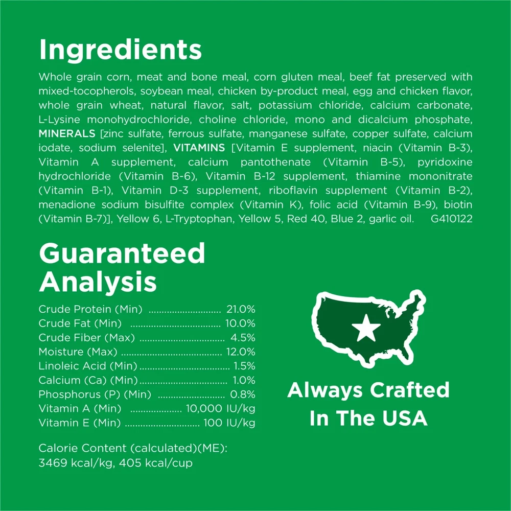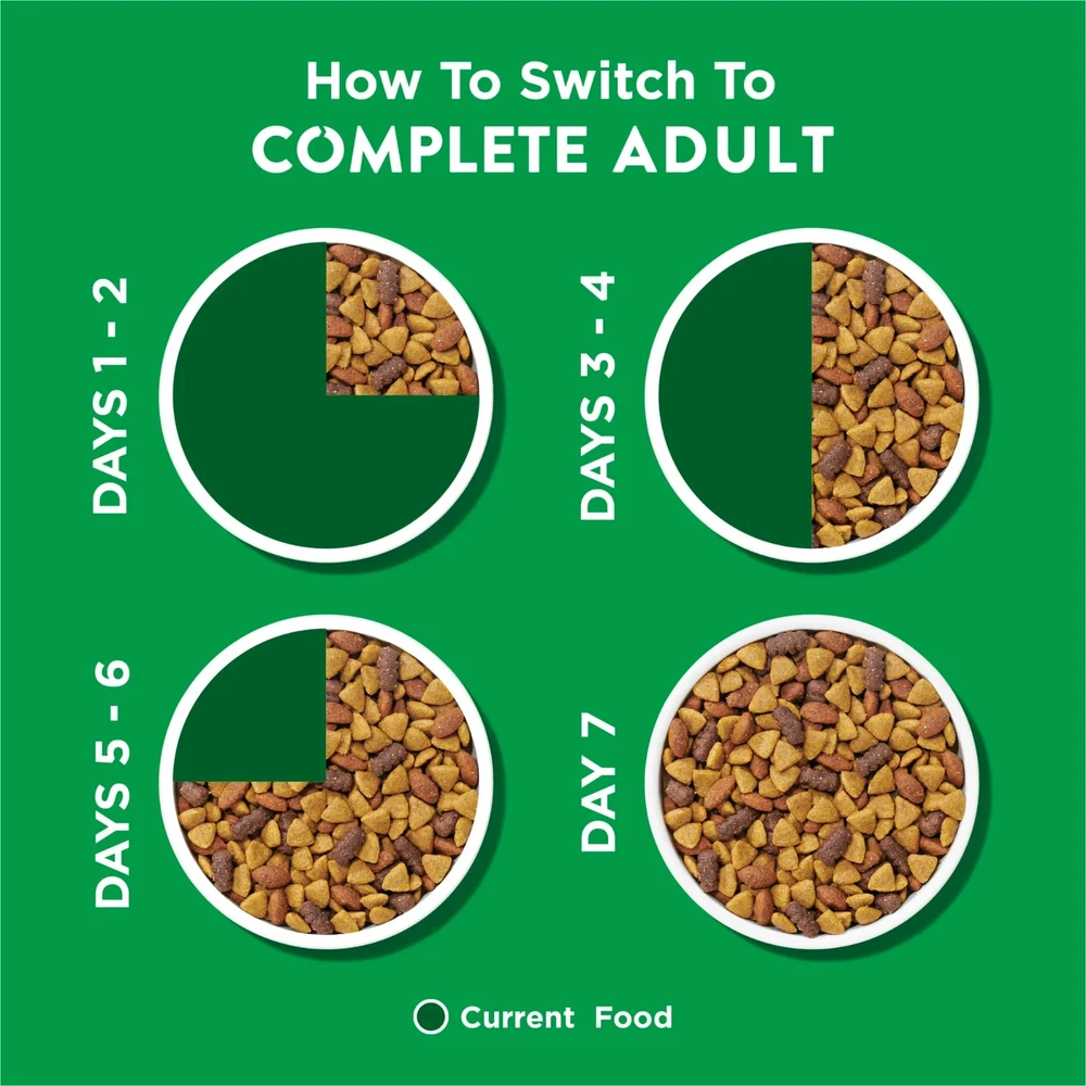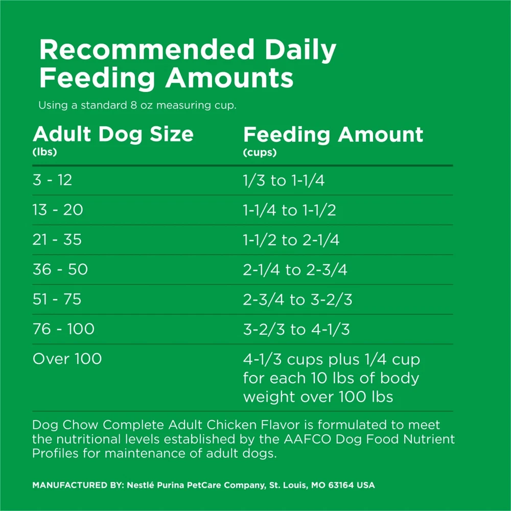 Purina Dog Chow Chicken Flavor Dry Dog Food, This delicious, wholesome dog food made with high quality ingredients is carefully crafted to support your dog's healthy nutrition and has a taste dogs love. This Purina dry dog food is made to provide the 100 percent complete and balanced nutrition adult dogs need to help them live long, healthy lives. Nutritious ingredients and high quality protein for dogs support strong muscles for an active lifestyle that helps keep your dog happy and healthy, while crunchy dog kibble Purina Dog Chow Chicken Flavor Dry Dog Food, 44 lb Bag 100 percent complete and balanced dry dog food for adult dogs Hard dog food featuring 23 vitamins and minerals for dogs to help support a healthy, active life Easily digestible Purina Dog Chow chicken flavor dog food Crunchy dog kibble helps clean teeth Highly digestible wholesome dog food formula Animal lifestage Adult Weight 44 lb Pet food flavor Chicken Meat type Chicken Pet food condition Dry Shelf life 546 days Animal health concern Immune Support, Digestive Care Brand Dog Chow Pet food form Kibble Instructions The recommended feeding amounts are based on using a standard 8 oz/250 ml measuring cup which contains approximately 116 g of Dog Chow Complete Adult Chicken Flavor. Amounts are recommended for an average adult dog with normal activity. Remember food intake requirements vary depending on age, activity and environment, and should be adjusted accordingly.When switching to Dog Chow from another food, please allow 7 - 10 days for the transition. Gradually add more Dog Chow and less of the previous food to your pet’s dish each day until the changeover is complete. This gradual transition will help avoid dietary upsets. Feeding Instructions The recommended feeding amounts are based on using a standard 8 oz/250 ml measuring cup which contains approximately 116 g of Dog Chow Complete Adult Chicken Flavor. Amounts are recommended for an average adult dog with normal activity. Remember food intake requirements vary depending on age, activity and environment, and should be adjusted accordingly. Provide adequate fresh water in a clean container daily. For your pet's health, see your veterinarian regularly.