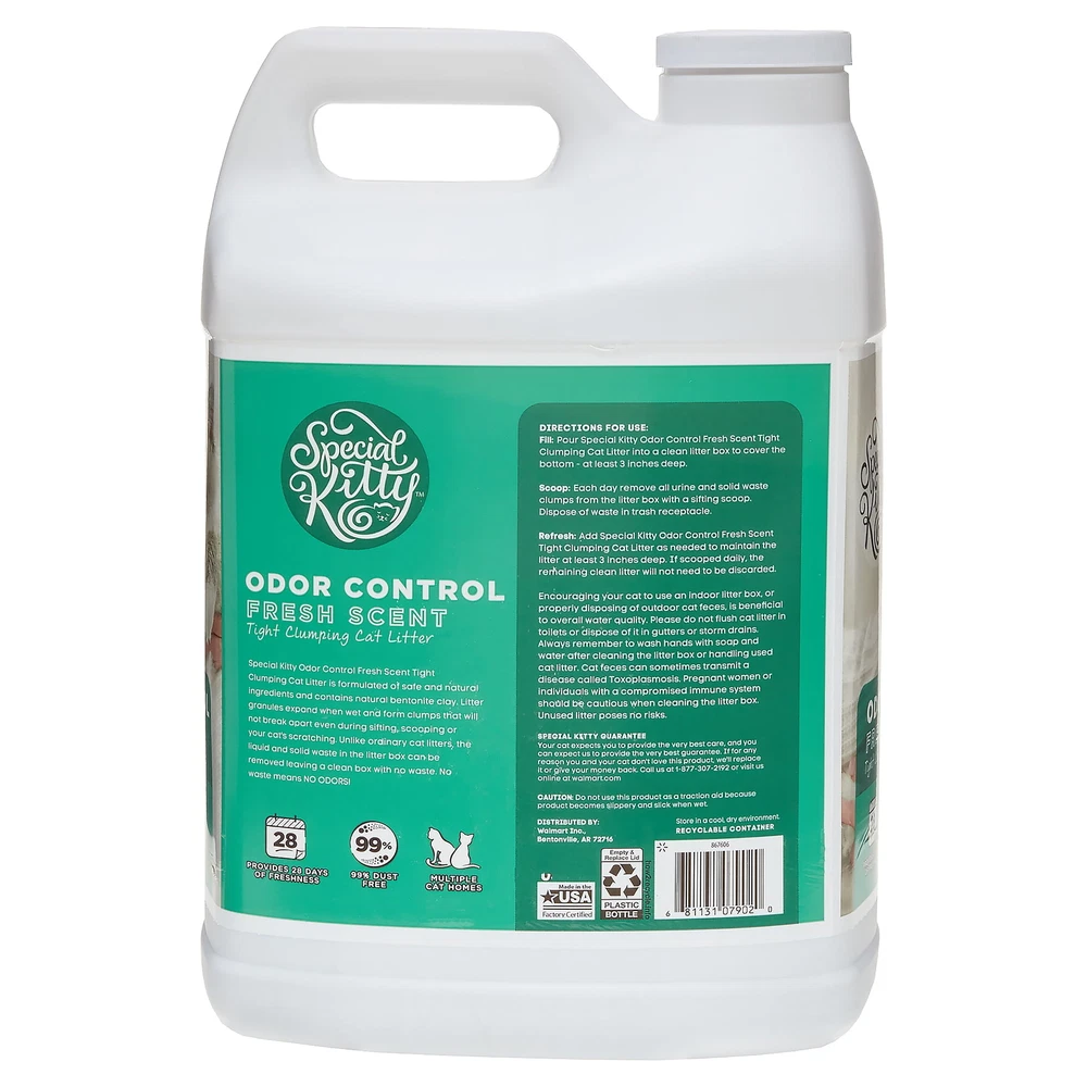 Special Kitty Scoopable Tight Clumping Cat Litter, Fresh Scent provides long-lasting freshness to keep your catâs personal area exactly that. Fill your catâs box with a fresh set of litter and notice the difference immediately when you pour, as this litter is 99% dust-free, and is sure to keep your air clear every time you refill your catâs box. This 20-pound jug includes a handle for convenient maneuverability and easy pouring, as well as the see-through build helps you know when itâs time to pick up some more! Grab a jug of the Special Kitty Scoopable Tight Clumping Cat Litter, Fresh Scent and enjoy the new-found simplicity of tending to your catâs needs.Special Kitty Promise: At Special Kitty we know that cats rule, and your cat is confident you would only serve her the very best food. That's why each one of our high-quality varieties not only uses wholesome ingredients that support your cat's health, but taste so delicious your cat may actually reward you with a smile. You can always trust Special Kitty to provide nutritious premium products that your cat will crave. It's the Special Kitty promise to you and your cat. Special Kitty Odor Control Tight Clumping Cat Litter, Fresh Scent, 20 lb: Long-lasting fresh-scented odor control to keep your home smelling fresh 99% dust free for a cleaner pour The litter's tight clumping formula makes scooping your cat's box a breeze Great for multiple cats 20-pound jug includes a handle for convenient maneuverability and easy pouring Recyclable plastic container Special Kitty Scoopable Tight Clumping Cat Litter, Fresh Scent, 20 lb:Long-lasting fresh-scented odor control to keep your home smelling fresh99% dust free for a cleaner pourThe litter's tight clumping formula makes scooping your cat's box a breezeGreat for multiple cats20-pound jug includes a handle for convenient maneuverability and easy pouringthe see-through build helps you know when itâs time to pick up some more We work with multiple logistics providers such as FedEx, UPS, USPS, onTrac, LaserShip, etc. We will choose the fastest and most suitable logistics provider to ship according to your address. We attach great importance to customer satisfaction and strive to provide you with the best shopping experience. If you have any questions or concerns about our products/services, please feel free to contact us. We will listen to your feedback and solve any problems you may encounter. Your satisfaction is our top priority, thank you for your patronage. After you place an order, we will arrange for it to be shipped as soon as possible.