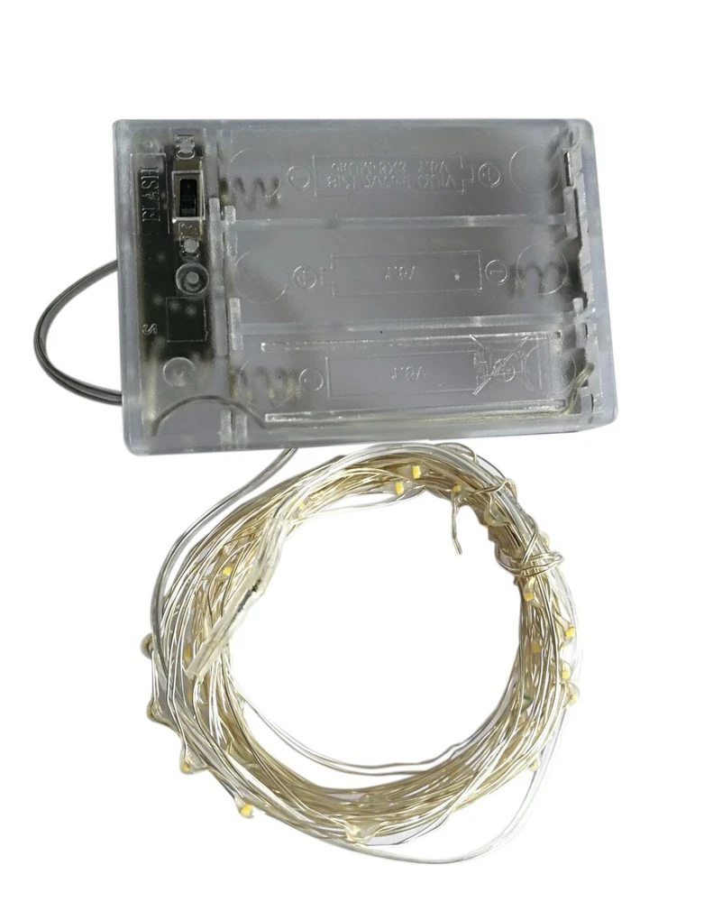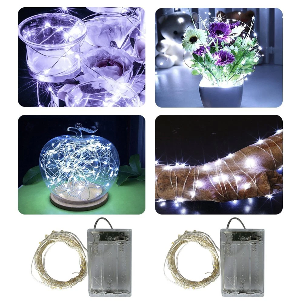 packaging: pack of 2 for each bag 3-modal state: Constant lighting up--lights flash--turn off Technical data: LED color: cool white (5800-6300K) number of LED: 50 the lengthe of Silver wire: 5 meters the distance between electric wire and battery holder: 10cm color of cable: transparency input voltage: 4.5V safety and stability: low consumption and high efficiency. No overheating after being used for several hours. After being used for 24 hours, you can touch it safely. Ideal light decorations light-weight and flexible electric wire high-quality copper wire, be thin and flexible. Easy to bend and twine plants, handrail, scutcheon, furniture and others portable: with small battery compartment, you can carry lights comfortably and decorate anywhere you want no electric charge power supplyed by 3* AA battery, easy to change cool white LED with 5800-6300K provides romantic atmosphere. Perfect decoration for Christmas, parties and restaurants. Warning: Because the battery box isn't waterproof, please keep away from water. Ensure its button cell not to be swallowed by children Multiple Lighting Modes: Customize the enchantment of the fairy light strings to match your preferences with a variety of lighting modes. Select between constant illumination, twinkling fairy lights, or off-state, allowing you to set the perfect mood for a range of occasions. Dual String Lights: Enjoy the versatility of two sets of Silver Wire Fairy Lights, each measuring 16.4 feet (5 meters) in length. These strings are adorned with 50 micro LEDs and feature a battery case for easy placement and decoration.(3 AA batteriesnot included) Flexible Decorative Possibilities: The slim silver wire fairy light design ensures easy hiding and portability, allowing you to effortlessly adorn and enhance any space. Decorate with finesse, whether it's draping around objects or intertwining with plants and furniture. Safety and Energy Efficiency: Experience peace of mind with low power consumption and high efficiency. These string lights are designed to remain cool, preventing overheating even after prolonged use. Consume less electricity while enjoying enduring luminance. Indoor Elegance: Elevate indoor settings with the warm, romantic, and relaxed atmosphere created by these fairy lights. Ideal for enhancing the charm of courtyards, gardens, hallways, bedrooms, weddings, parties, and festive occasions like Halloween and Christmas.