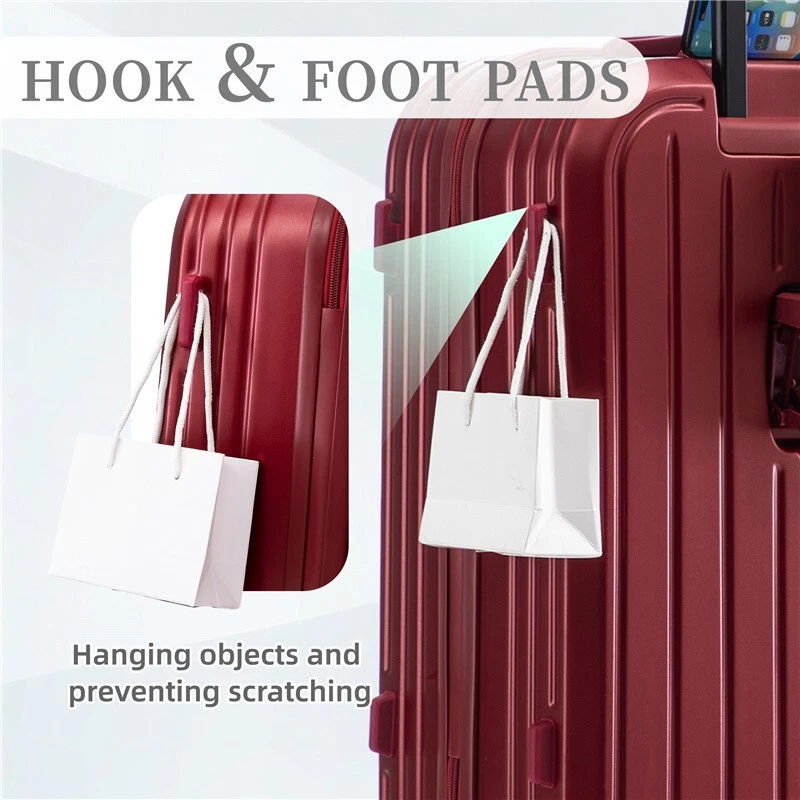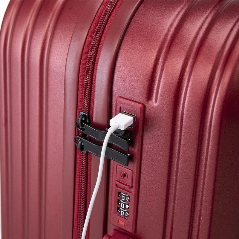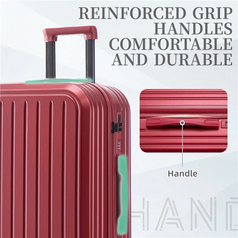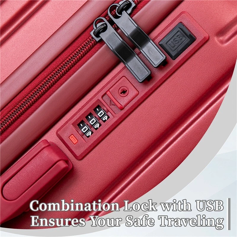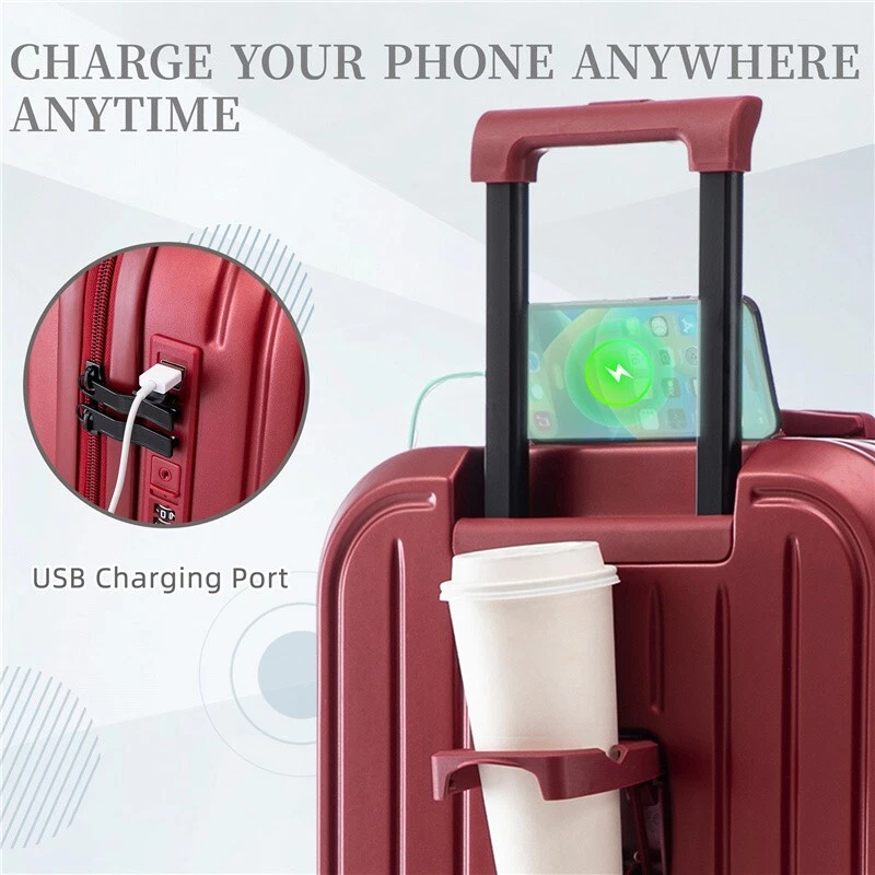 Features and Details: Durable & Waterproof: Our family suitcase set features sturdy watertight ABS external, which is easy to clean and long-term use. It can carry a large weight while having four swivel wheels that can move effortlessly in any direction. Built-in USB Port: The Carry-On features a built-in USB port, Type C port, provide quick connection to your portable electronic device for a quick charge.Not worried about the phone is out of power any more. Multifunctional Holder Design: Especially designed water cup holder, and the handle hook, all is to provide a comfortable and convenient travel experience. Retractable Handle: The ergonomically designed push-button 3-step adjustable telescopic handle makes opening and closing a breeze. What's more, it fits any size hand and reduces stress when climbing stairs. Modern Appearance: The stylish and smooth vertical stripe design of the rolling luggage makes it more resistant to pressure and wear and brings a good mood to your journey. It includes four molded side feet, they allow the luggage to remain upright even when standing on its side. Specification: Color: BroWINE RED Material: ABS Product Dimensions: 19.3"L × 11.4"W ×29.5"H Weight (lbs.): 22.96