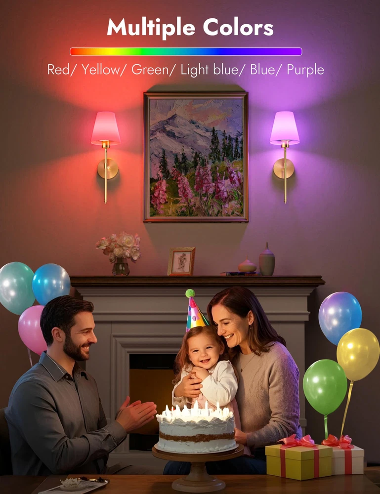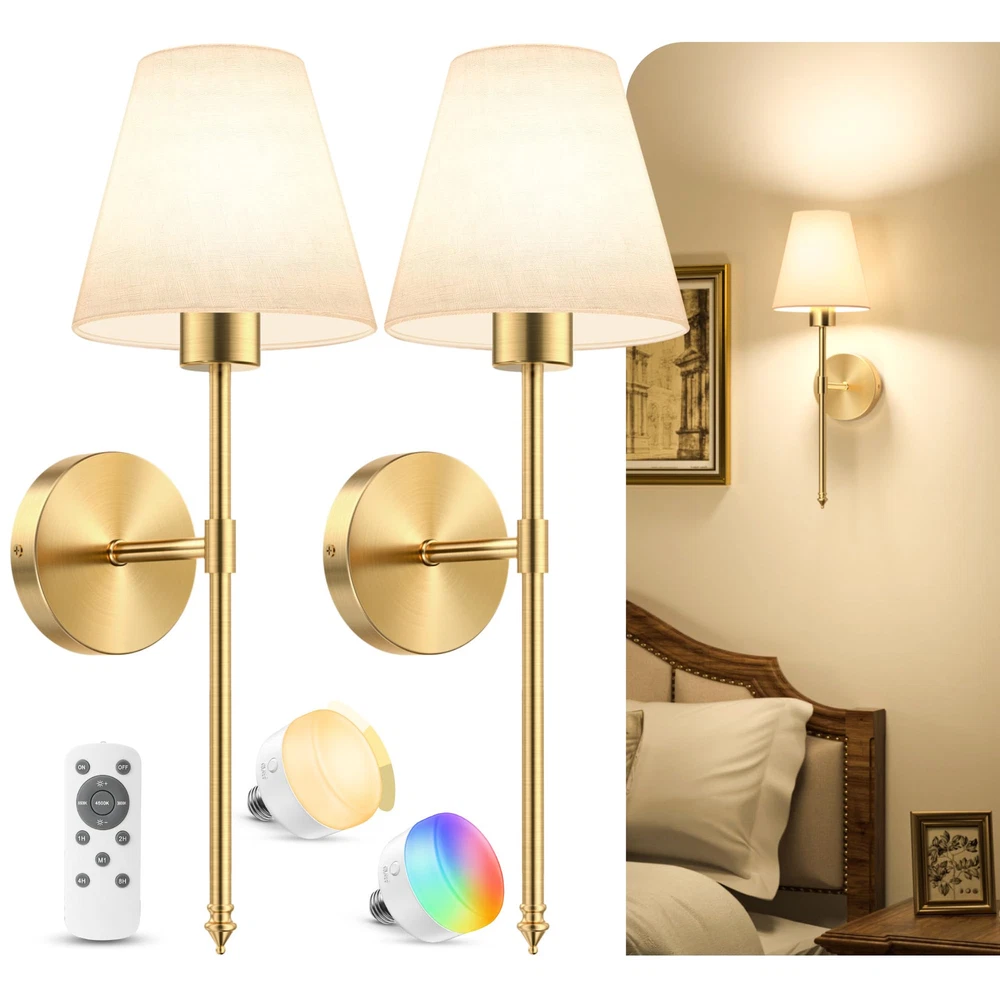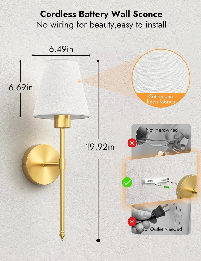 20'' Battery Operated Wall Sconces Set of Two, Wireless Wall Sconces with Remote and Bulbs, 9 Colors Battery Powered Wall Lights, Rechargeable Wall Lamps for Bedroom Living Room(Gold) 【Wireless & Easy to Install】wireless sconces set of 2 are battery - powered, coming with two rechargeable 5200mAH LED bulb. Wall sconces set of two battery operated eliminating the hassle of wiring within the walls, conveniently for users who don't want to damage the wall surface and those without pre - installed electrical wiring, or renters. Sconces wall lighting battery operated are suitable for bedroom, living room, hallway, bathroom, kitchen, and stairway etc, creating an elegant and stylish atmosphere for your indoor space. 【9 Lighting Colors】Our battery powered sconces set of 2 offers diverse lighting options. It has three color temperatures: 3000K creates a cozy and inviting atmosphere, 4000K provides a clear and natural illumination, and 6000K is bright and energetic. There are also six RGB colors to switch between. Whether for a party or daily use, you can easily customize the lighting to suit different moods and occasions. With the gold sconces wall decor set of 2, creating the perfect lighting environment is a breeze. 【Dimmable & Energy Saving】300 Lumen/5200 mAH. The battery powered wall sconce offers four brightness levels: 25%, 50%, 75%, and 100%. Customize the light according to your needs and desired atmosphere. Whether for a relaxing night or tasks, switch between settings easily. The working time of the gold wall lights battery operated depend on brightness. It lasts 72 hours at the lowest brightness and 25 hours at the highest. 【Timer and Memory Function】You can easily set a timer for wall lamps battery operated to automatically turn off after 1 to 8 hours. This helps extend the battery life and reduces unnecessary power consumption. Even better, when you turn off and then turn on this rechargeable wall sconces set of 2 again, it will remember the color and brightness settings you last used, eliminating the hassle of re - configuration. 【100% Satisfaction Service】: We proudly stand behind all of our products 100% and offer a full 2-year service for our rechargeable wall lights. This will cover you if the wireless lights for wall indoor stop working or there are any defects within those 2 years. 【100% Satisfaction Service】We proudly stand behind all of our products 100% and offer a full 2-years service for our wall sconces. This will cover you if the gold wall lights stop working or there are any defects within those 2 years.