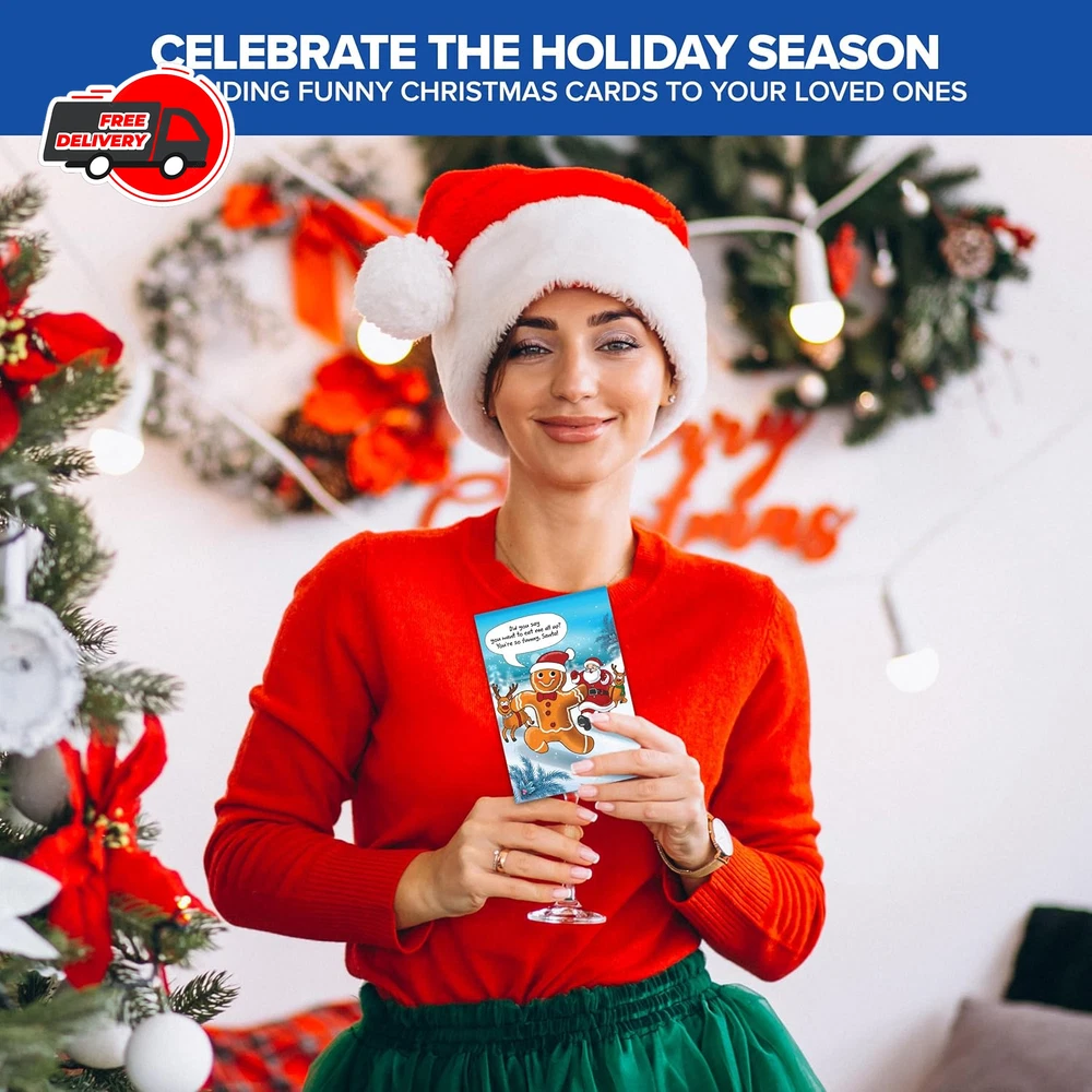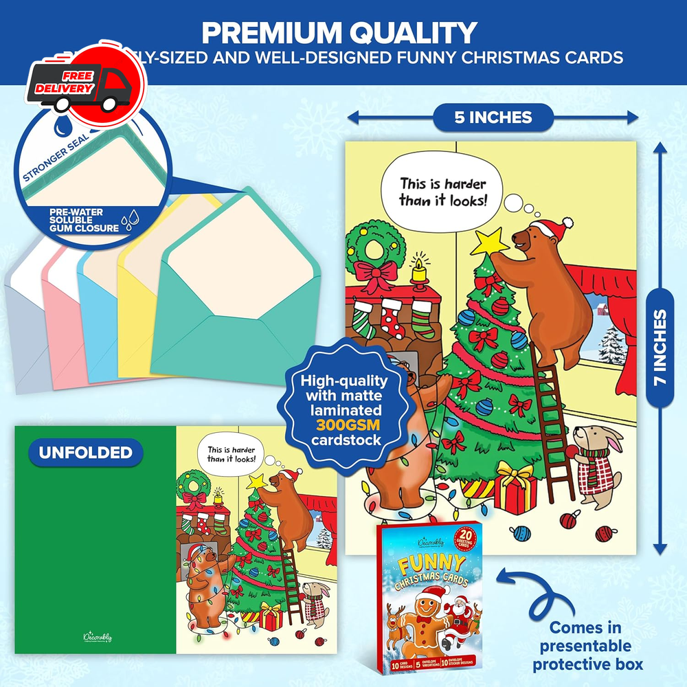 EXPRESS HOLIDAY HUMOR - These 5x7in funny xmas cards funny feature funny Christmas designs that will make your seasonal greetings both humorous & cheery. These fun Christmas cards are ideal for anyone who finds joy in a good joke during the holidays. COMPLETE PACKAGE - Mix & match these Christmas cards with envelopes funny. This set includes 20 funny Christmas cards for kids in 20 designs, 20 envelopes with pre-water soluble gum closure in 5 designs, and 24 sticker seals in 10 matching designs. SPREAD CHEER AND JOY - These funny xmas cards with envelopes include a thoughtful printed message inside. These fun Christmas cards funny boxed feature unique witty remarks that are cleverly crafted, making your greetings and warm wishes memorable. THICK & STURDY CARDS - Each funny Christmas card funny is printed on premium 300gsm thick cardstock and cut with no jagged edges. With its quality, your funny holiday cards with envelopes & assorted Christmas cards funny will travel well in the mail. WE JUST WANNA MAKE YOU SMILE - Your happiness is our unwavering priority. If you ever find yourself less than delighted with your assorted funny Christmas cards funny with envelopes and humorous Christmas cards boxed with envelopes, simply reach out, and it will be made right. Buy with confidence and don't miss out on these well-designed fun Christmas cards with envelopes and Christmas cards funny pack!