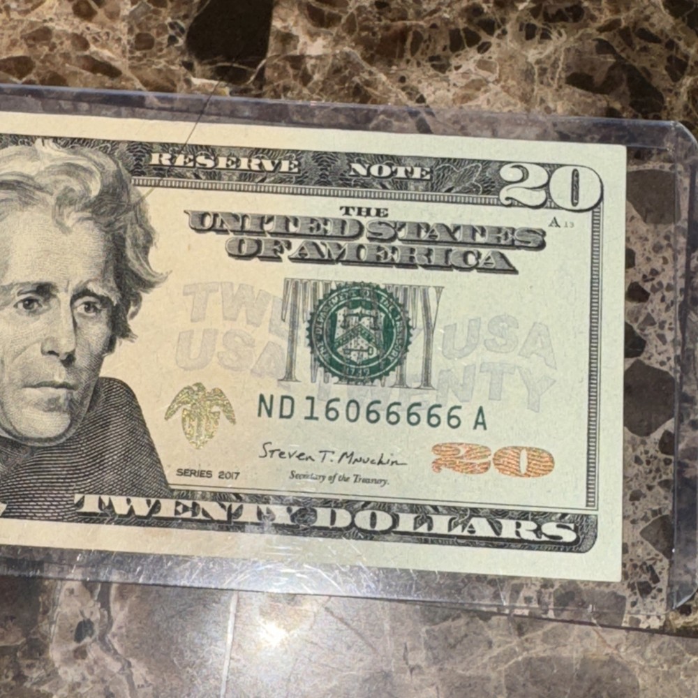 The product is a circulated $20 banknote from the United States, specifically issued in 2017. It features a rare serial number and has not been certified. This collectible item would be of interest to currency enthusiasts and collectors seeking unique pieces for their collection.