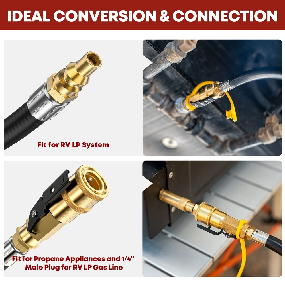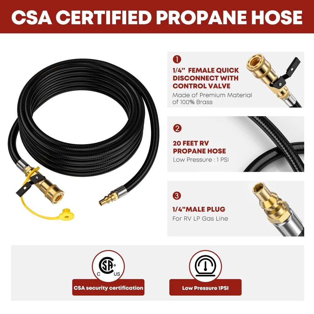Enhanced Quality & Construction - The low pressure RV Propane Hose Extension usually has a rather short service life as it is used frequently and widely. However, lengthens the lifespan of its quick connect propane hose by enhancing every product procedure from designs to QC, adopting 3-layer hose construction and choosing premium materials to make its propane quick connect hose excel in strength, durability, weather/tear/wear/leak resistance; Multipurpose & Effortless - Designed to connect RV to heater, camping stove, cooker, and grills. quick connect propane hose for RV to grill is equipped with standardized 1/4”Female Quick Connect Fitting with safety valve and 1/4”Male Full Flow Plug, which are accurately constructed from 100% premium brass to its compatibility and sturdiness; Convenient Length & Flexible Gas Line - RV propane hose is measured at 20 Feet, a perfect length to satisfy the need to transfer propane gas from rv lp gas system to your lp appliances at a great distance. Plus, the propane hose is fully tested and certified by CSA for 100% safety; All About Convenience & Money Saving - As the propane quick connect hose is an simple and easy tool to connect your rv to grill or other lp appliances, it is an ideal accessory you must bring on your trip. Not only will it SAVE YOUR MONEY wasting on 1lb propane tanks, but it also will deliver adequate flow and heat to your grill to prepare a nice meal for your family and friends; We Not Only Provide Propane Hoses - All propane hoses are under 1-Year . As we value every customer’s voice and experience with our products as well as with our service, we provide 24hrs/7days non-stop customer support to you. Pls feel free to us whenever you are concerned about the product or after-sales service.