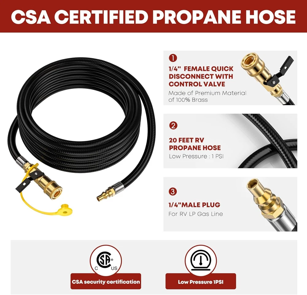 Store New Arrivals Add to Favorite View Feedback Contact 20 FT Quick Connect Propane Hose for RV to Grill, RV Propane Quick Connect Hose, Quick Disconnect Propane Hose Extension with 1/4"Safety Shutoff Valve for Grills, Griddles, Stove, Heater Description Batteries Required? No Color Black Brand GasXpert Material Brass Hose Length 20 Feet Item Weight 2.64 pounds Batteries Included? No Item Length 240 Inches Size 20 Feet Package Dimensions 9.33 x 8.9 x 3.07 inches Manufacturer GasXpert Enhanced Quality & Construction - The low pressure RV Propane Hose Extension usually has a rather short service life as it is used frequently and widely. However, GasXpert lengthens the lifespan of its quick connect propane hose by enhancing every product procedure from designs to QC, adopting 3-layer hose construction and choosing premium materials to make its propane quick connect hose excel in strength, durability, weather/tear/wear/leak resistance; Multipurpose & Effortless - Designed to connect RV to heater, camping stove, cooker, and grills. GasXpert quick connect propane hose for RV to grill is equipped with standardized 1/4”Female Quick Connect Fitting with safety valve and 1/4”Male Full Flow Plug, which are accurately constructed from 100% premium brass to guarantee its compatibility and sturdiness; Convenient Length & Flexible Gas Line - GasXpert RV propane hose is measured at 20 Feet, a perfect length to satisfy the need to transfer propane gas from rv lp gas system to your lp appliances at a great distance. Plus, the propane hose is fully tested and certified by CSA for 100% safety; All About Convenience & Money Saving - As the GasXpert propane quick connect hose is an simple and easy tool to connect your rv to grill or other lp appliances, it is an ideal accessory you must bring on your trip. Not only will it SAVE YOUR MONEY wasting on 1lb propane tanks, but it also will deliver adequate flow and heat to your grill to prepare a nice meal for your family and friends; We Not Only Provide Propane Hoses - All GasXpert propane hoses are under 1-Year Warranty. As we value every customer’s voice and experience with our products as well as with our service, we provide 24hrs/7days non-stop customer support to you. Pls feel free to contact us whenever you are concerned about the product or after-sales service. Product Description ABOUT US We offer the best prices around on high quality products. Our E-store includes media such as books, movies, music and games while offering electronics, toys, sporting apparel, clothing, tools, general home, garden items and more. SHIPPING We are always working hard to ensure your package arrives as soon as possible. Please understand that some factors like weather, high postal traffic, and the performance of shipping companies are outside of our control. We offer free shipping to the lower 48 states and ship within 2 business days of payment, usually sooner. We do not accept P.O. Boxes. Please provide a physical address. RETURNS We offer a 30-Day Return Policy on items which you are not completely satisfied with. You have the option for a full-refund or an exchange of the item. No returns are available on items shipped outside of the USA. PAYMENT We accept PayPal. CONTACT US This page content is yet to come Please ad us to your favorite seller and visit again later Thank You CUSTOMER SATISFACTION We try our very best to make sure every customer is completely satisfied. If there's a problem, message us! We're happy to help.
