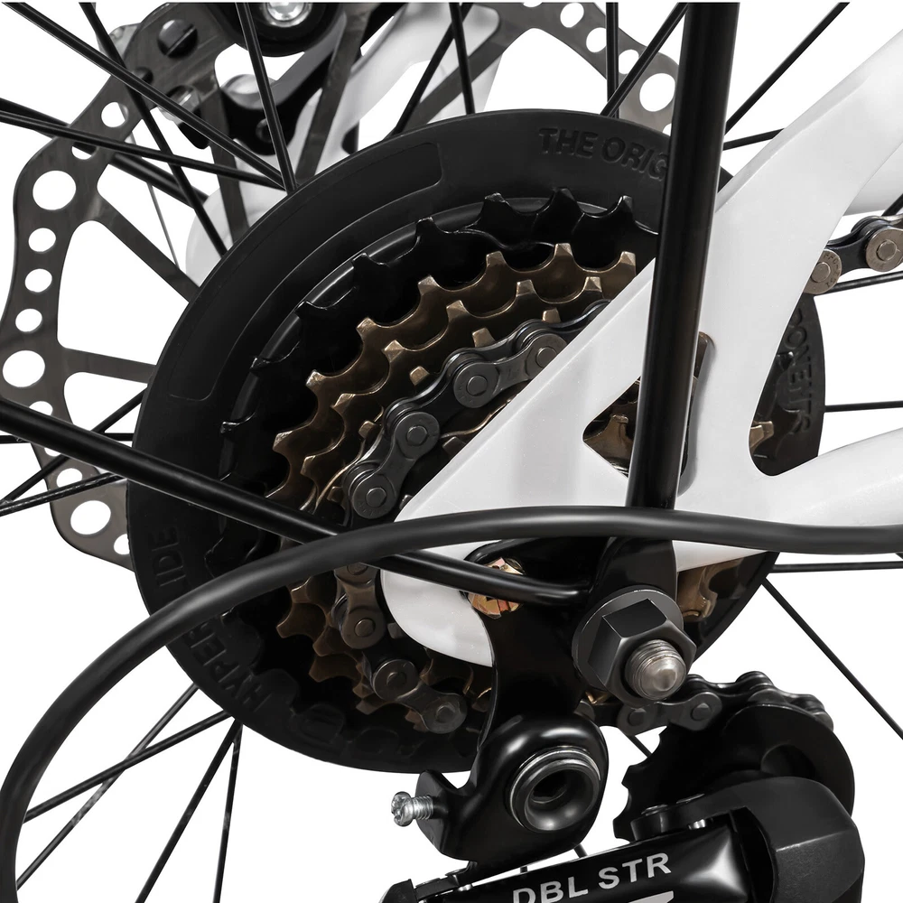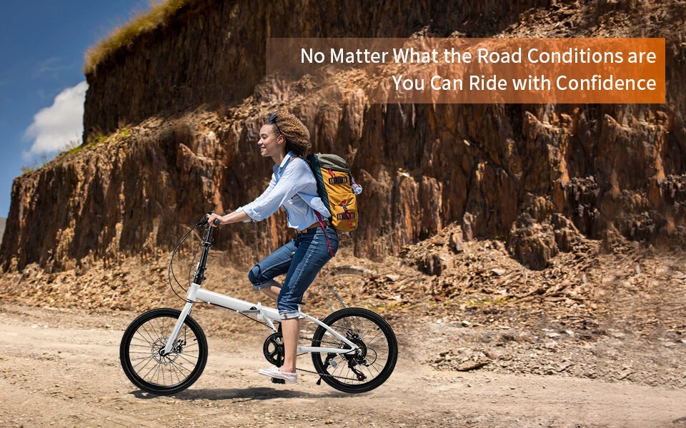 20" Folding Mountain Bike 7 Speed Bicycle Full Suspension MTB Bike Steel White Folding Bike Foldable Bicycle with 7 Speed Gears 20-inch Wheels Easy Folding City Bicycle with Disc Brake Description If you are a cycling enthusiast or want to improve your biking skills, then this 20-inch folding bike is an ideal choice for you whether it's for daily commuting or travel. Front and rear disc brakes provide stable speed control and improve safety. The 7-gear transmission is convenient for you to fight against different road conditions. What are you waiting for? Let it take you to enjoy the fun and freedom of biking. Key Features Smooth Ride : The 7-gear transmission allows you to select the right speed according to the road conditions and your physical strength by turning the handle, making the ride more effortless. 7 levels of flywheel positioning teeth enable flexible gear changes and are less likely to drop the chain. Versatile Look : The modern black and white color scheme and classic design will not go out of style, showing your understated personality and getting a wider range of usage scenarios. Comfortable Ride : The low-span body makes it easy to get on the bike. The PU foam cushion is breathable and soft to relieve riding fatigue and provide a comfortable riding experience. High-quality Material : The frame is made of aluminum alloy with three layers of electrostatic spraying process, so it is strong, wear-resistant, anti-rust, and anti-corrosion, providing support for its high quality and stability (176lbs). Foldable Design : The quick-release buckle allows you to achieve easy folding and storage without taking up too much space. You can easily store it in the trunk, apartment, or subway for a free ride anywhere. Safe Riding : Front and rear disc brakes provide stable speed control on downhill grades, promoting consistent and responsive braking action for your safety. The reflective strip of the pedal allows you to ride with peace of mind even in the dark. Adjustable Height : Adjustable seat height (23.6-36.6inch) and elevable handlebars (35.4-41inch) easily accommodate people of different heights or different riding habits. Wonderful Gift : This 20-inch mountain bike is an ideal gift on birthdays, Christmas, Thanksgiving, graduation, etc. for loved ones and friends who love to ride. Details 20-inch Tires : The anti-slip texture of the 20-inch tire easily provides extra grip and stability on the road or trails, allowing you to ride with more confidence. Comfortable Non-slip Handlebars : The bike's handlebars are covered with rubber and the convex anti-slip pattern gives you easier directional control. Protective Pedals: The rough surface of the pedals creates friction when riding and makes it less likely to slip to improve cycling safety. Application It is suitable for traveling, exercising, commuting, and crossing the country on gravel roads, highways, and sand roads. It is suitable for people who weigh no more than 176 lbs and are taller than 59 inches to ride. How to Fold 1. Remove the seat lever. 2. Fold the handlebar lever. 3. Open the quick release buckle. 4. Fold the body. Specification Frame Material: Aluminum Alloy Seat Material: PU, PU Foam Material of Handlebar Rod&Seat Rod: Iron Handlebar Material: High Carbon Steel Handlebar Cover Material: Rubber Color: White, Black Surface Treatment: Three Layers of Electrostatic Spraying Number of Speeds: 7 Special Feature: Foldable Age Range (Description): Adult, Teenager Load-bearing Capacity: 80kg/176lbs Recommended User Height: Above 150cm/59inch Suspension Type: Dual Disc Brakes Total Length: 155cm/61inch Seat Distance From the Ground: 60-93cm/23.6-36.6inch Handlebar Distance From the Ground: 90-105cm/35.4-41inch Tire Diameter: 50.8cm/20in Pedal Size: 10*7cm/3.9*2.8inch Seat Size: 17*23cm/6.7*9inch Handlebar Grip Distance: 25cm/9.8inch Product Size (After Folding): 40*80*57cm/15.7*31.5*22.4inch Package Size: 86*67*36cm/33.8*26.4*14inch Gross Weight: 14.7kg/32.4lbs Net Weight: 11.95kg/26.3lbs Package Included 1*20-inch Folding Bike Other Tools for Installation Notes Please allow the slight color difference caused by the shooting light and 1-3cm error due to manual measurement, and make sure you do not mind before you place the order.