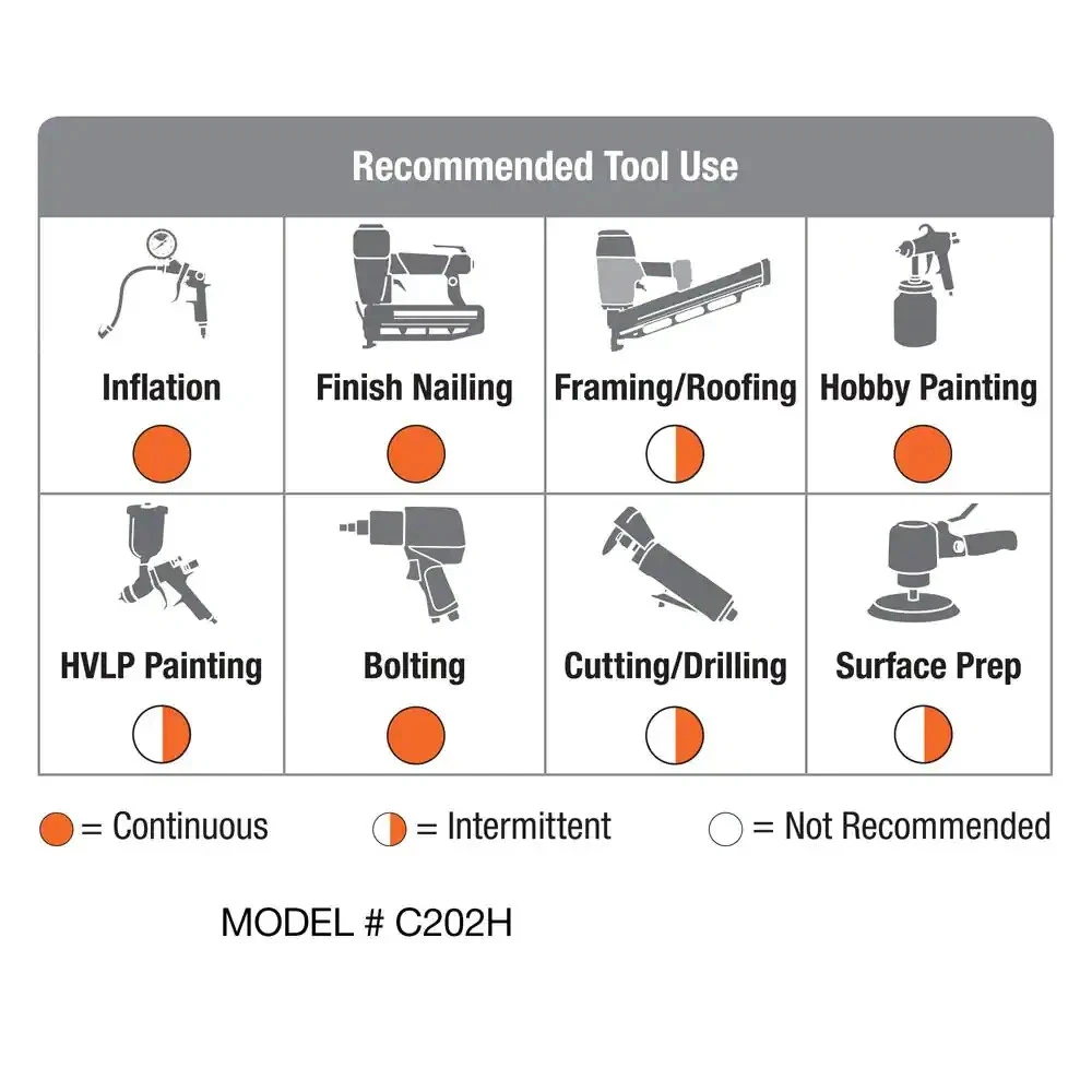 Item Description From Seller 20 Gal. 200 Psi Oil Free Portable Vertical Electric Air Compressor 35% Longer Air Tool Runtime vs. 20 gallon 175 PSI compressors 36% Faster Recovery Time vs. 20 gallon 175 PSI compressors 57% Quieter compared to 20 gallon 175 PSI compressors The Husky 20 Gal. oil free air compressor is industry leading with high performance technology. This Husky 20 Gal. portable vertical air compressor with 200 maximum psi provides 35% longer air tool run time compared to typical 20 Gal. compressors with 175 maximum psi . At 81 dBA, the oil free pump brings less noise to your work environment and has a 57% sound improvement versus typical 20 Gal. compressors with 175 maximum psi. The high efficiency motor allows for easier cold weather start as low as -20° F (-29° C) and extension cord application up to 400 ft. of extension cord. The Husky 20 Gal. 200 PSI air compressor is perfect for light automotive tasks, agricultural equipment repairs and intermittent use for metal working applications. 200 maximum psi for 35% longer air tool run times compared to typical 20 Gal. compressor with 175 maximum psi 200 maximum psi for 36% faster recovery time compared to typical 20 Gal. compressor with 175 maximum psi With a decibel rating of 81 dBA, this compressor brings less noise to your work environment with a 57% sound improvement versus typical 20 Gal. compressors with 175 maximum psi Cold weather start as low as -20° F (-29° C) allows for easier start in colder temperatures Able to operate up to 400 ft. of extension cord 7 in. wheels for shop or garage portability Slim vertical design has a smaller footprint and takes up less space in your shop or garage Perfect for all inflation, finish nailing/stapling, hobby painting, bolting/fastening, and cutting/drilling and surface prep Oil free pump allows for hobby spray painting without the need for oil separators in the air system
