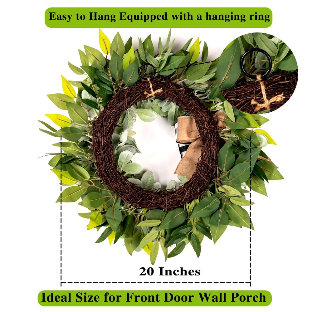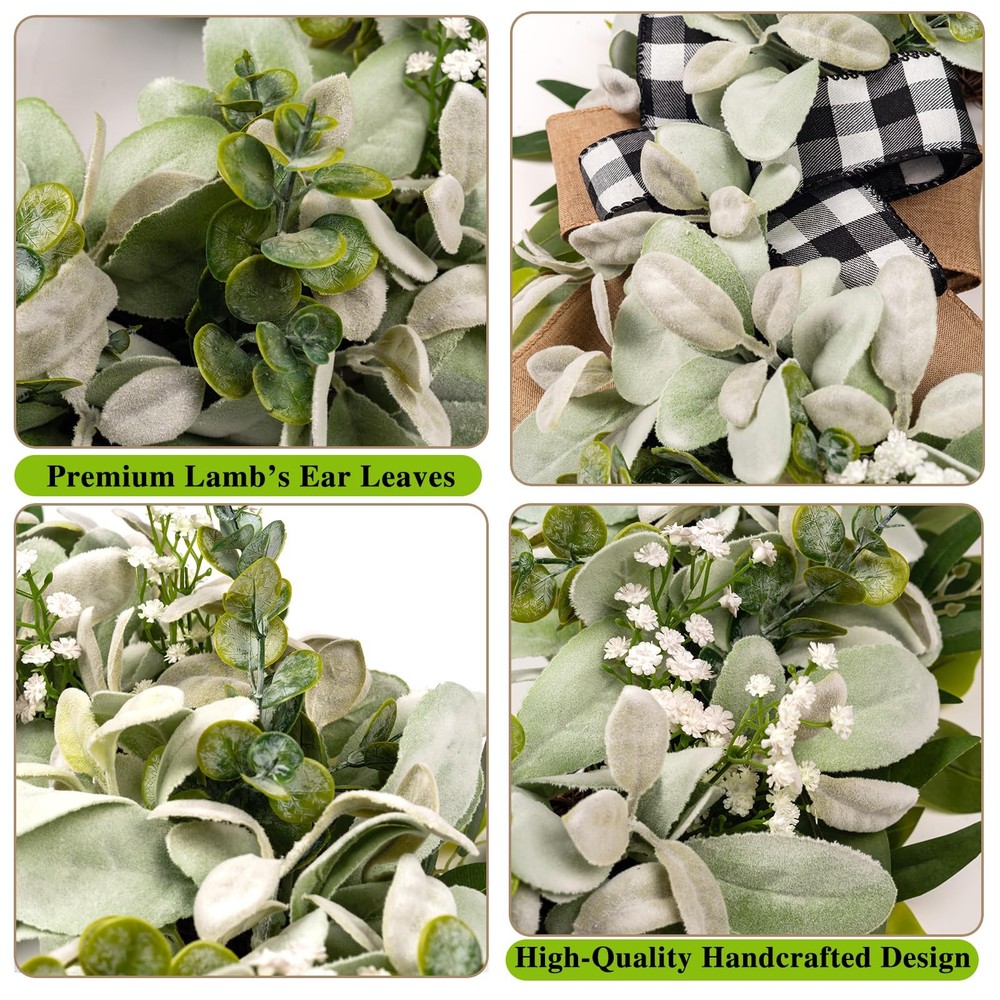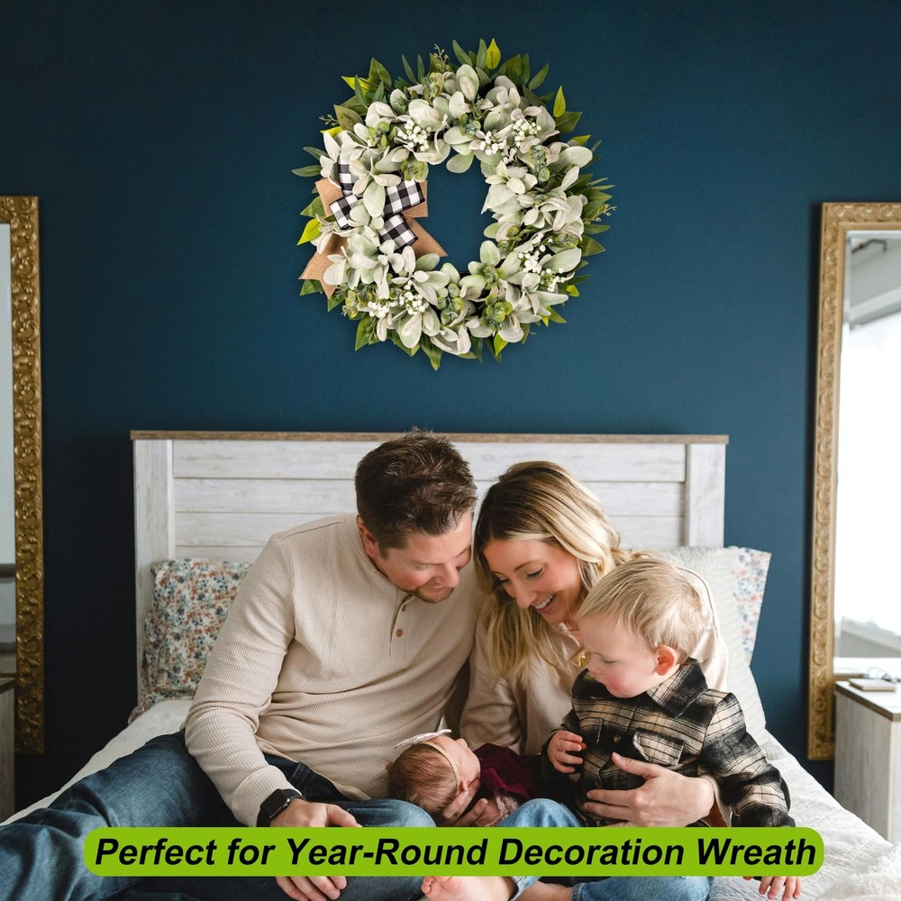 Transform your home with this stunning lamb's ear wreath designed for year-round elegance. Featuring soft lamb's ear leaves, eucalyptus sprigs, baby’s breath, and a charming burlap bow, this artificial wreath adds a touch of farmhouse charm to any space. Perfect for front door decor, it also works beautifully on walls, windows, or porches. Crafted with high-quality materials, this wreath for front door is both durable and weather-resistant, ensuring its vibrant beauty lasts throughout the seasons. Whether you’re looking for a spring wreath, summer wreath, or a versatile wreath for all seasons, this design complements a variety of home styles. Packaged in a premium gift box, it makes a delightful gift for friends and family. Elevate your front door decor today with this timeless farmhouse wreath! Wreaths for Front Door Year Round:This farmhouse-inspired lamb's ear wreath features lush greenery, eucalyptus, baby’s breath, and a rustic burlap bow, creating a timeless and natural look Lambs Ear Front Door Wreath:Perfect for front door décor, walls, windows, or porches, this wreath for all seasons enhances your home through spring, summer, fall, and winter Artificial Farmhouse Wreaths with Bow: Crafted with high-quality artificial materials, this durable and weather-resistant wreath adds a welcoming touch to farmhouse, rustic, or modern homes, indoors or outdoors Spring Summer Wreath for Home Decor:Arrives in a beautifully designed gift box, making it a thoughtful present for housewarmings, Mother’s Day, birthdays, anniversaries, or any celebration Door Wreaths for Front Door Outside: This wreath measures approximately 20 inches and has been securely packed to prevent any damage during shipping. Upon receiving, you can easily fluff and expand the wreath to achieve the best possible look