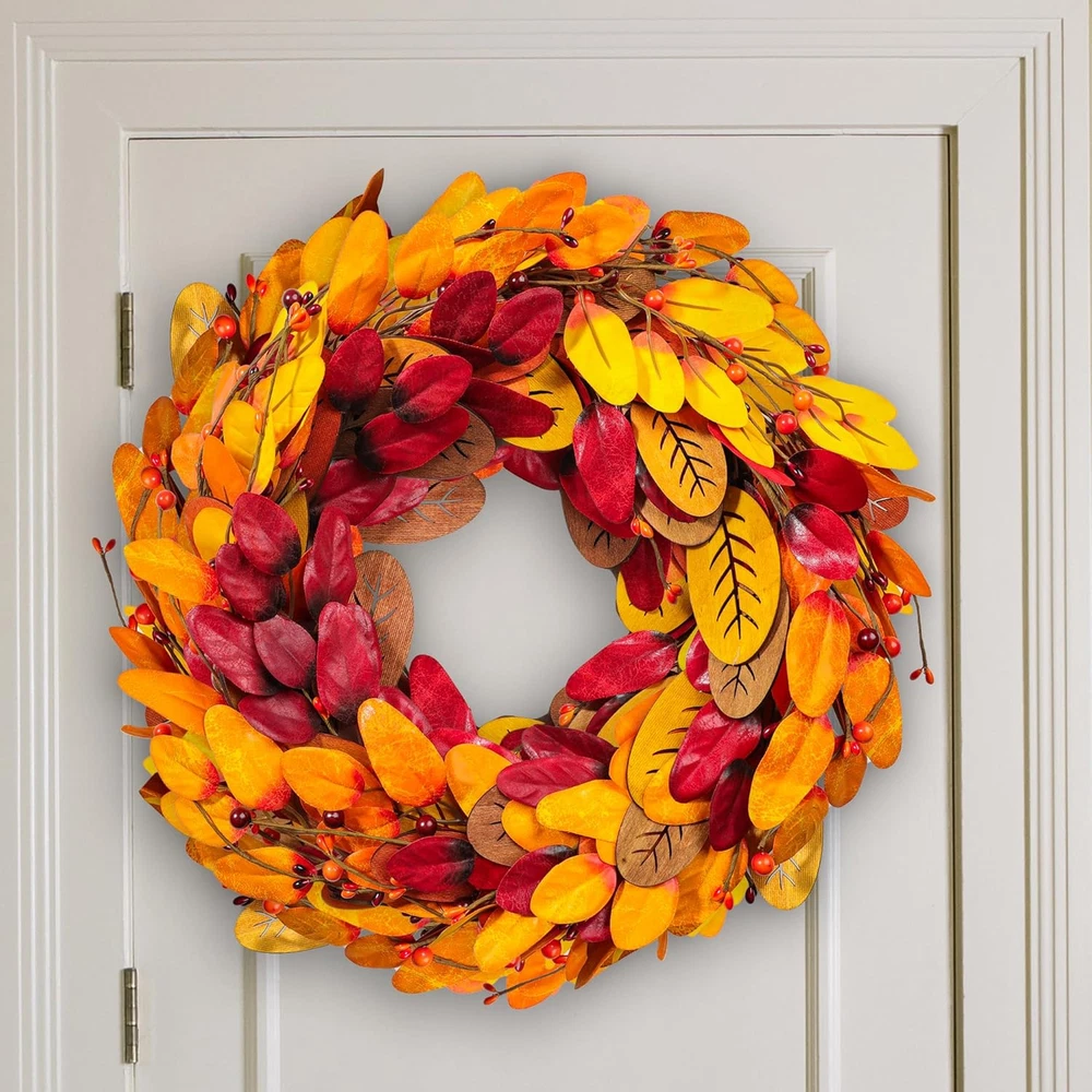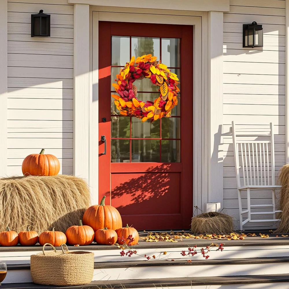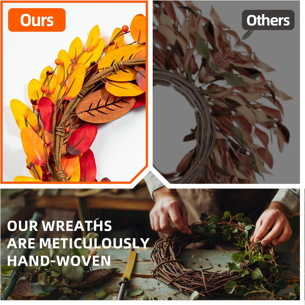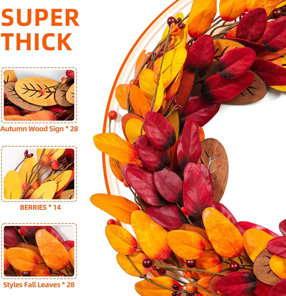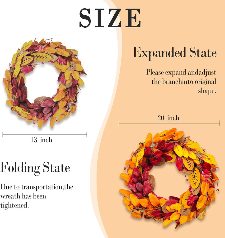 【Artificial Fall Wreath】: Get ready to be amazed by the richness and beauty of this fall wreath! Except there's a welcome wooden sign, our autumn wreath consists of masses of plump berries & maple leaf & Pine Cones. Vivid and full, this fall wreath can bring a strong autumn atmosphere to your home. 【High-Quality】: As a high-quality wreath, this autumn wreath is carefully arranged by professional florists, and the entire production process is completely handmade. Each detail is meticulously designed to provide a lifelike touch, from the intricate textures to the rich accessories that adorn it. With a visually striking appearance, this fall wreath is a true masterpiece that will elevate your autumn decor to new heights. 【Perfect Size】The harvest wreath is 20 inches For safe shipping and instant storage, we package it in a small hardbox. As an adjustable fall wreath,you can bend the branches of it to achieve the desired effect and fully unfold it to reach its actual size you'll have a beautiful fall wreath! 【Versatile Decor】This autumn wreath measures 20 inch/45 cm. Front door, indoor, outdoor, wall, window, fireplace or above the Mantel in your home as a warm inviting welcome sign to your family and friends, which is durable and always maintains vitality. Compared to real flowers, our autumn wreath will give you longer companionship and lasting happiness. 【Autumn Vibe】This amazing flower wreath could be used during autumn Harvest Day and Thanksgiving Day to add a little holiday touch and warmth to your home. Eye-catching design makes your decorations stand out in the neighborhood, If you have any questions about our products, please feel free to and we will definitely give you a perfect answer. Product Description 20" Fall Wreath Fall harvest wreath, halloween wreath, fall decoration, thanksgiving decoration. Rich Autumn Vibe With a visually striking appearance, this fall wreath is a true masterpiece that will elevate your autumn decor to new heights. Wide Range of Uses No assemble needed. Easy to hang on wall, front door, fireplace, a living room mantel, porch, window,etc.