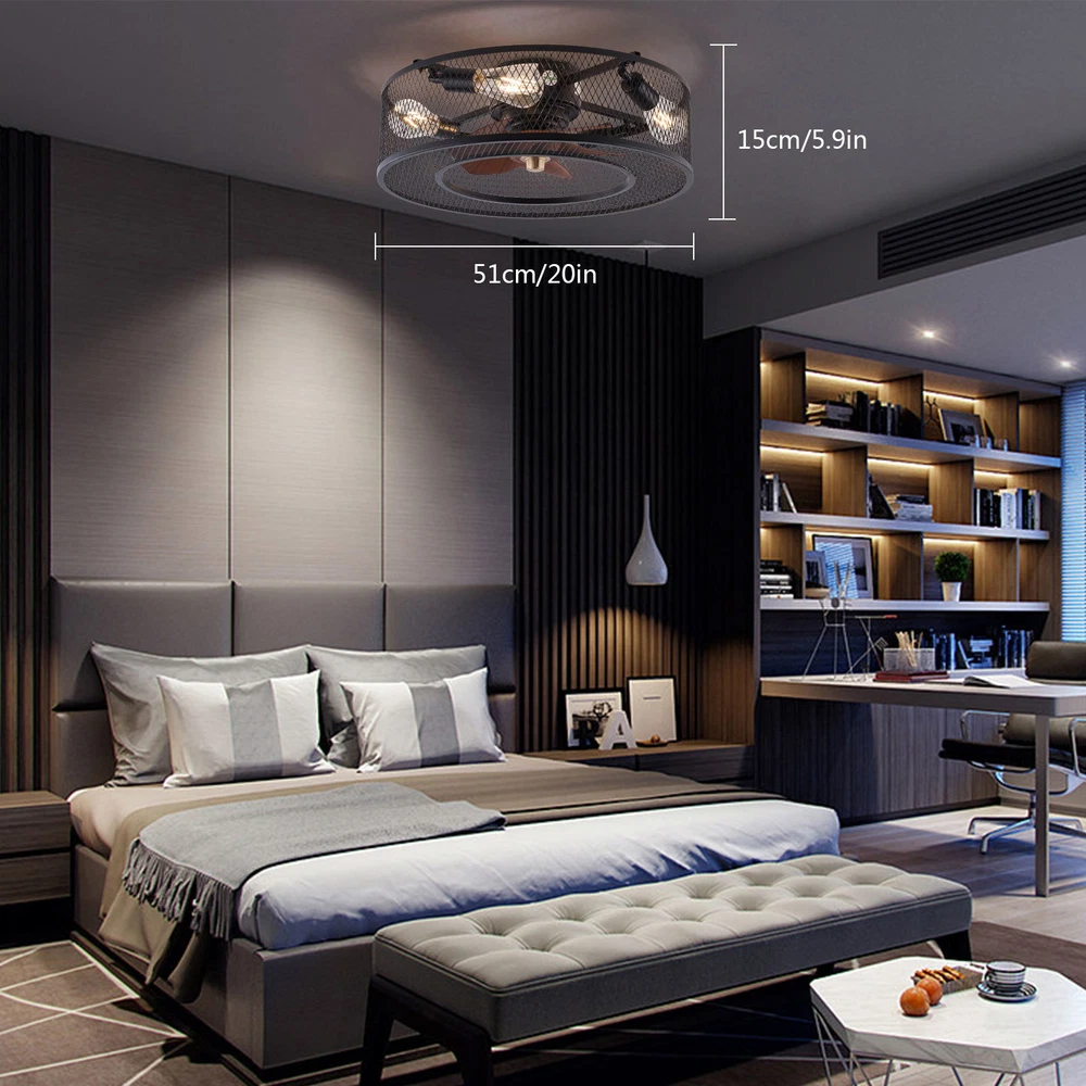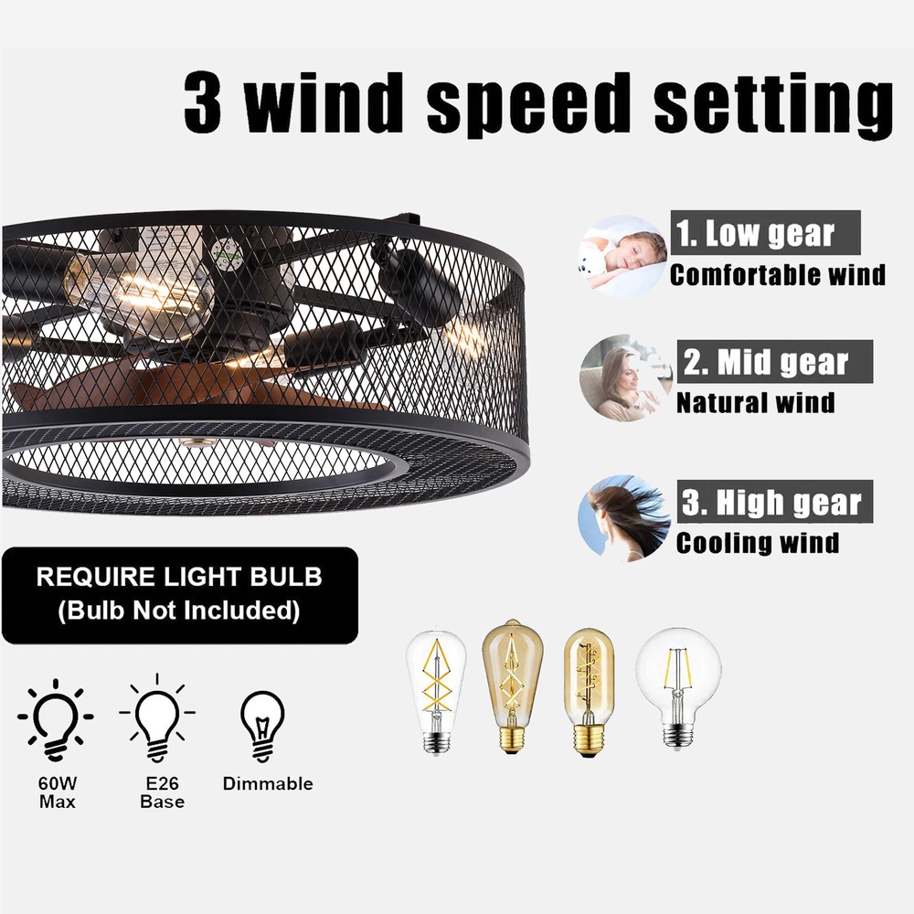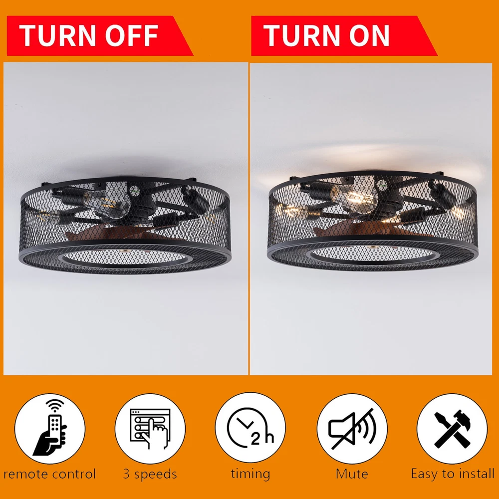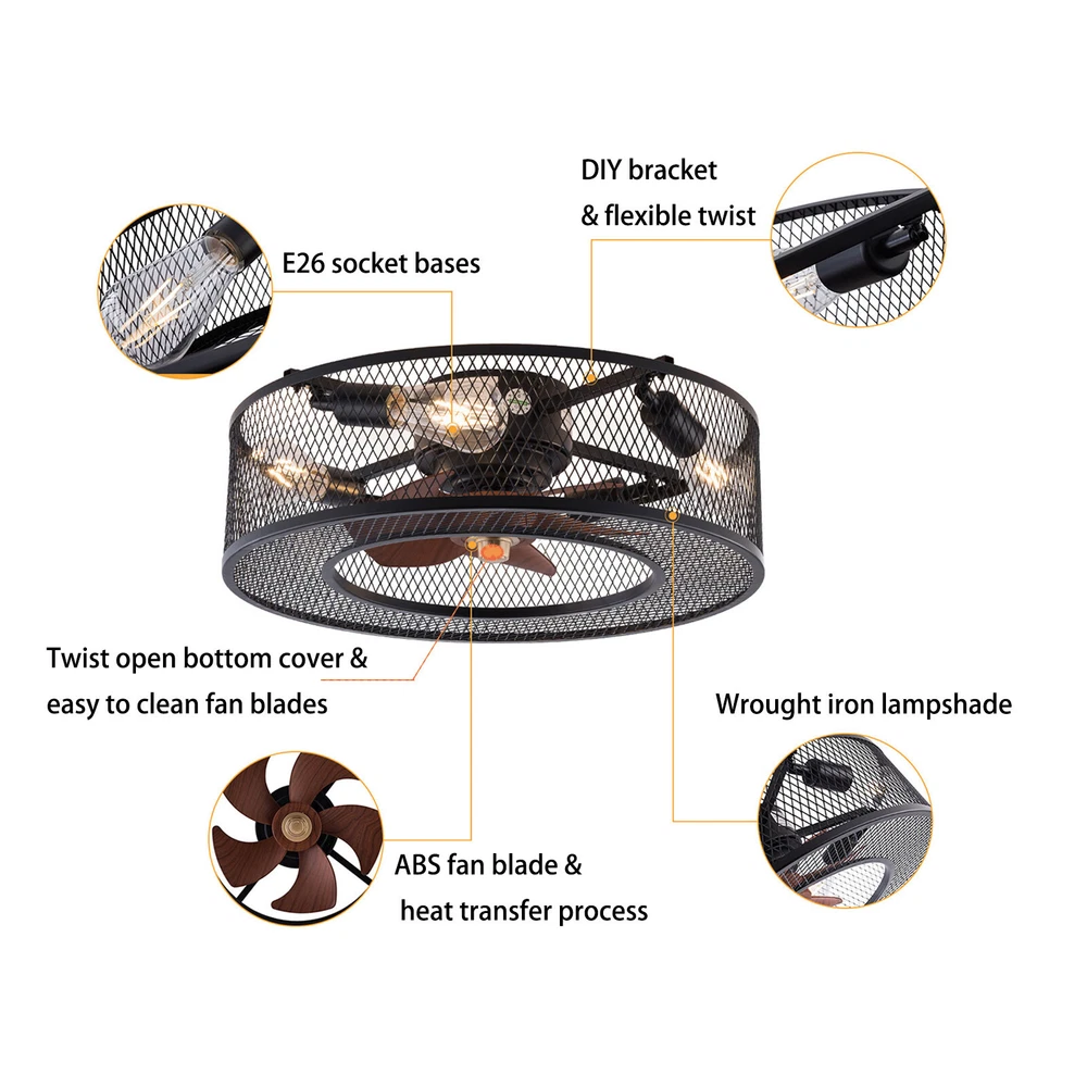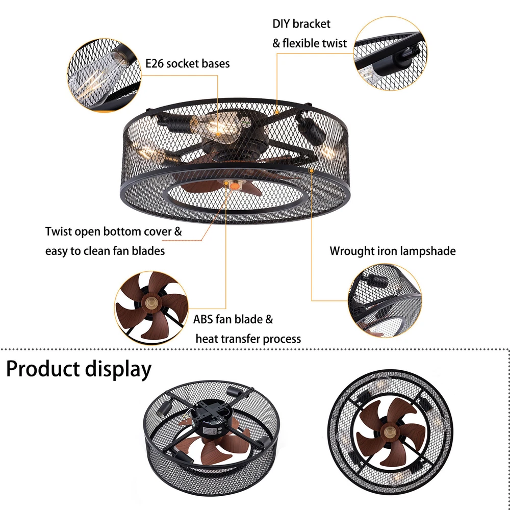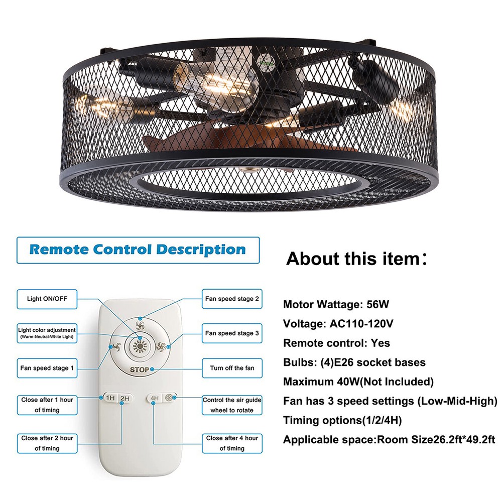 20 Inch Ceiling Fan Light Fanlamp Chandelier Flush Mount Fandelier & Remote Description Caged Ceiling Fan with Light Remove Control with 5 Bulbs, 20 ‘’ Rustic Low Profile Flush Mount Ceiling Fan Light, Enclosed Industrial Ceiling Fan Light for Bedroom Living Room Farmhouse About this item 【Unique and safe novel design】metal shade,Unique to say the least, thecomposition of cage ceiling fan is quite striking, combining modernity and elegance in one. The exterior bird cage lampshade a stylish theme while protecting the light bulb and the central fan blade. It's perfect for a loft or office space, hang in your eating area and enjoy the cool breeze. Light & Fan—This ceiling fan with is designed for who need marvelous update for your house. Suit for ceiling from 7.5-11.5 feet, and room from 8-15㎡like children room, bedroom, kitchen island or dinning room。 Easy to install: hard wire. perfect design to illuminate your space, whether it is a kitchen island, dining room, bedroom, foyer or any other place. 【Remote Control】: The Industrial ceiling fan lights fixture with 3-speed adjustment (low/medium/high) and 3 fan timing options (1/2/4H) sleep shutdown about multi-function remote control. The fan and lights can be controlled separately, which can control your ceiling fan quickly and easily!(max distance of 20 meters) 3 Gear Wind—The enclosed ceiling fan speed vary from soft to cool, match daily needs; ABS fan blades, durable, lightweight and easy to clean. Timing Function—Smart timing set to automatically POWER OFF light and fan after you fall asleep。 Mute Motor—Indoor/Outdoor ceiling fan is equipped with a whisper wind motor which makes no noise, stay away from any noise interference while providing a quiet and comfortable environment ✦Dimensions Fixture Height:5.9" (15cm) Fixture Width: 20" (51cm) ✦Bulb Information Bulb requirements: use (4) E26bulbs, maximum 40watts, options include incandescent, fluorescent, LED, halogen, etc. (bulbs are not included) Wattage: Max 40W Voltage: AC110-120V Remote control: yes ✦Material and Colour Material: metal+ABS Easy to install: surface mounted. Products include English manuals, remote control and installation instructions, with the provided bracket, providing easier installation and detailed installation instructions. Applicable scenarios: The chandelier is suitable for home and commercial spaces,such as living room, dining room, kitchen island, bedroom, foyer, farmhouse , bar, restaurant, gallery, exhibition room, hotel, coffee shop, office。 Package Included 1 *Fan Light (Bulbs Not Included) 1 * Accessories package 1 * User Manual ✦Suggestion: 1. For a safe and secure installation, please ensure that the electrical box to which this fixture will be mounted is properly attached to a structural member of the building. 2. All wires are connected. When unpacking, be careful not to pull with wires as a bad connection may result. 3. Do not connect electricity until your fixture is fully assembled. Payment Delivery details Terms of sales About us Contact us Payment We accept ebay payment 。 Fees such as import duties, taxes are not included in the item price or shipping costs. These charges are the buyer's responsibility. Delivery details Shipping: 2-9 working days to: USA Terms of sales We maintain high standards of excellence and strive for hundred percent customer satisfaction. Feedback is very important to us. We hope that you contact us immediately before you give neutral or negative feedback, so that we can address your concerns. It is impossible to address issues if we do not know about them! About us Your satis faction is our ultimate goal. We work hard to earn your trust and future business. Our certified technicians have tested each item before shipping. The unit comes with 1 year limited warranty on all manufacturing defects. a) If you receive a defective item, you may return it or ask for a discount. Please contact us within 14 days after you receive the package. b) What you returned must be intact and in its original packaging as re? u. Customer is responsible for shipping costs of the returned item. c) We will cover the cost of shipping back t with the shipping rate indicated in the registration page. We will send you a new unit or refund the full payment you paid. Thank you. Contact us Business Hour Business Hour: Monday To Friday: 8:30 AM to 5:00 PM (Beijing China time) Due to time zones, our reply to your questions may not be immediately. But within above working time, we will reply your email within 24 hours. If it's non-workdays, please kindly be patient and wait till Monday. Please contact us with ebay message. Please feel free to contact us if you have any questions. Monday To Friday: 8:30 AM to 5:00 PM (Beijing China time) Due to time zones, our reply to your questions may not be immediately. But within above working time, we will reply your email within 24 hours. If it's non-workdays, please kindly be patient and wait till Monday. Please contact us with ebay message. Please feel free to contact us if you have any questions. On Jan 6, 2025 at 22:23:05 PST, seller added the following information: