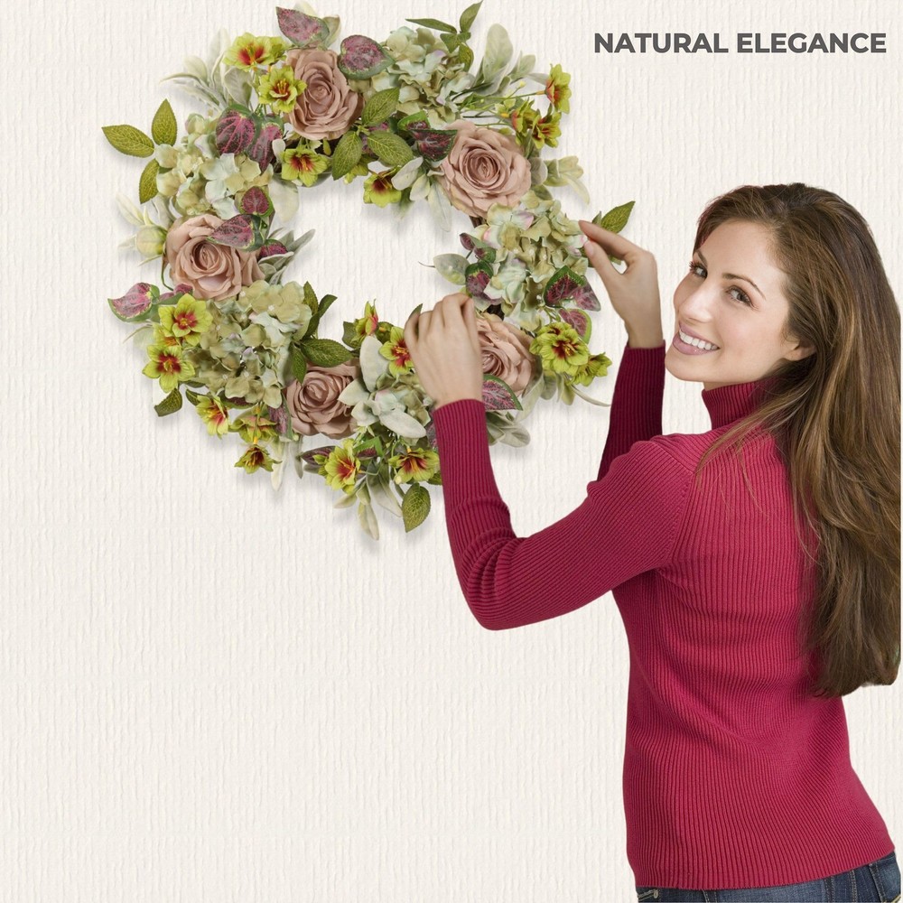 Welcome the beauty of spring & summer with our handcrafted 20-inch floral wreath! Featuring realistic hydrangeas, roses, and lush greenery, this elegant artificial wreath is the perfect addition to your front door, mantel, or indoor & outdoor décor. Whether you want to refresh your home’s entrance or create a warm, inviting atmosphere, this seasonal wreath is the perfect choice. Why Choose Our Floral Wreath? ✔ Lifelike & Handcrafted – Designed with premium artificial flowers & greenery, ensuring a full, lush appearance that lasts year after year. ✔ Versatile for Any Space – Ideal for your front door, entryway, living room, or even as a wedding wreath. ✔ Seasonal Charm – A timeless decoration for Mother’s Day, Easter, summer parties, and rustic farmhouse themes. ✔ Easy to Maintain – No need for watering or special care – just effortless elegance! Perfect for Gifting & Decorating Surprise your loved ones with this stunning summer floral wreath—a thoughtful gift for housewarmings, holidays, and special occasions Lush Spring & Summer Wreath Adorned with vibrant hydrangeas, elegant roses, and lush greenery, this 20-inch floral wreath brings a fresh and charming touch to your front door, window, or wall decor. Perfect for spring, summer, and seasonal home décor Handcrafted Realistic Design – Made with high-quality artificial flowers and lifelike foliage, this farmhouse-style wreath features delicate textures and intricate details, creating an inviting atmosphere for any modern farmhouse or rustic home Versatile Indoor & Outdoor Use – Whether for your front door, entryway, mantel, or living room, this durable outdoor wreath withstands various weather conditions while maintaining its beauty all season long. Ideal for Mother’s Day, Easter, weddings, and housewarming gifts. Perfect Gift & Seasonal Accent – Looking for a stunning gift idea? This rustic yet elegant greenery wreath makes a thoughtful present for loved ones on special occasions, complementing spring and summer home decor with a touch of natural charm Easy Maintenance & Long-Lasting – Unlike real flowers, this artificial floral wreath stays fresh and vibrant all year round. No watering, no wilting – just effortless beauty! Hang it directly or enhance it with LED lights for a cozy ambiance.